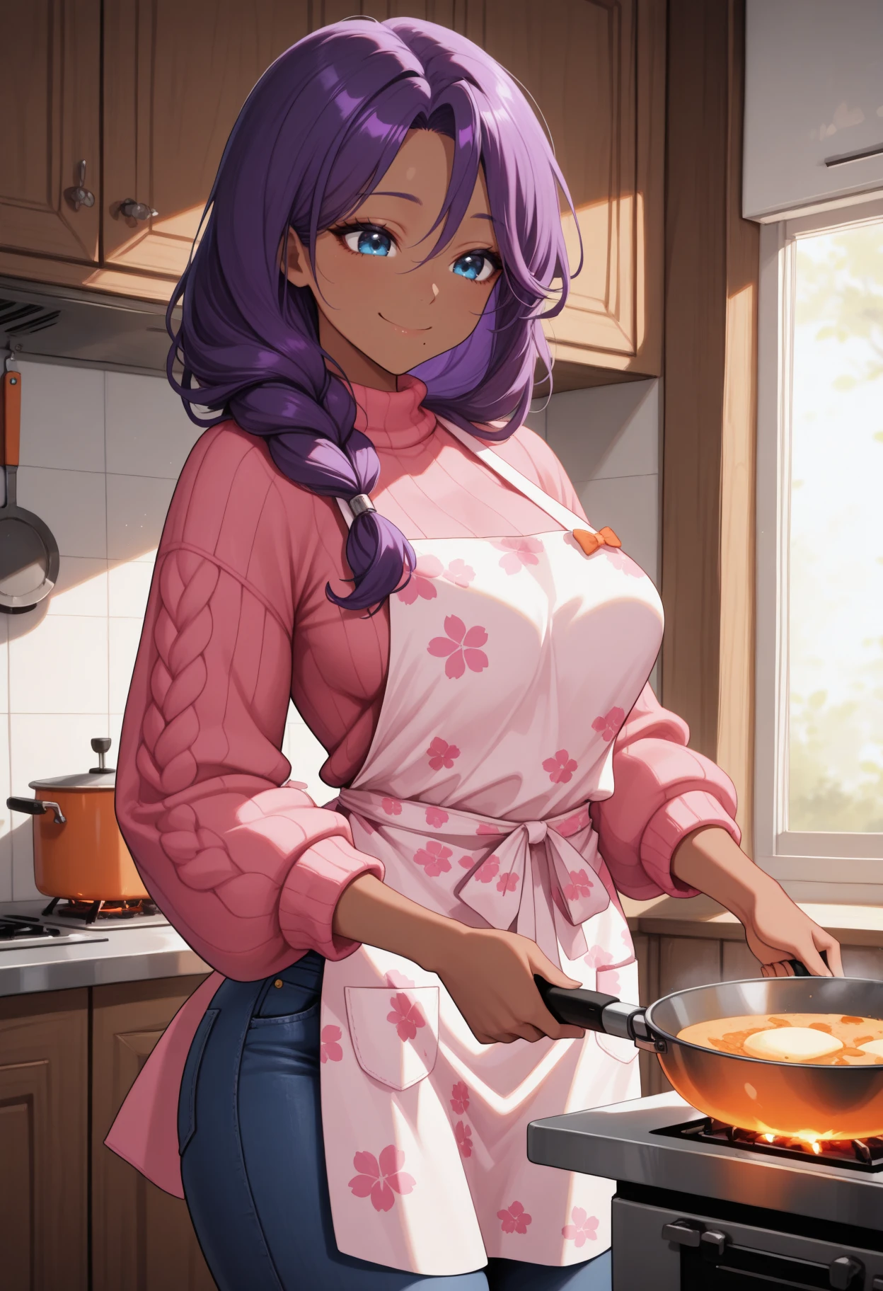 vm0m, blue eyes, mole under mouth, purple hair, long hair, braided ponytail, hair over shoulder, dark skin, earrings, pearl necklace, grey sweater, open-chest sweater, blue skirtDefault outfit V2: