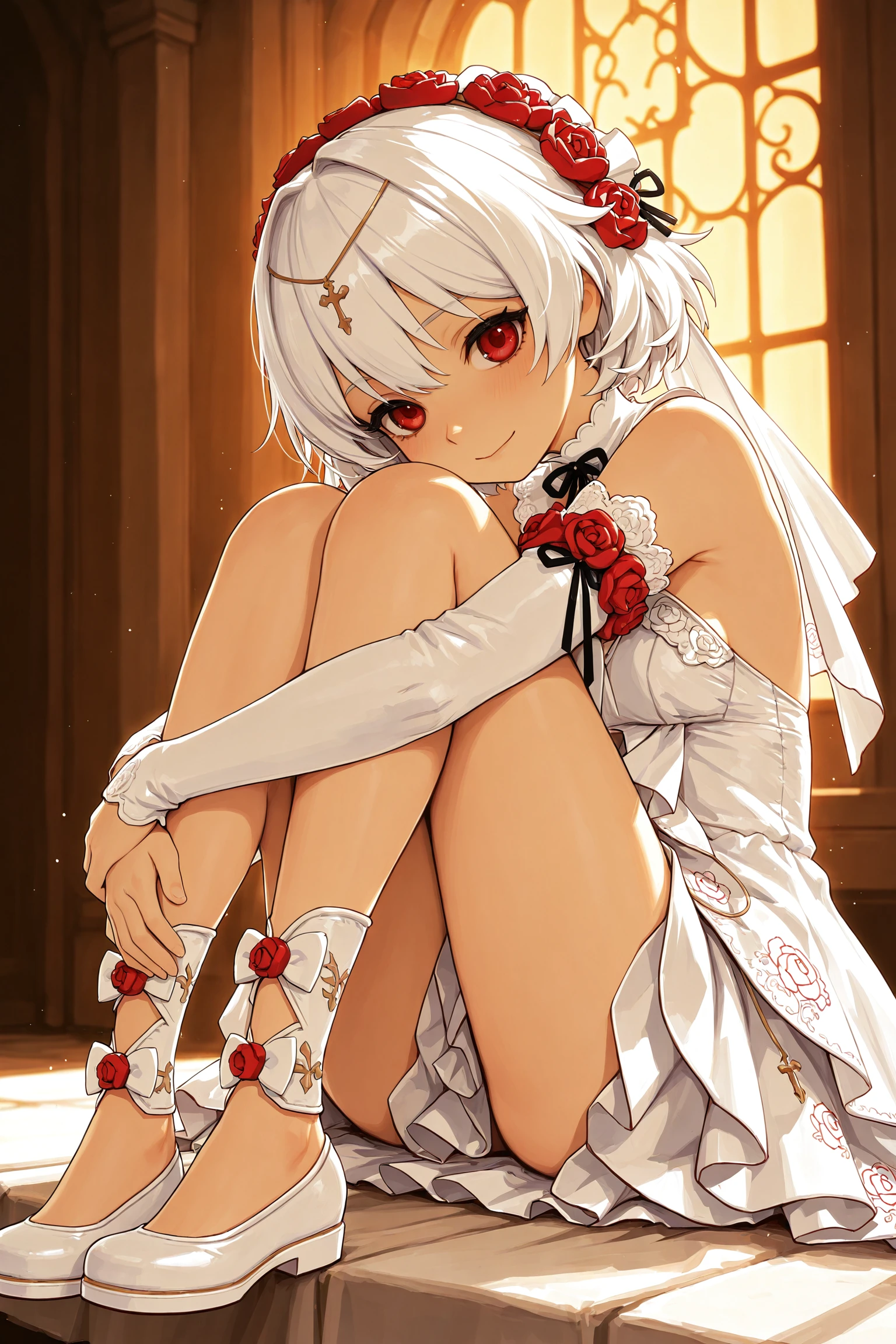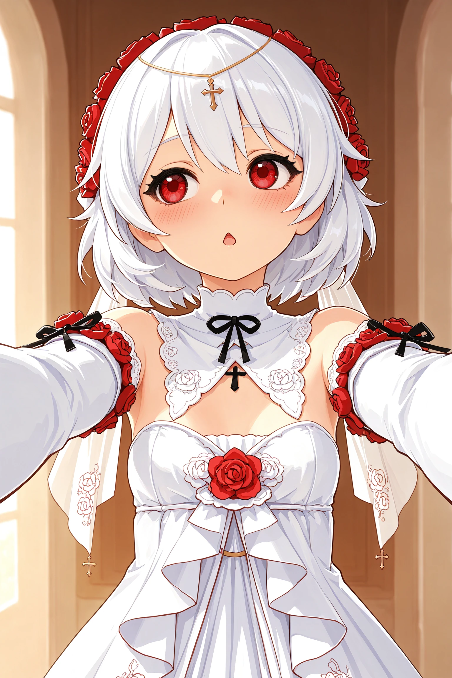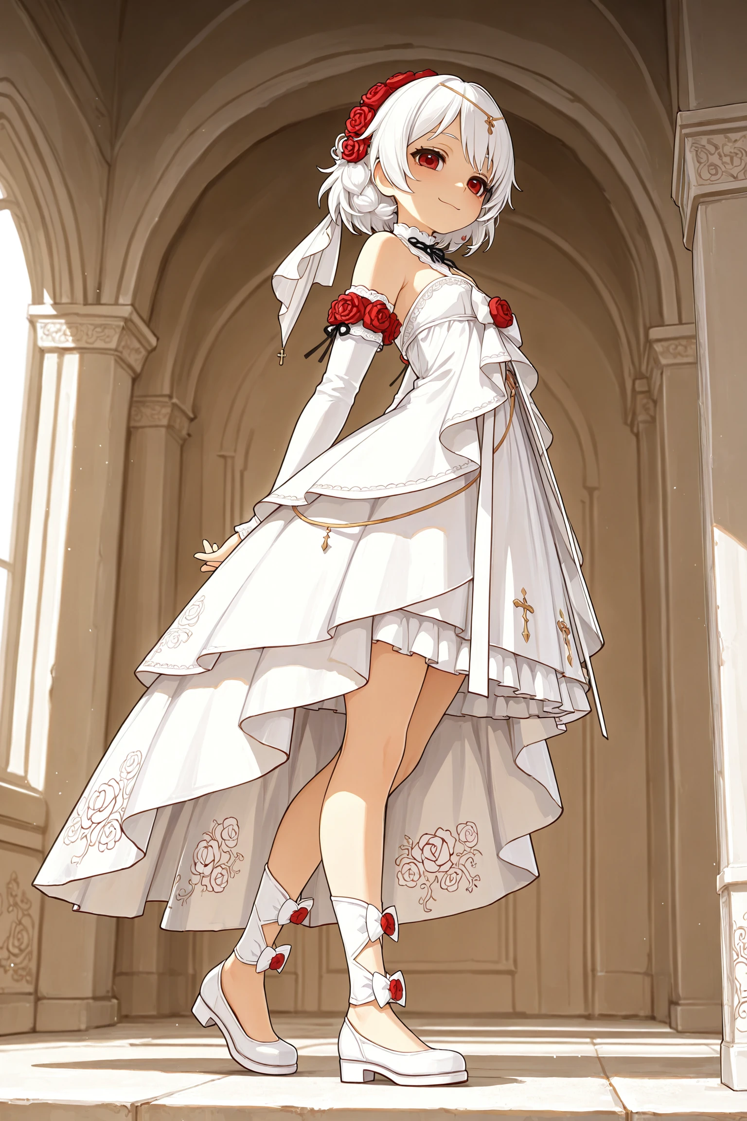 rosy bridesmaid,red eyes,white hair,short hair,hair ornament,veil,white dress,detached sleeves,ankle bow,white footwear,