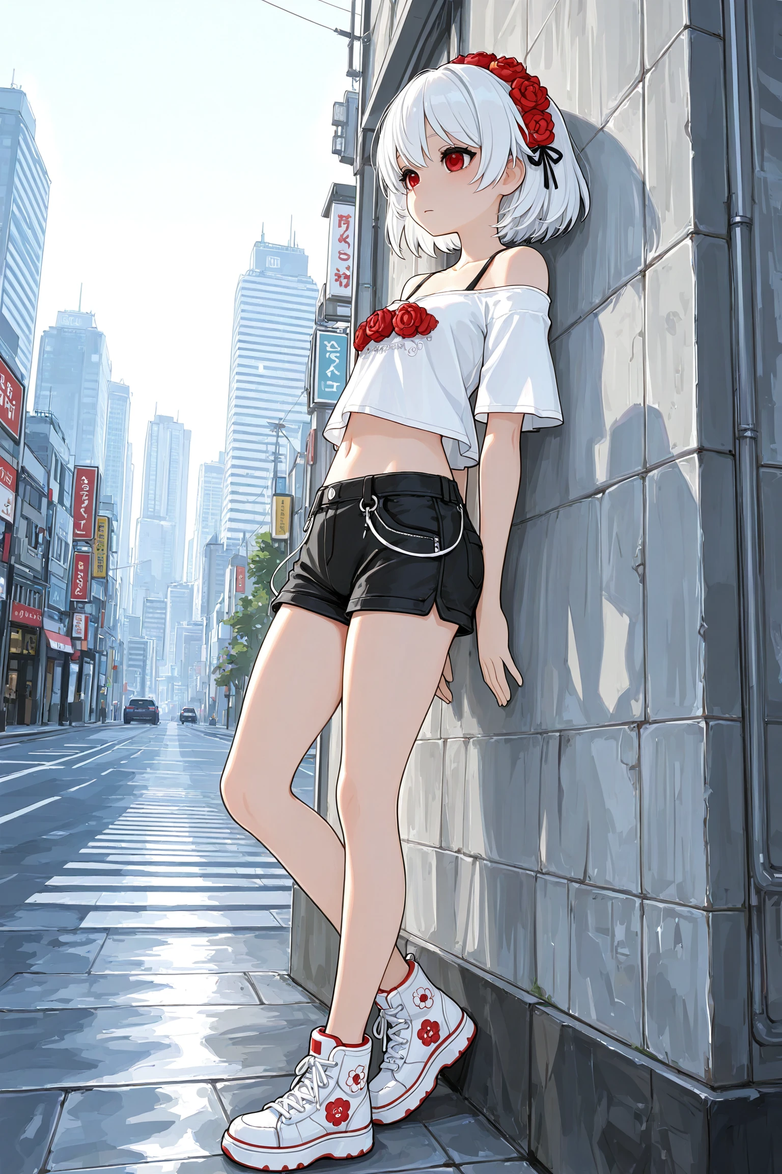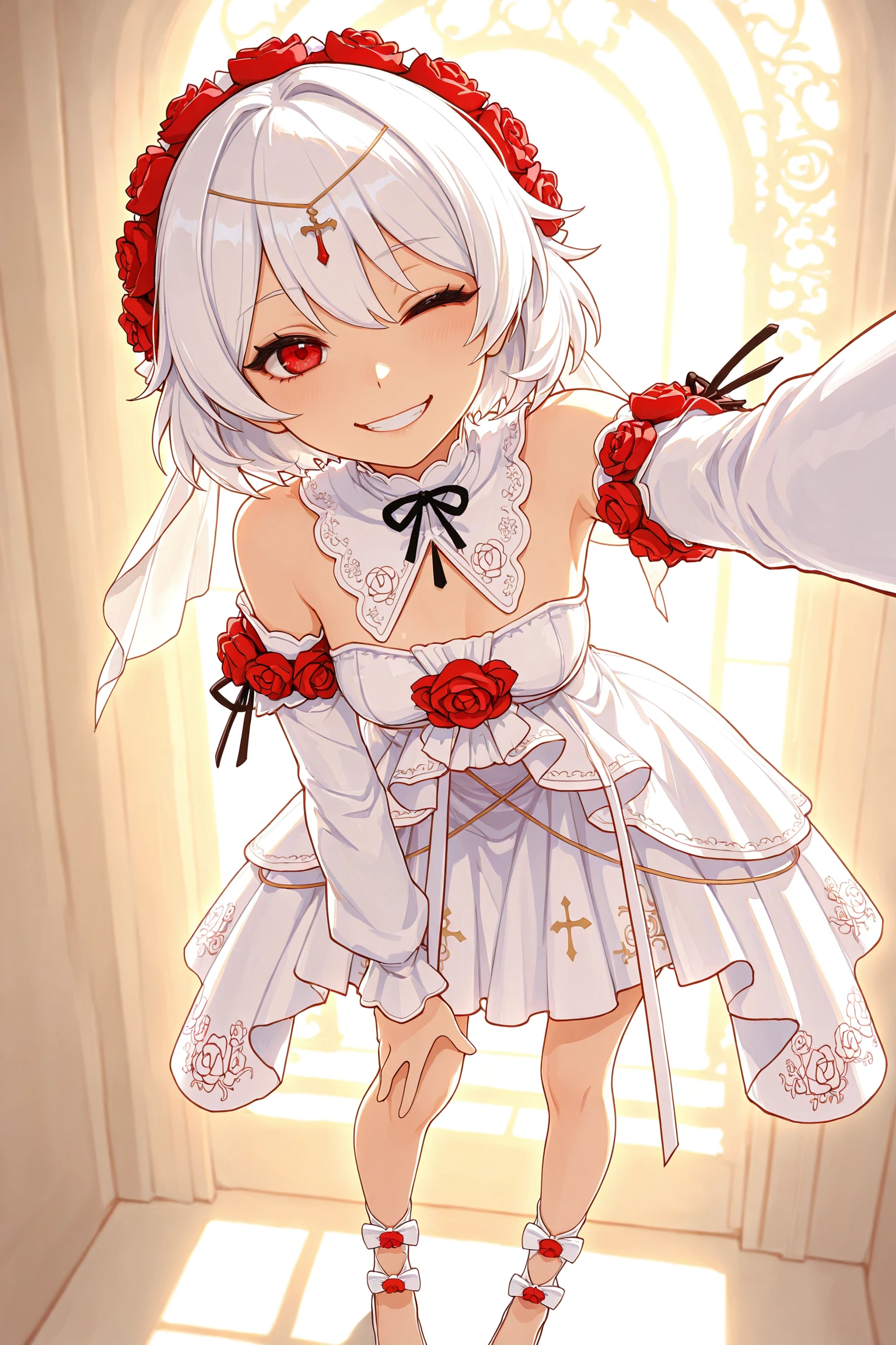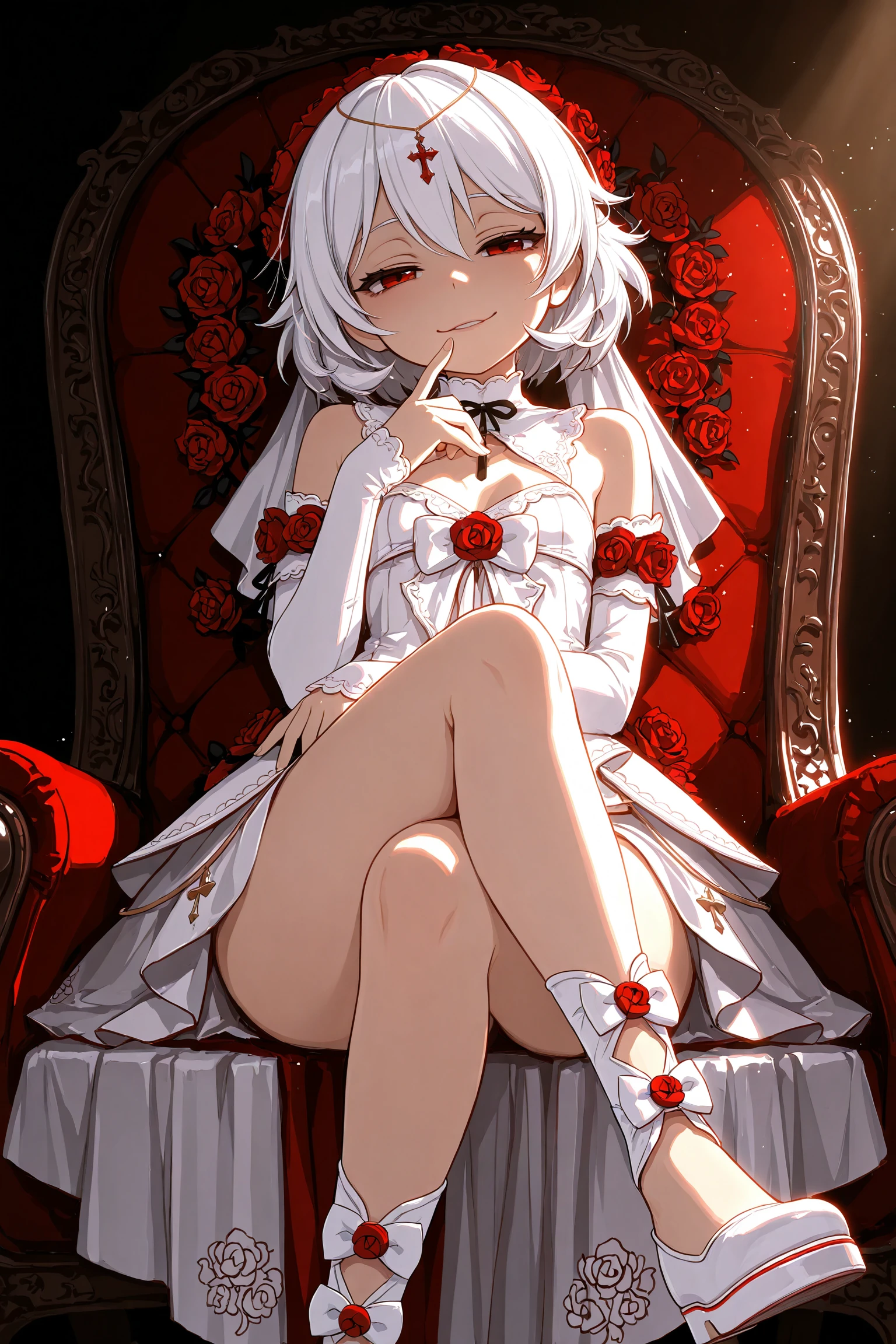 rosy bridesmaid,red eyes,white hair,short hair,hair ornament,veil,white dress,detached sleeves,ankle bow,white footwear,
