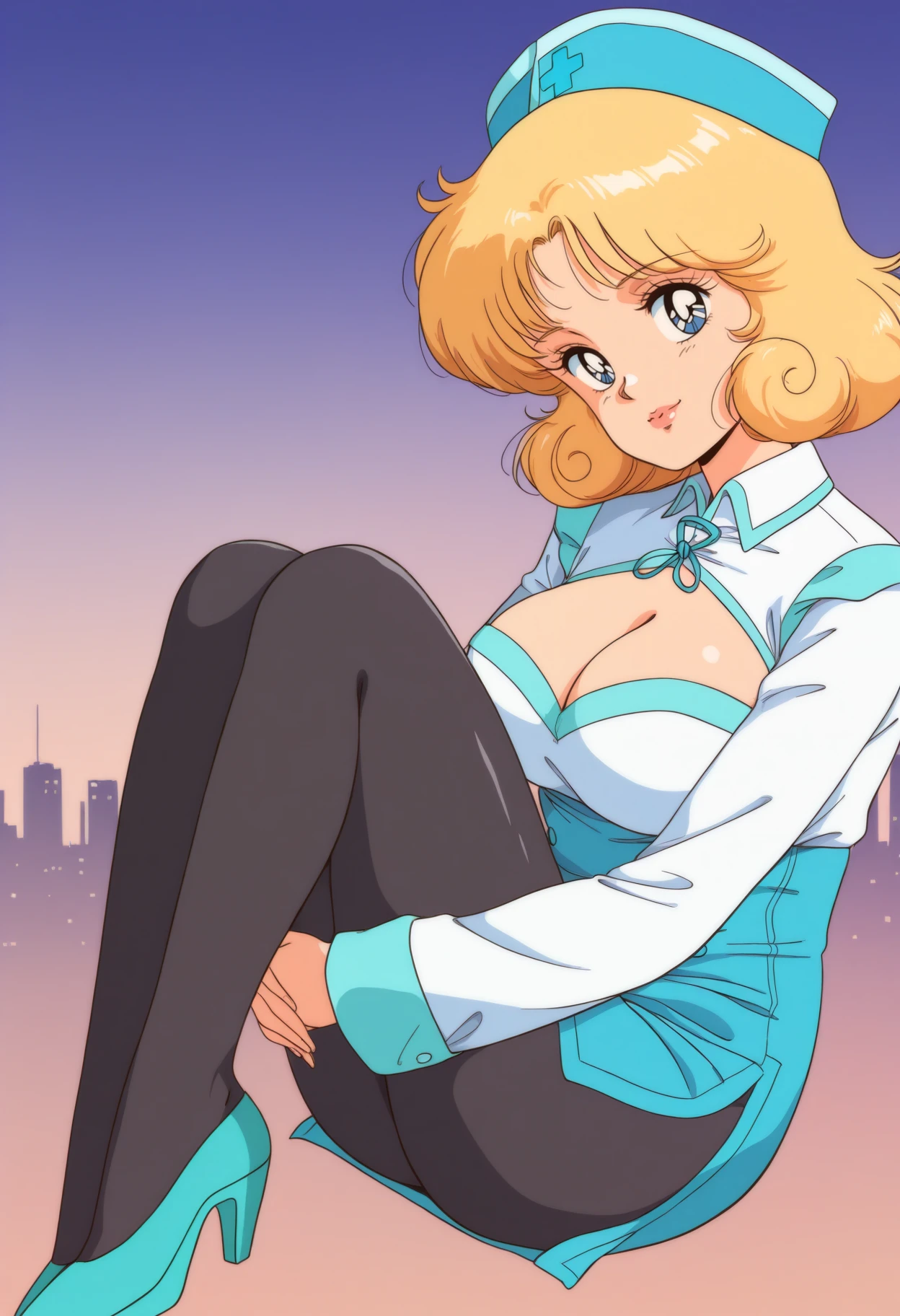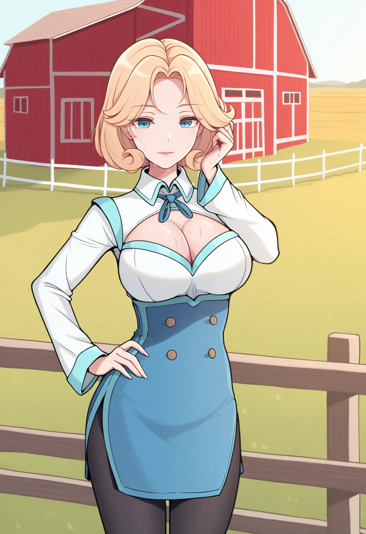 phyllis, blonde hair, blue nurse cap, medium hair, blue eyes, lips, two-tone dress, white dress, collared dress, neck ribbon, long sleeves, cleavage cutout, large breasts, blue dress, underbust, side slit, black pantyhose, high heels, aqua footwear