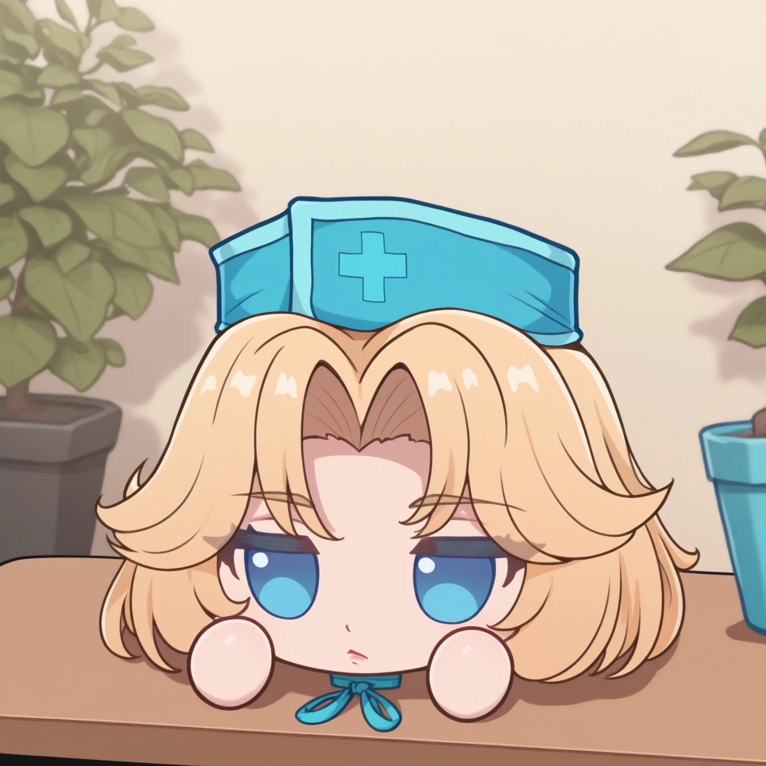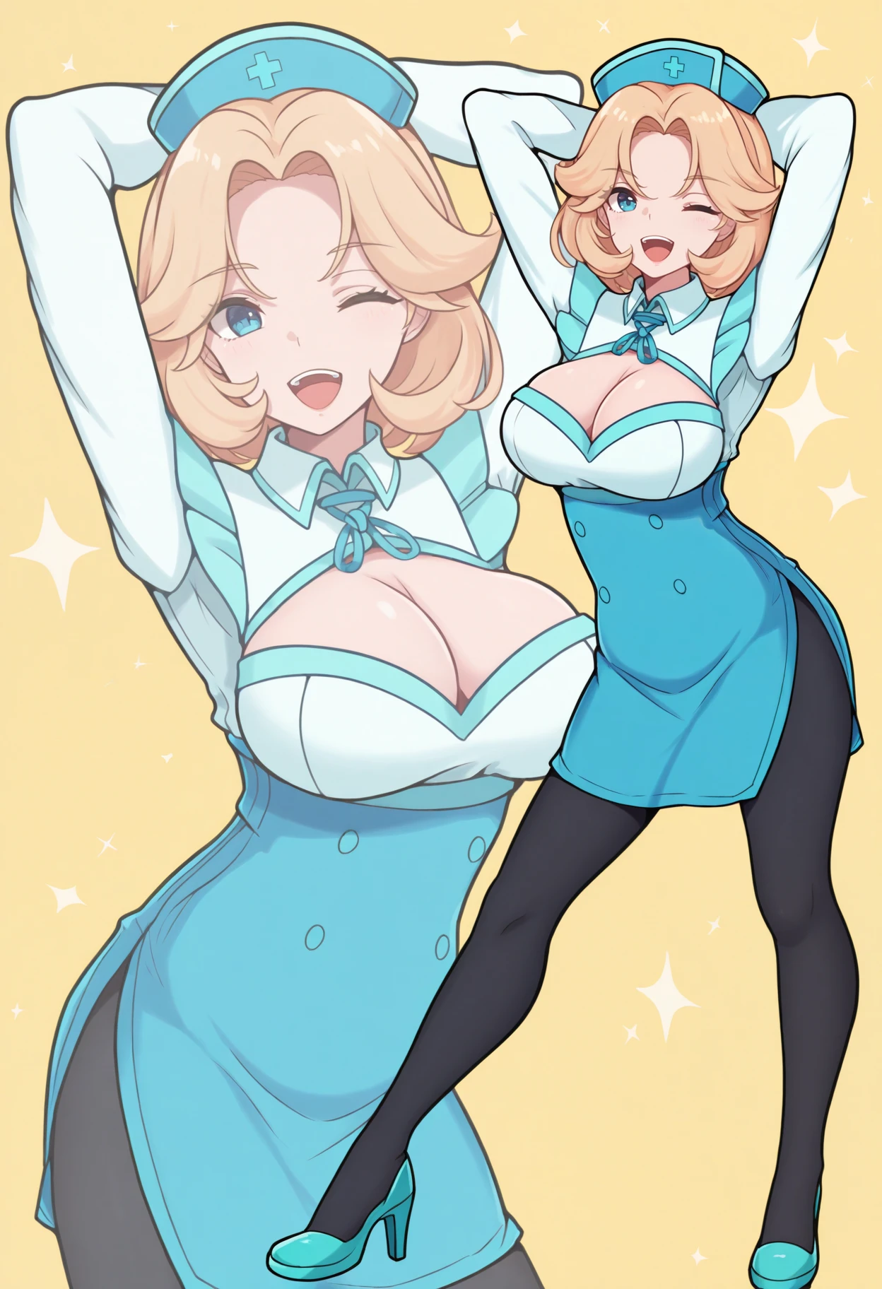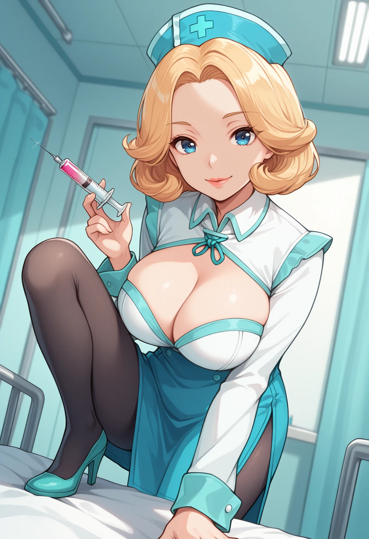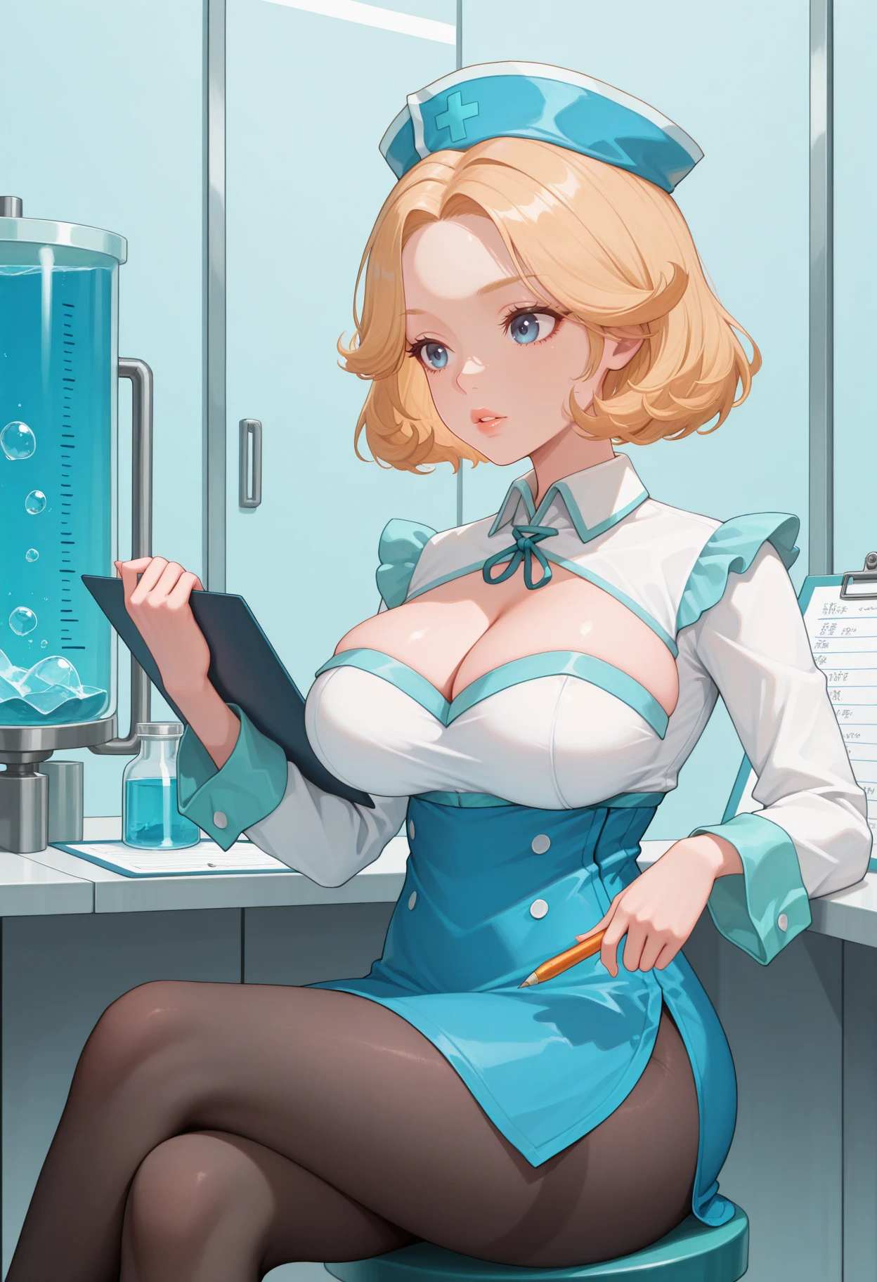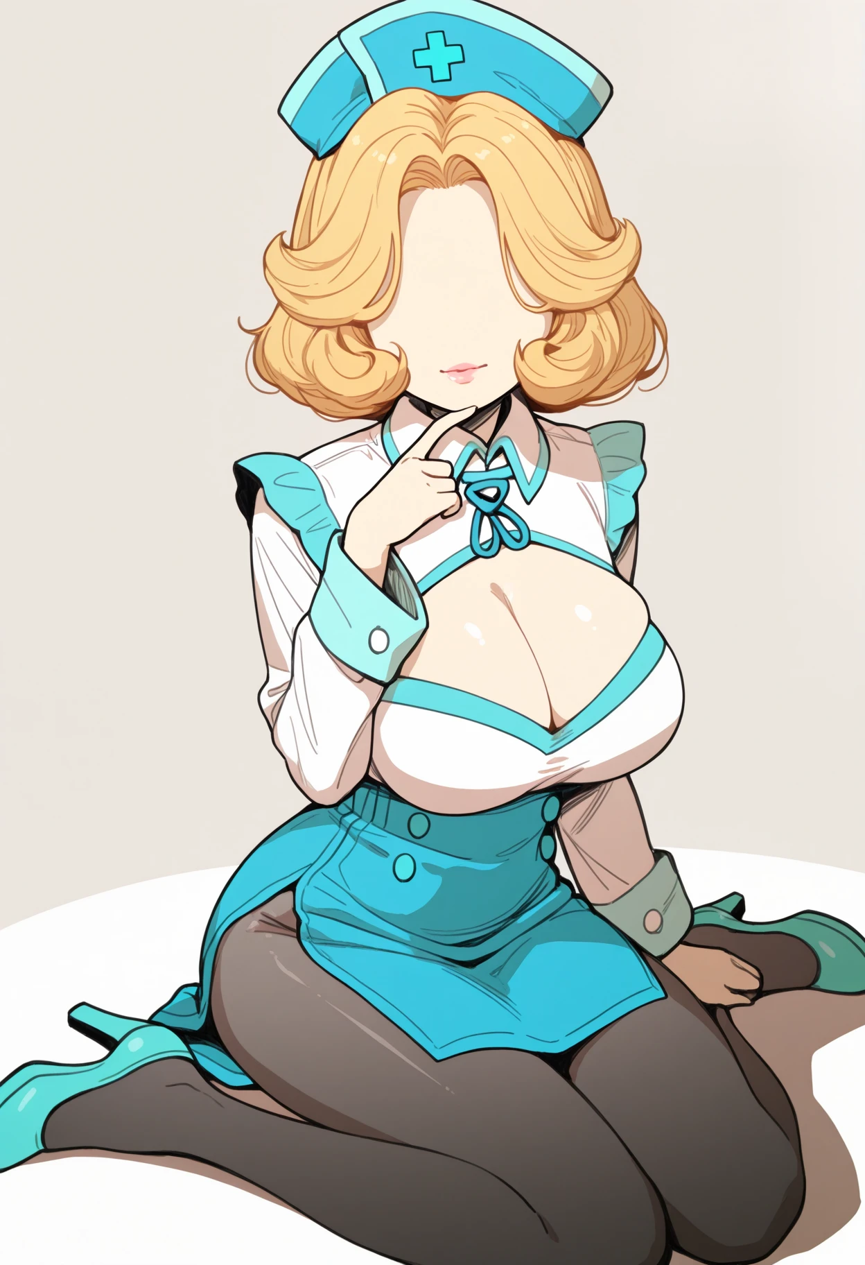 Default appearance: phyllis, blonde hair, blue nurse cap, medium hair, blue eyes, lips, two-tone dress, white dress, collared dress, neck ribbon, long sleeves, cleavage cutout, large breasts, blue dress, underbust, side slit, black pantyhose, high heels, aqua footwear
