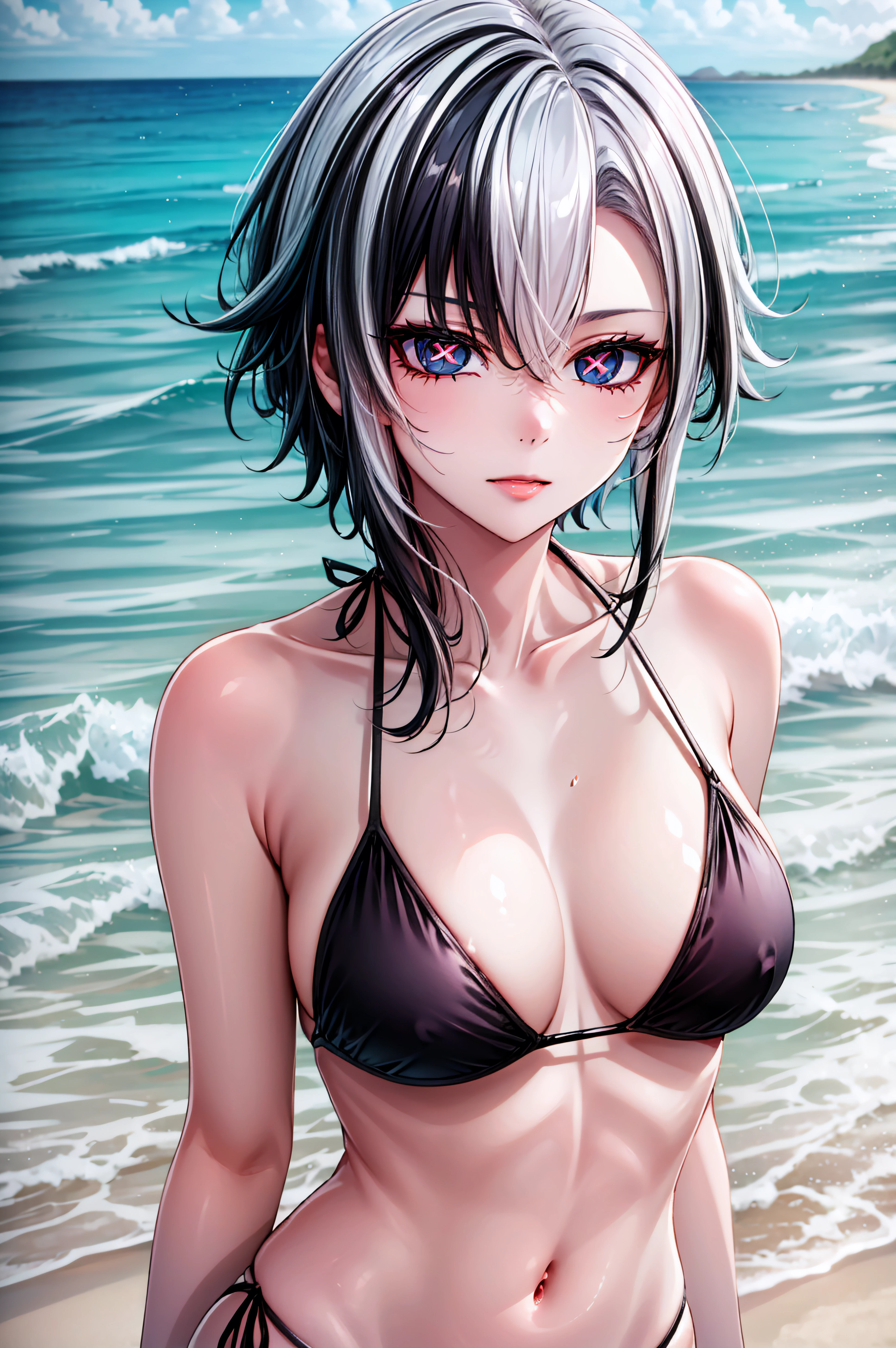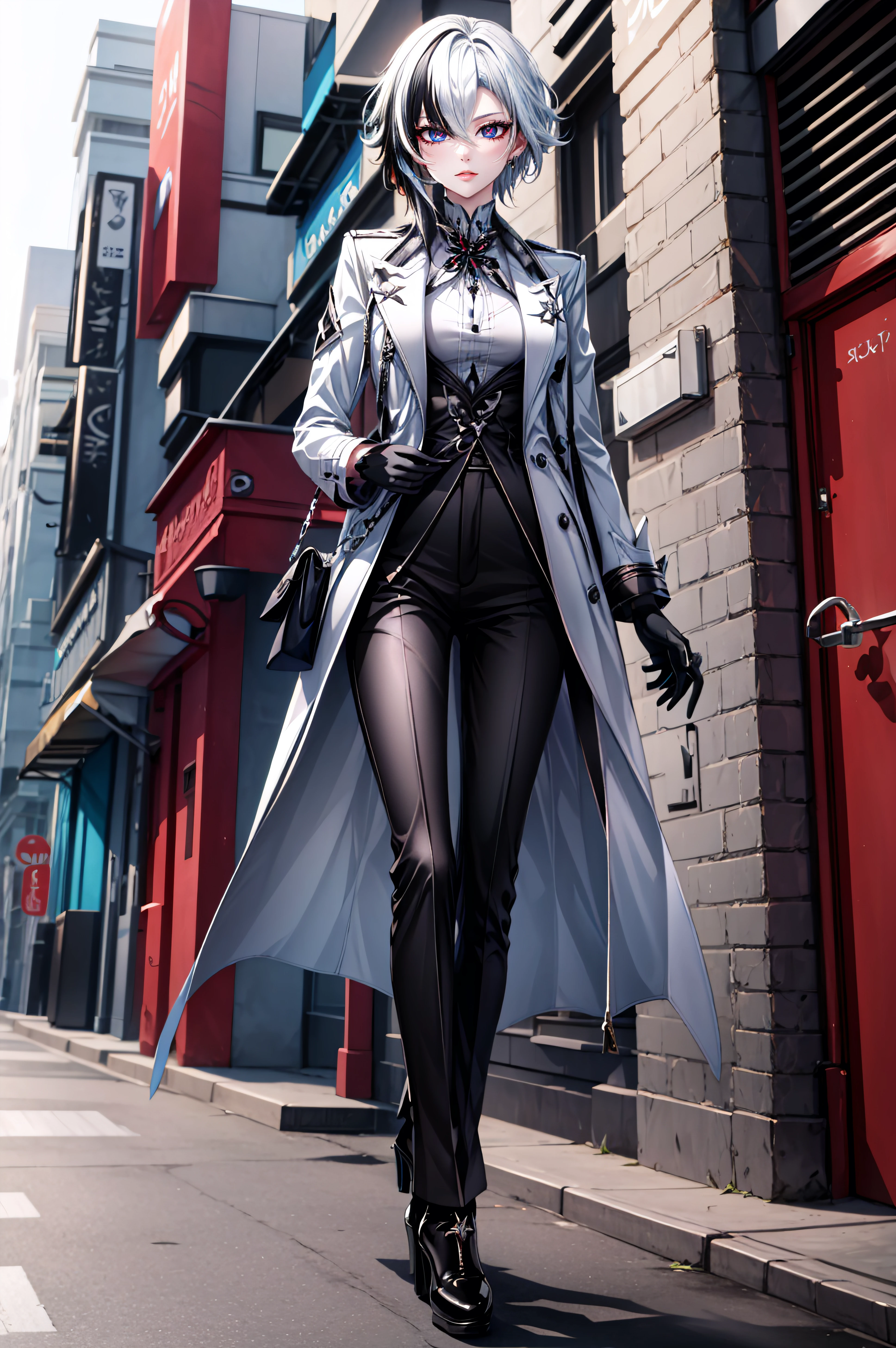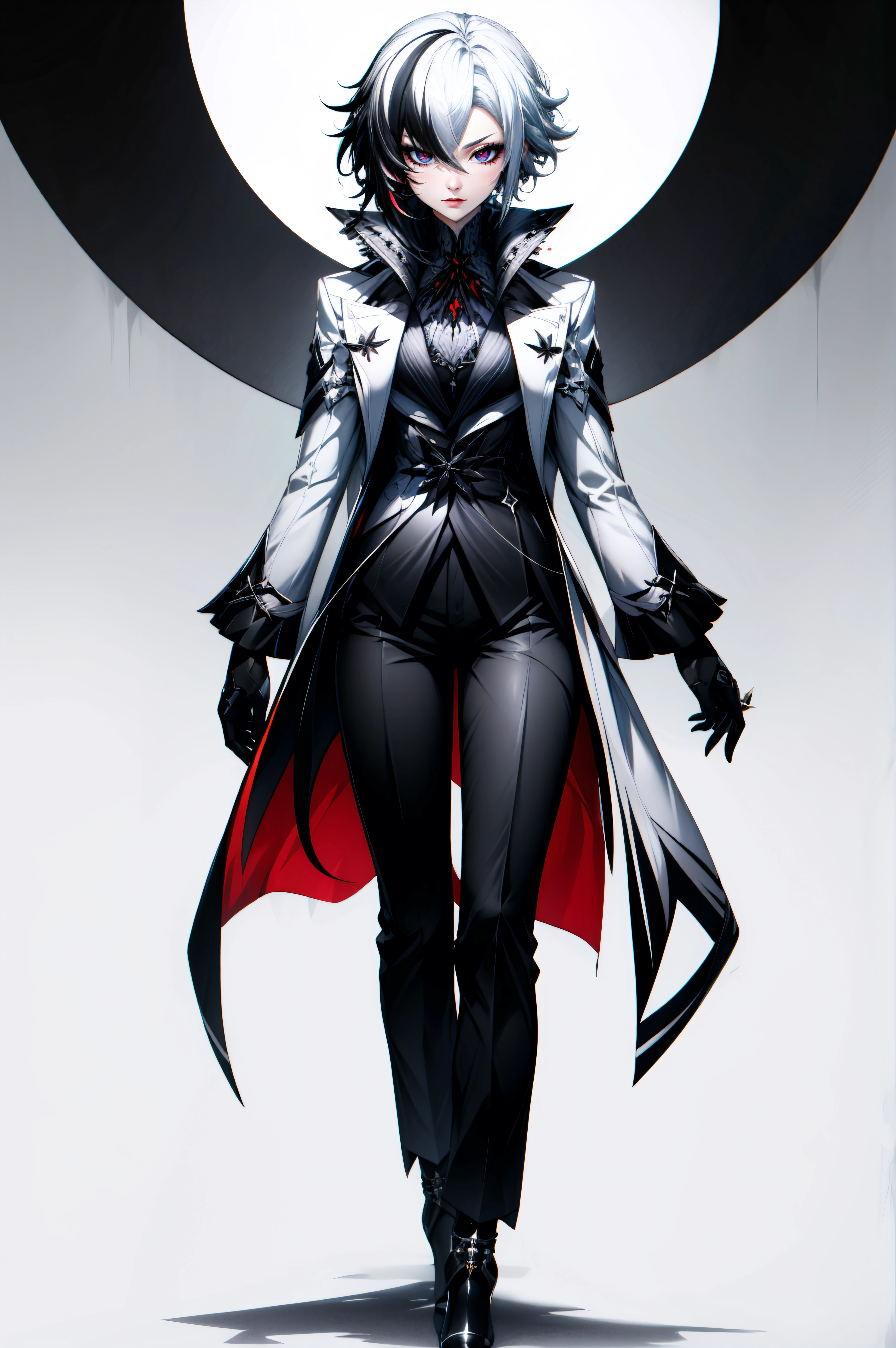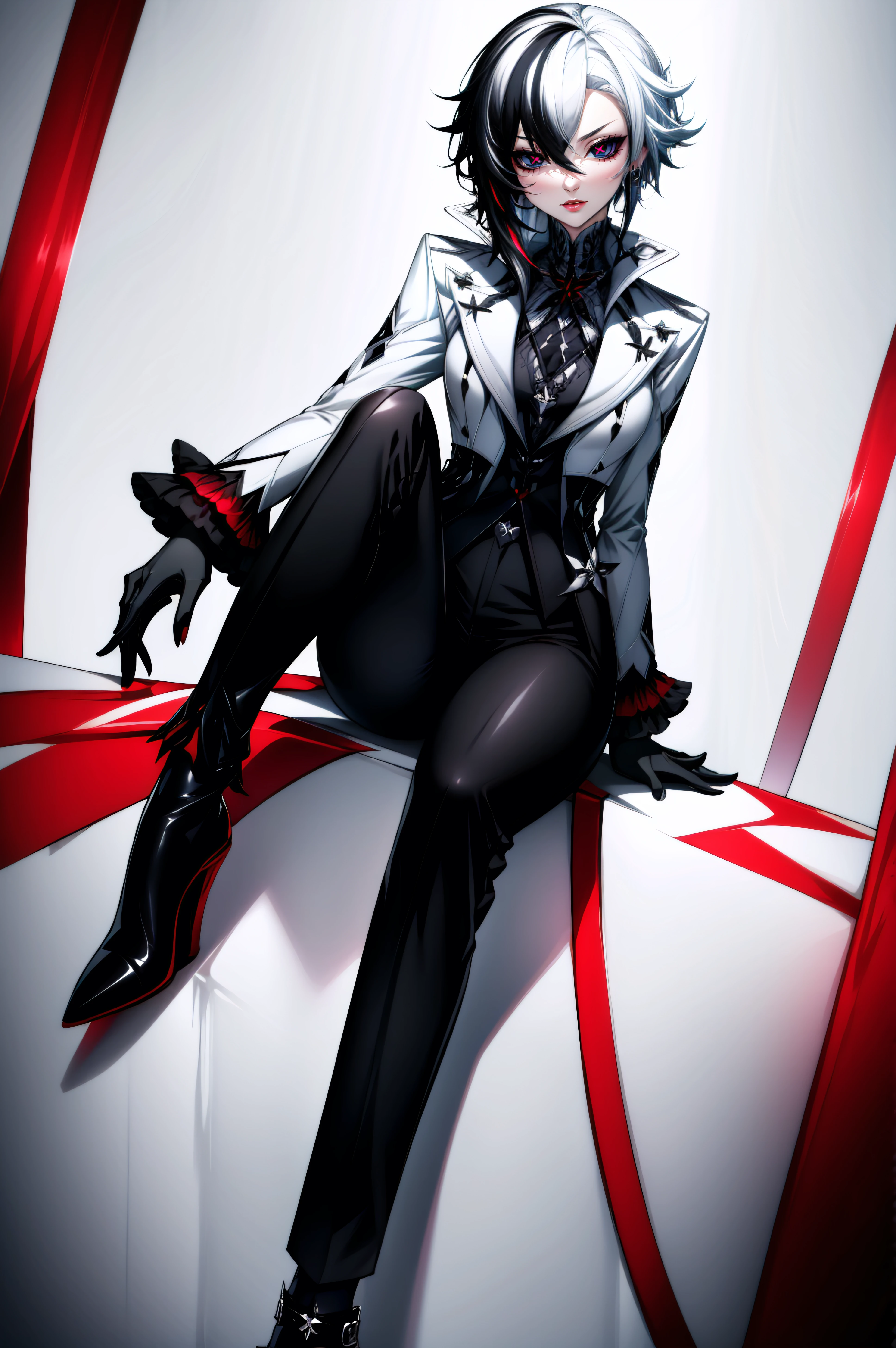 arlecchino, black eyes, x-shaped pupils, short hair, bangs,white hair, black hair, multicolored hair, two-tone hair, streaked hair, hair between eyes, gloves, long sleeves, jewelry, black gloves, pants, coat, black pants, white coat, high-heeled shoes, high-heeled shoes,
