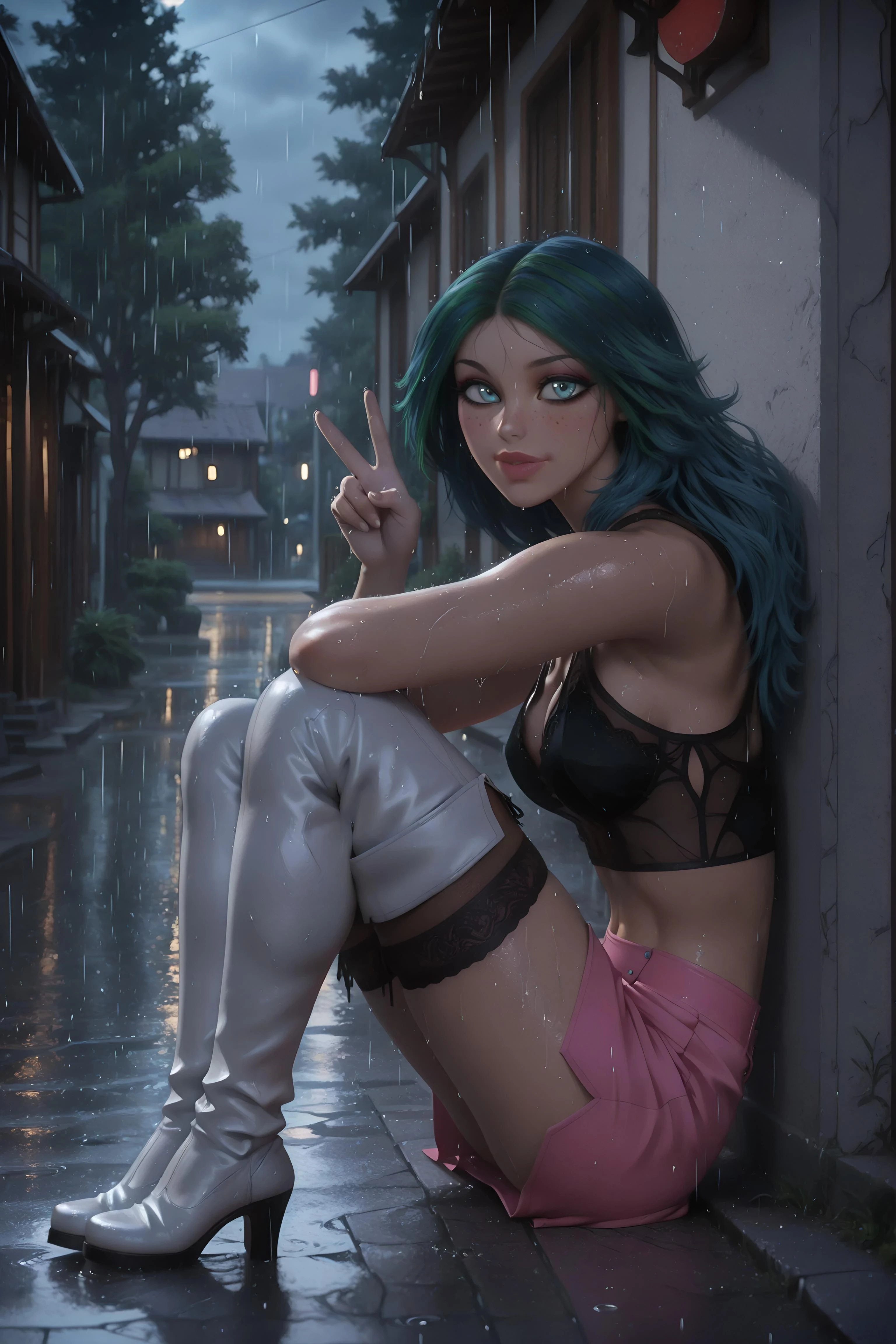 Faye_ByMrJohn, teal green hair, green streaks, shoulder-length hair, layered hair, center part hair, slightly wavy hair, light blue eyes, blue-green eyes, fair skin, light skin tone,