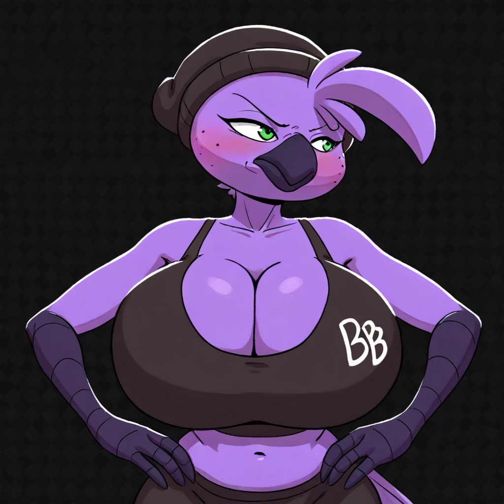 bird female, solo, curvy, enormous breasts, purple feather body, dark purple beak, green eyes, black freckles on cheeks, dark purple talons, dark purple forearms, feather bird tail, black baggy beanie, large ahoge, black tanktop, dark gray tight pants,