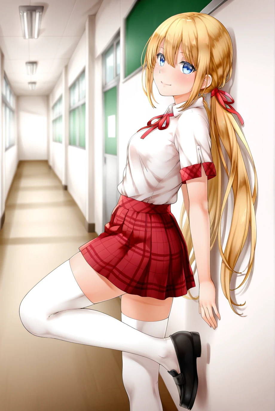 outfit_1, white shirt, collared shirt, short sleeves, neck ribbon, red skirt, plaid skirt, pleated skirt, zettai ryouiki, white thighhighs, loafers, black footwear,