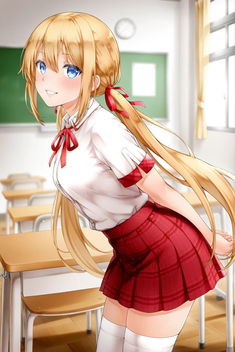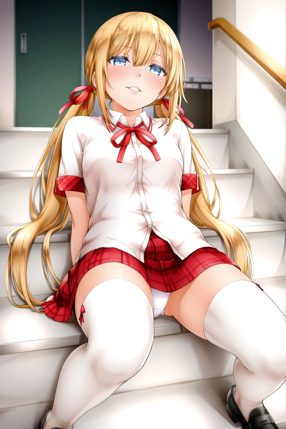 <lora:HunniePopTiffany-IL-v2-08:0.9>, ChopioTiffany, blonde hair, very long hair, low twintails, sidelocks, hair between eyes, hair ribbon, red ribbon, blue eyes, looking at viewer,Outfit 1 (School Uniform):