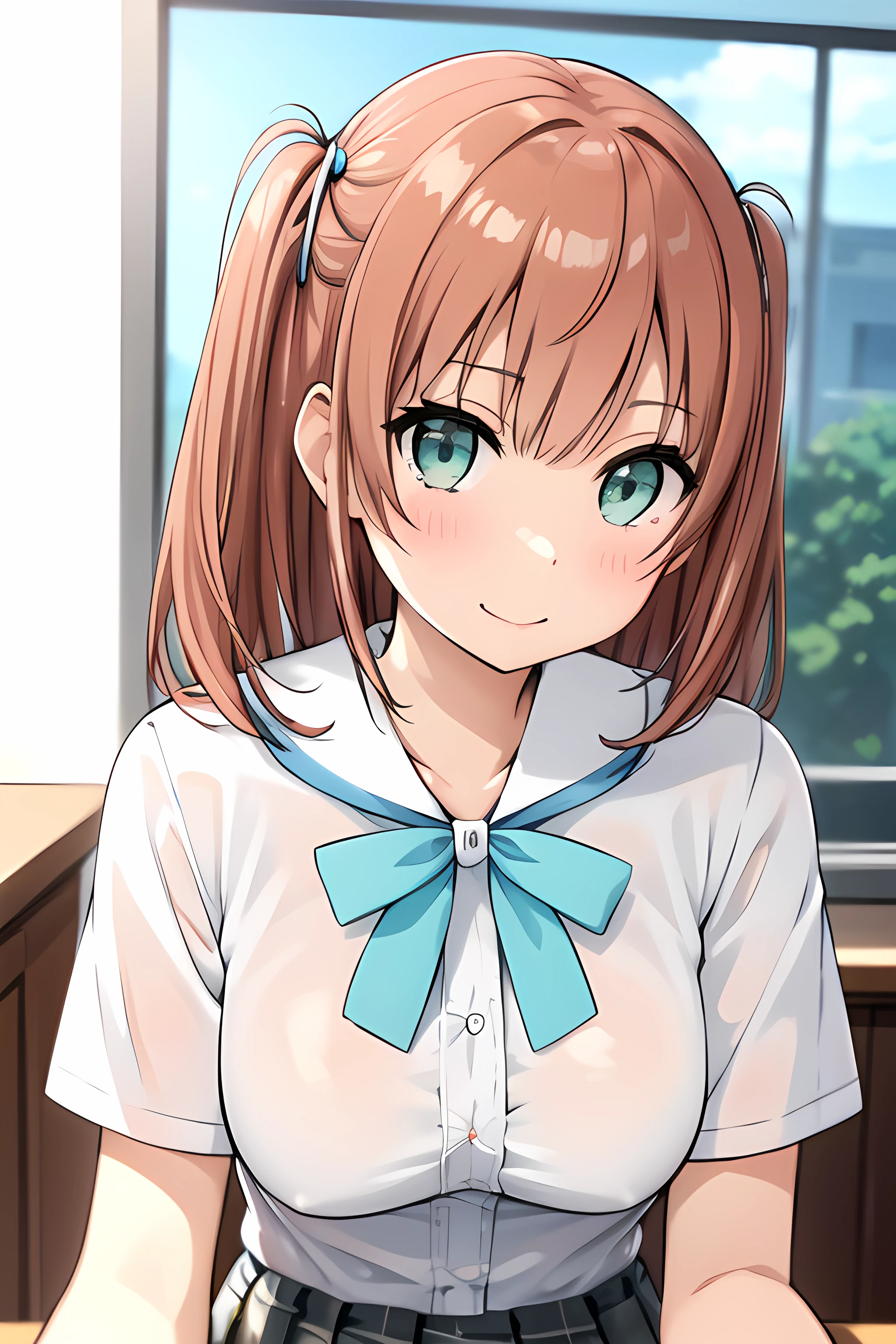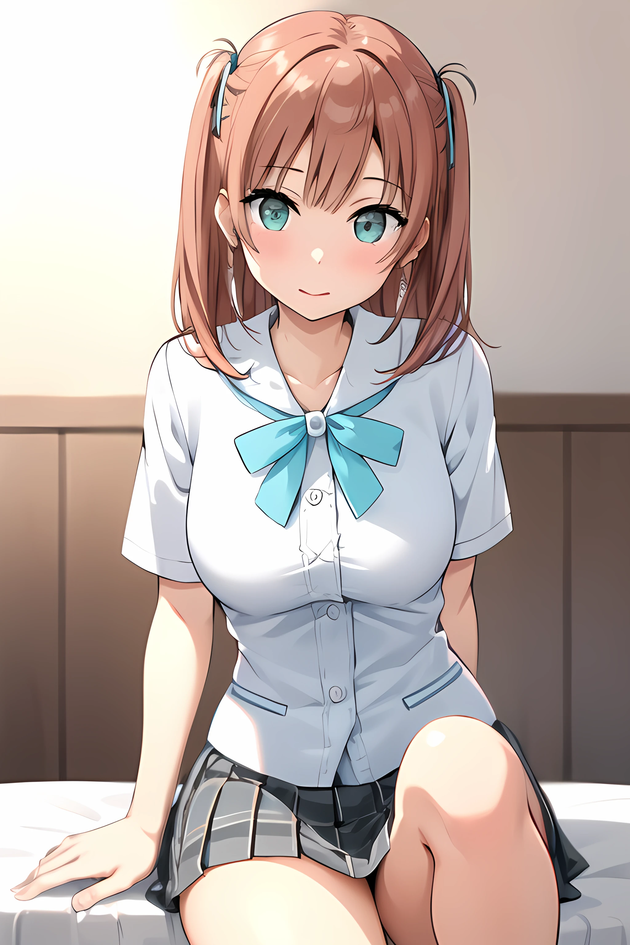 minori nanahashi \(uniform\) \(one room\), blue_ribbon, blush, brown_hair, green_eyes, hair_ribbon, looking_at_viewer, plaid_skirt, pleated_skirt, ribbon, school_uniform, shirt, short_sleeves, skirt,white_shirt