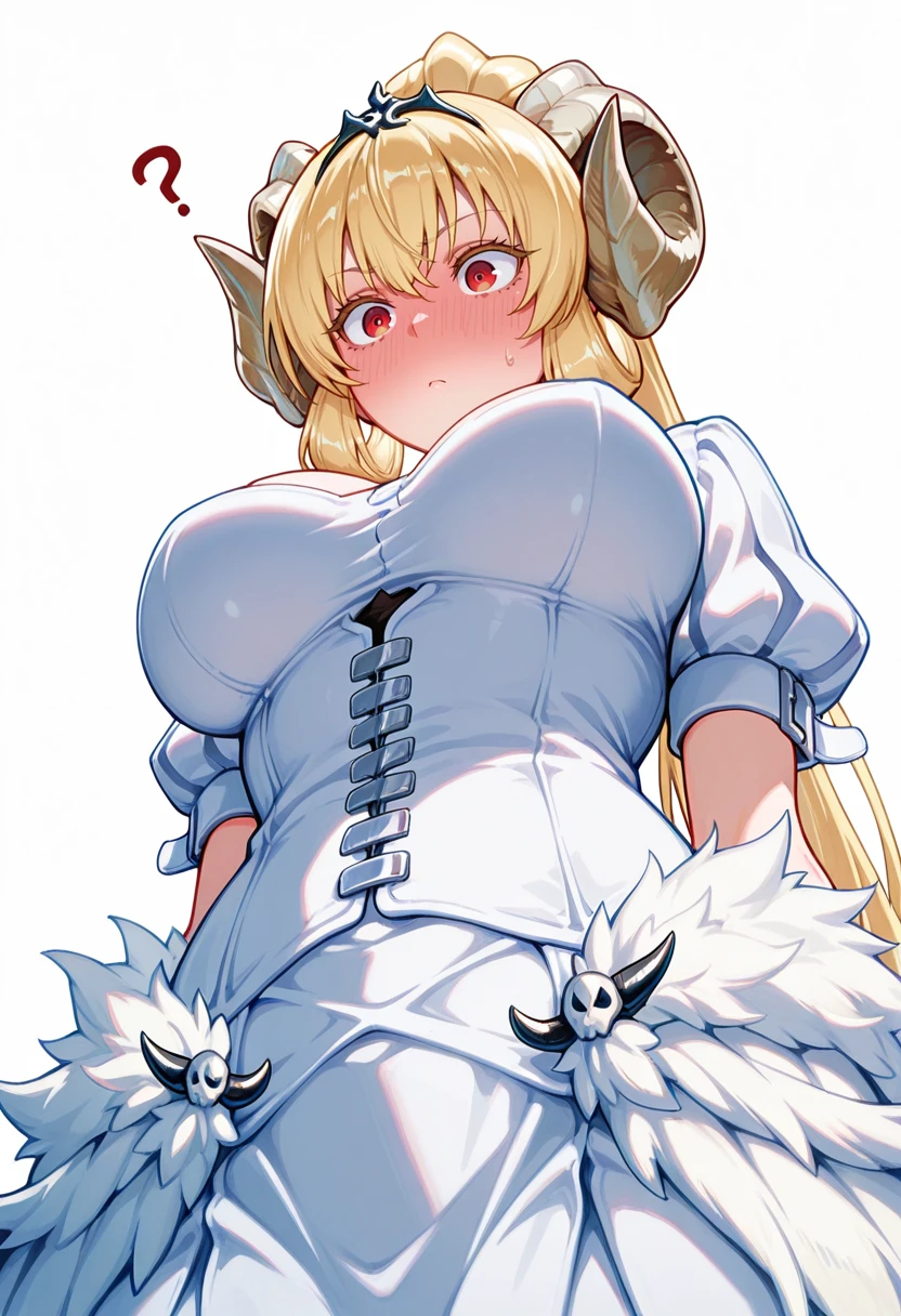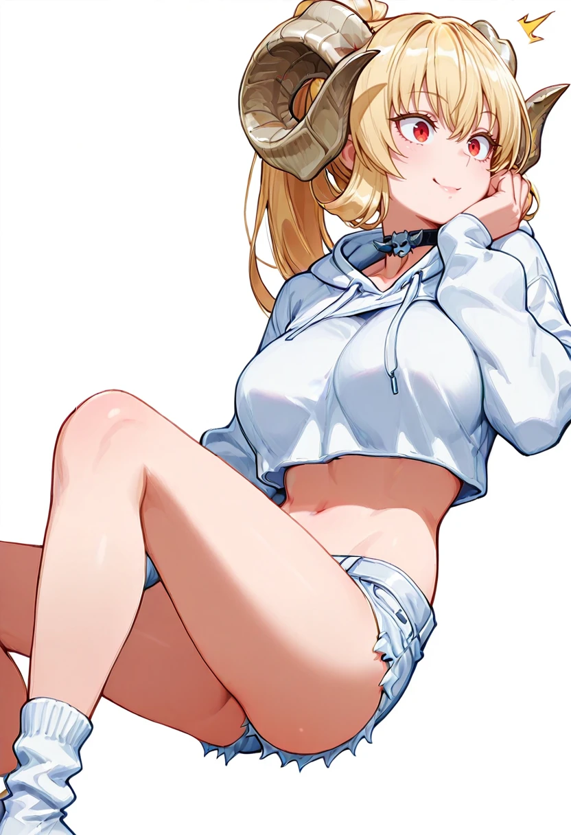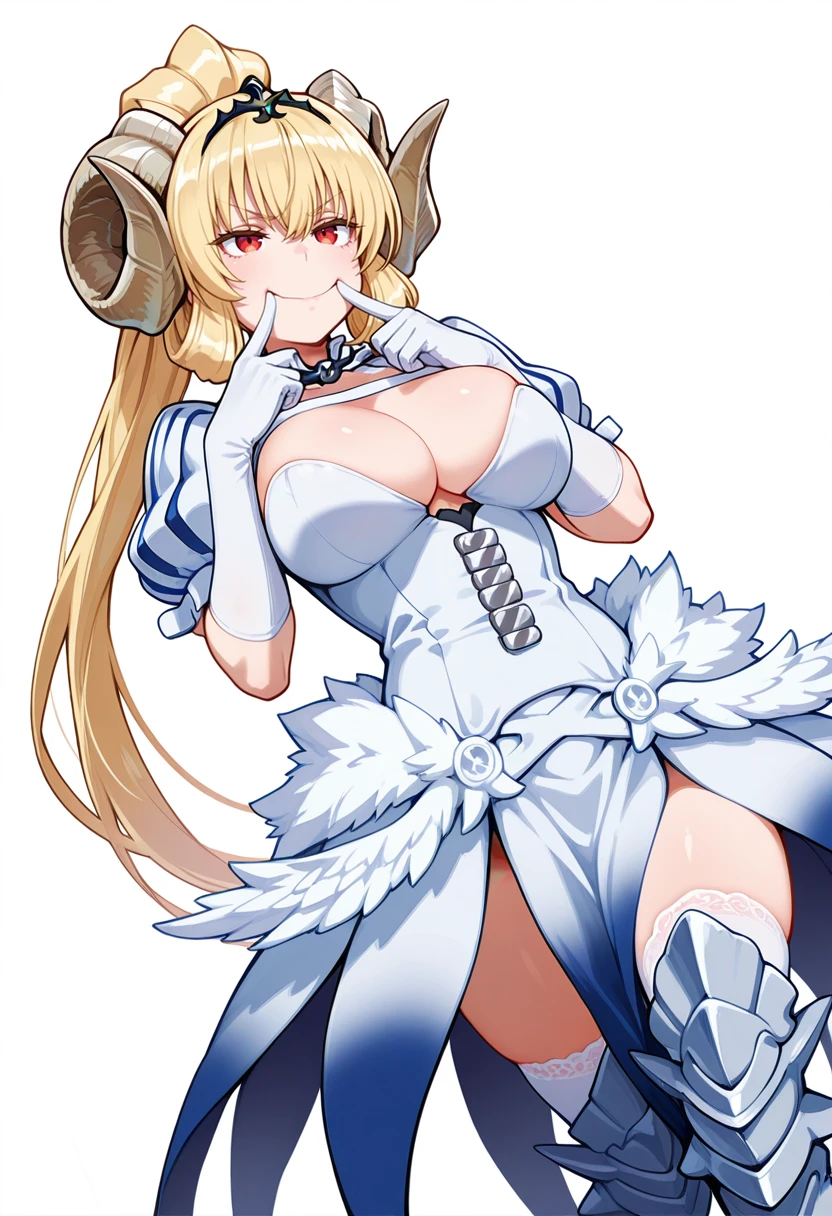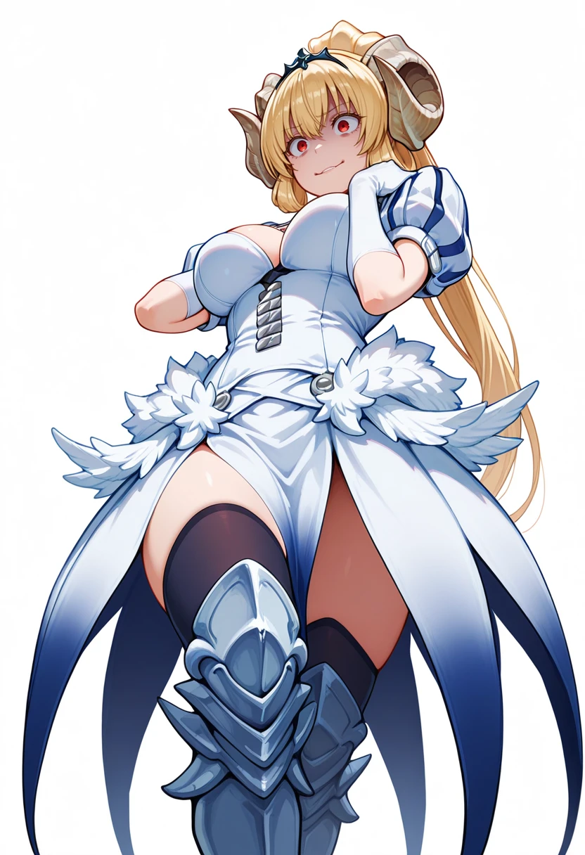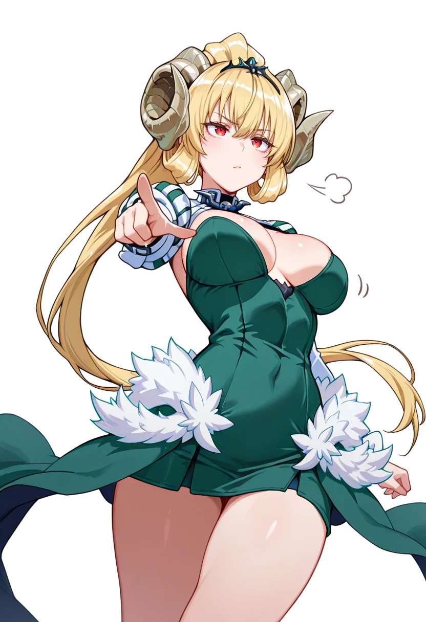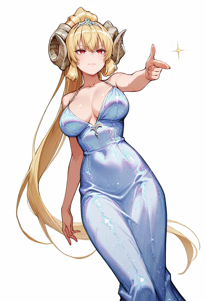 lucifer_cnr, 1girl, blonde hair, red eyes, large breasts, long hair, curled horns, ponytail, demon girl, tiara,