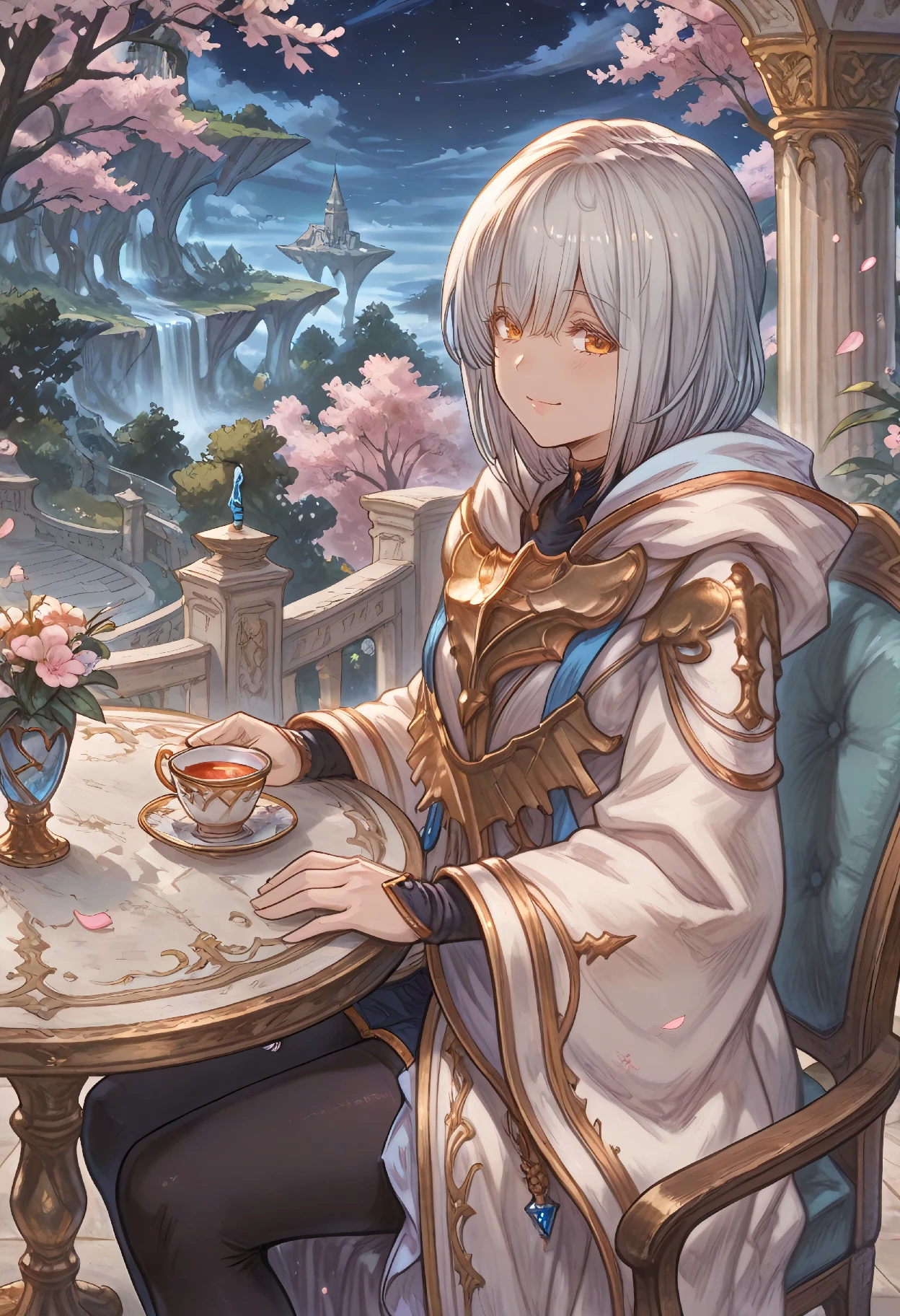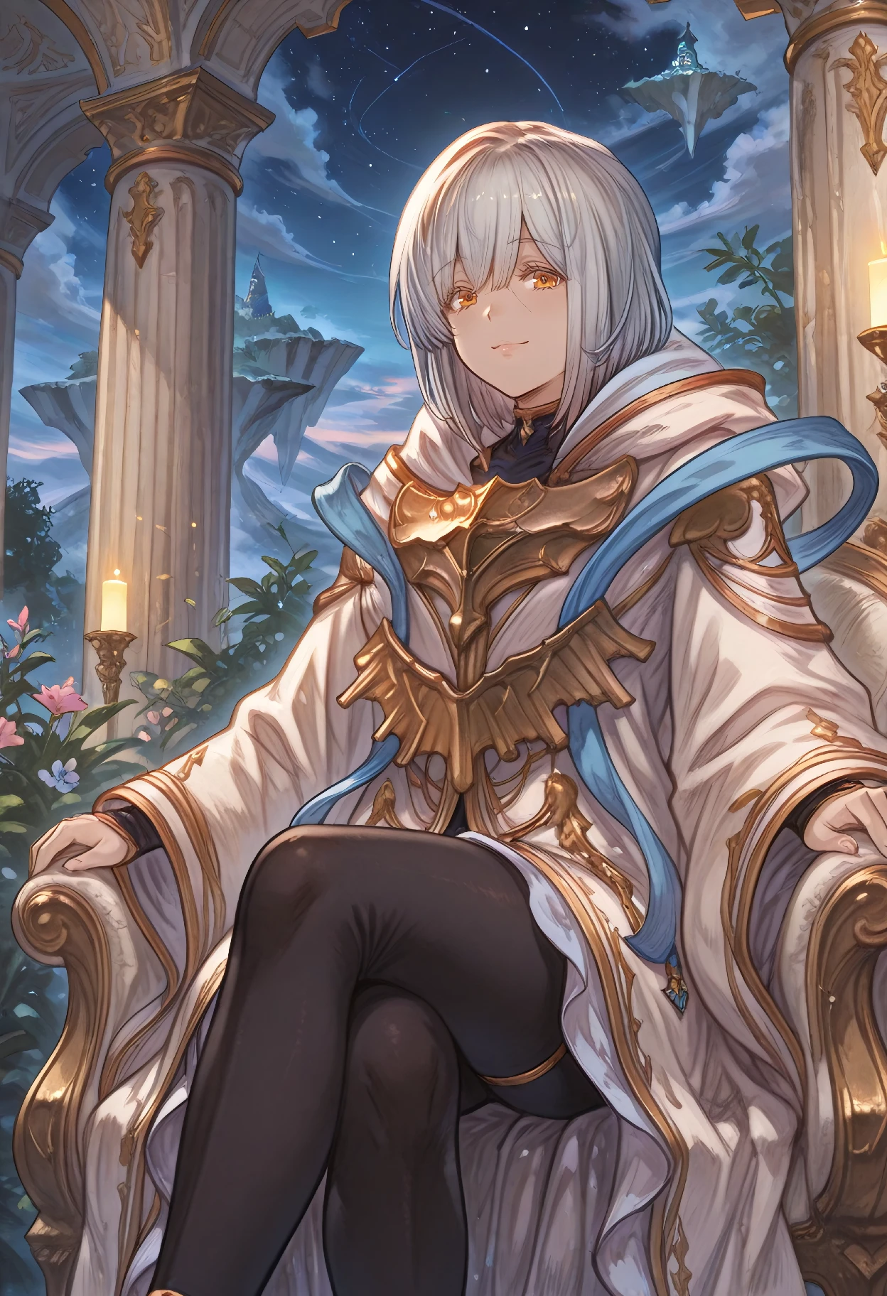 LilitBase (Granblue Fantasy), short hair, grey hair, hair between eyes, yellow eyes, jewelry, shirt, white robe, hooded robe, hood down, cloak, gold trim, long sleeves, wide sleeves, pantyhose,