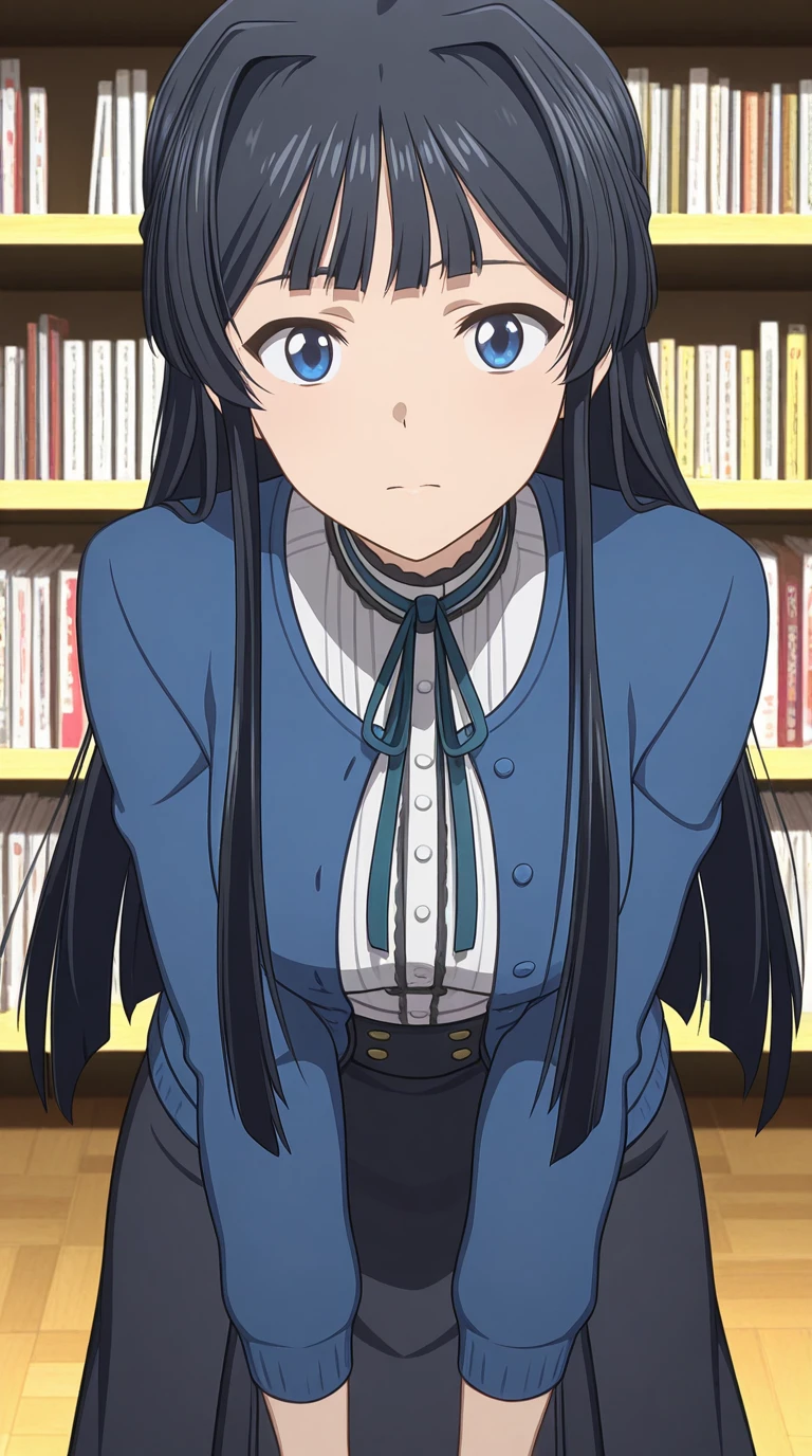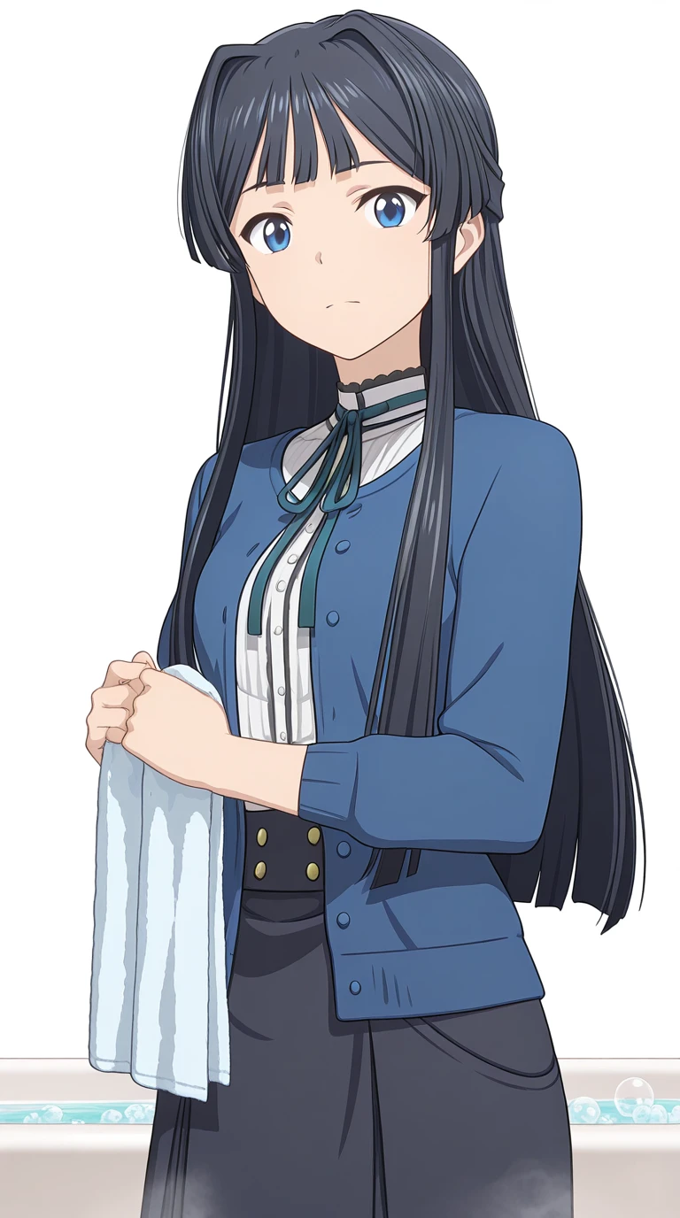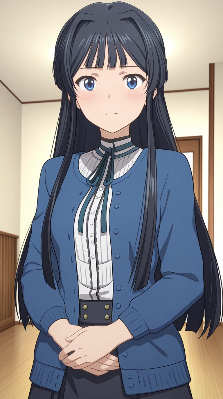 shizuka mogami, mogami shizuka, long hair, bangs, blue eyes, black hair, half updo, hair intakes, sidelocks, mature female, medium breasts, anime screencap
