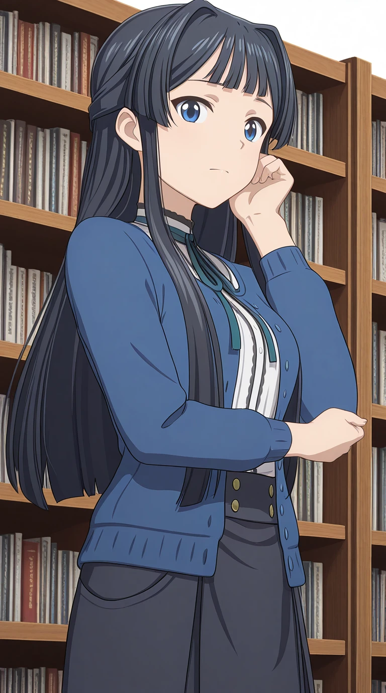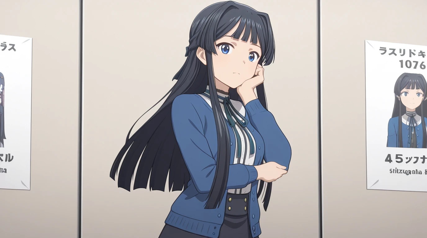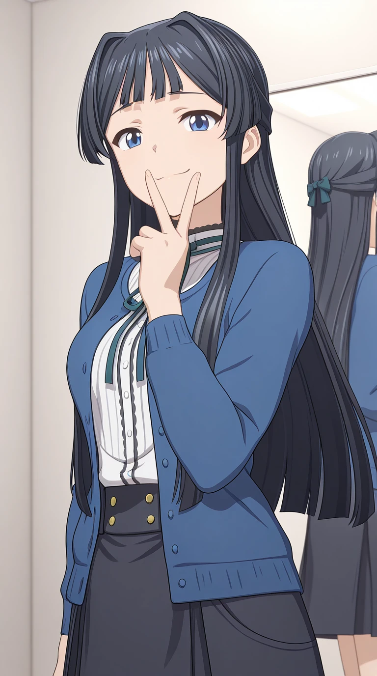 shizuka mogami, mogami shizuka, long hair, bangs, blue eyes, black hair, half updo, hair intakes, sidelocks, mature female, medium breasts, anime screencap