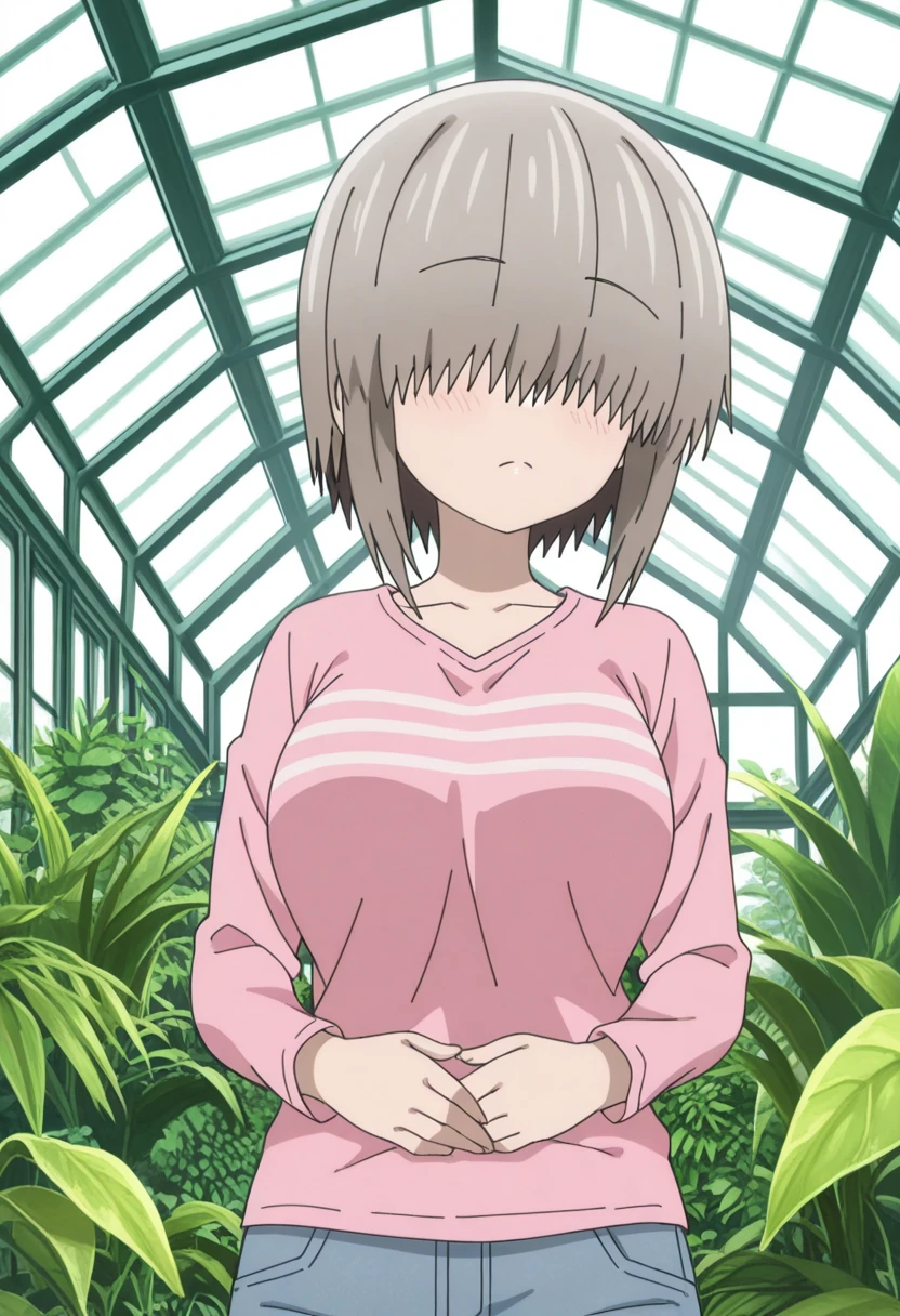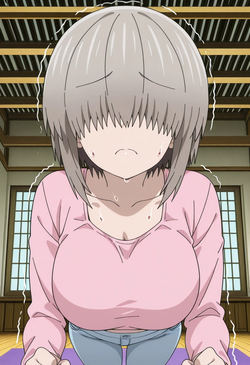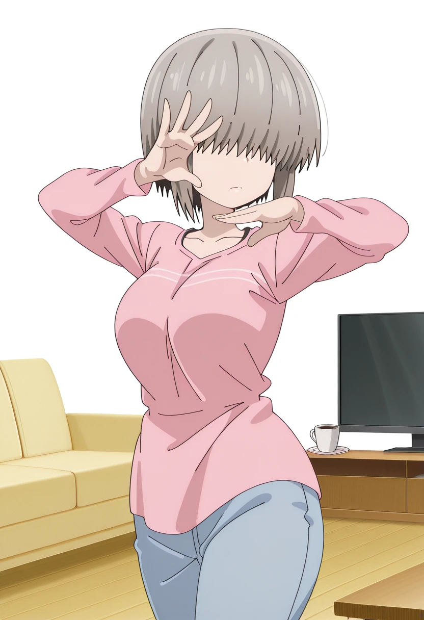 yanagi uzaki, short hair, bangs, grey hair, hair over eyes, covered eyes, long bangs, sidelocks, mature female, large breasts, anime screencap
