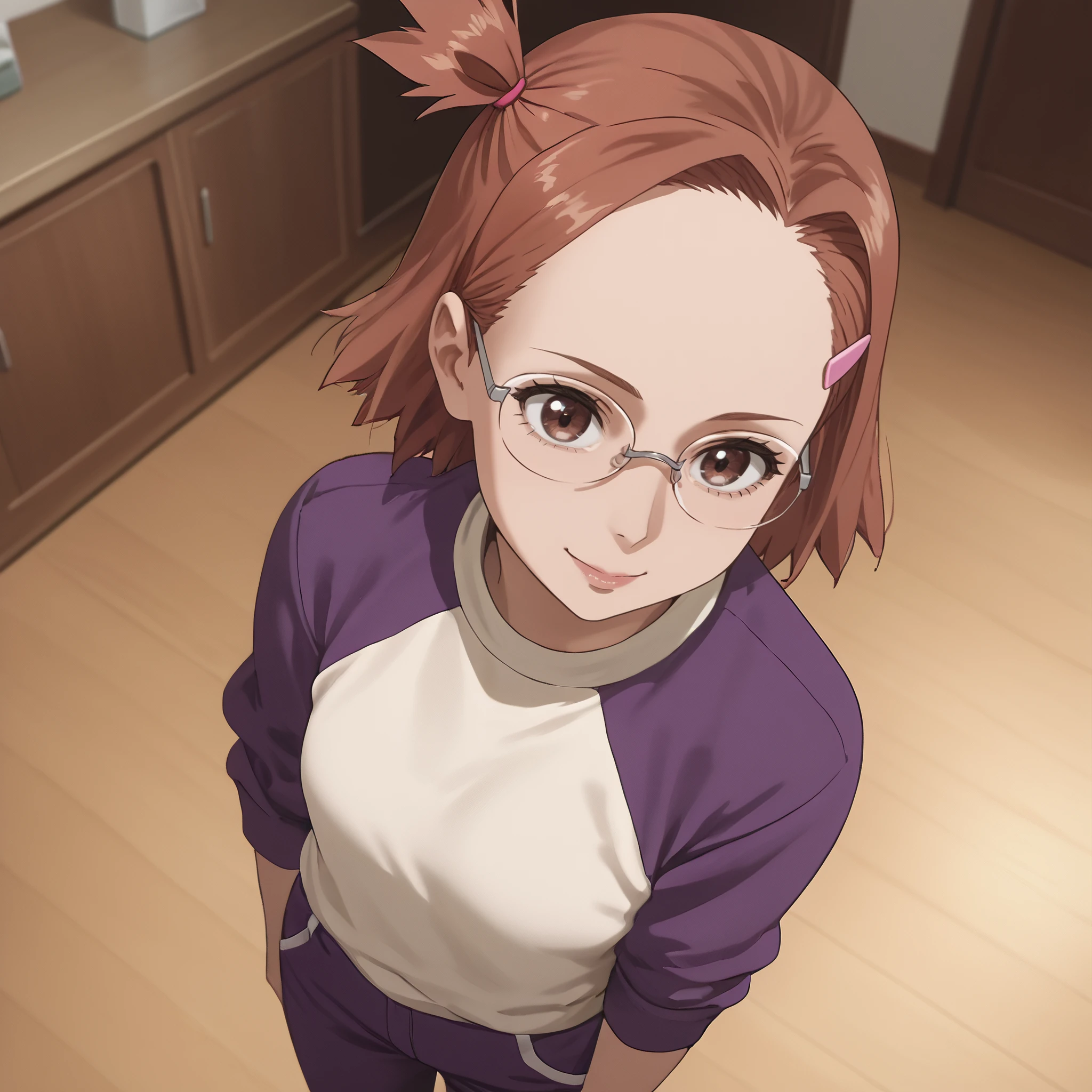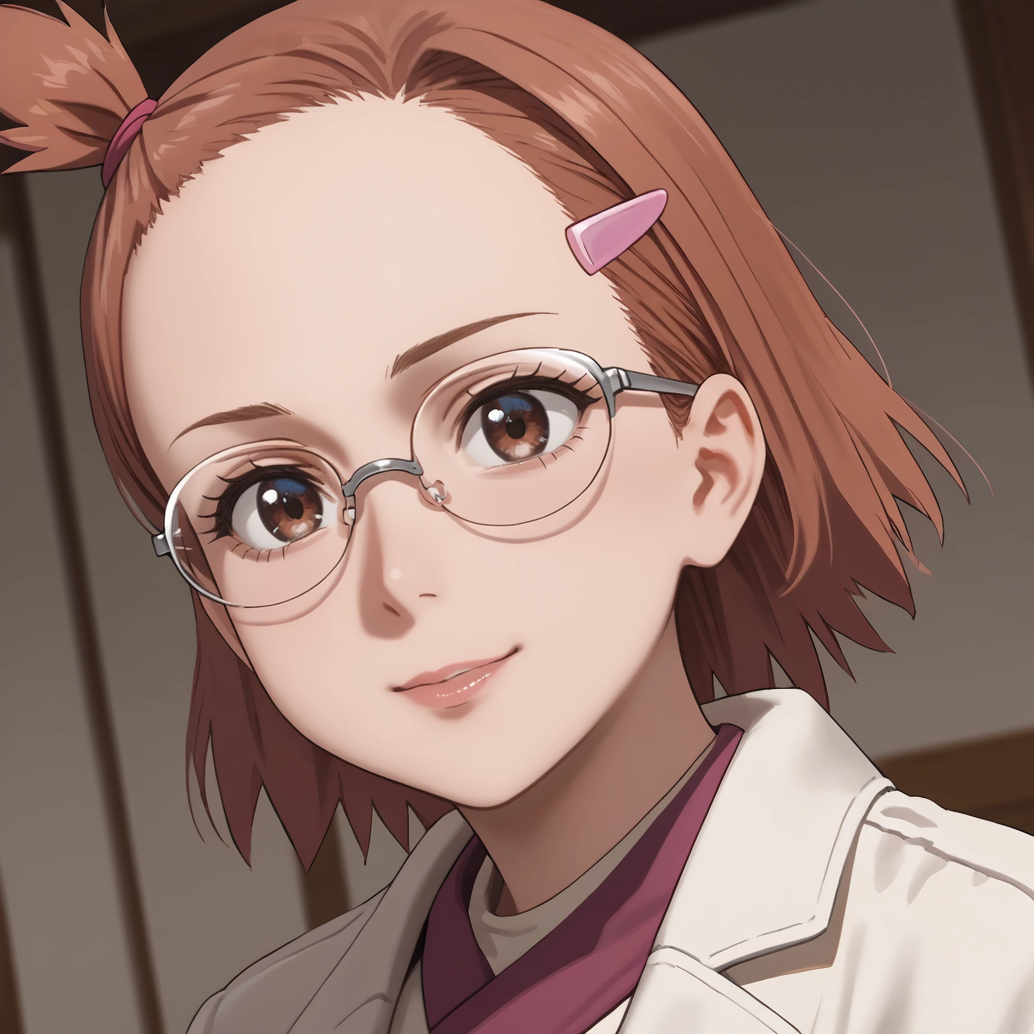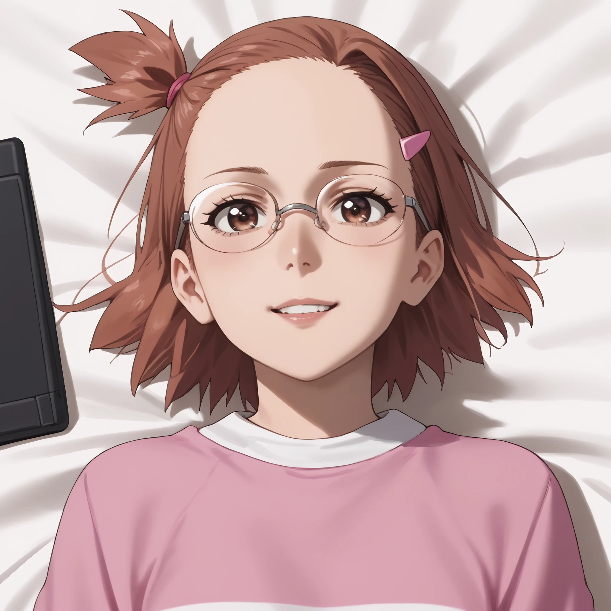 ARTHinako, short hair, glasses, hair ornament, hairclip, brown hair, brown eyes, bangs, black-framed eyewear, opaque glasses,