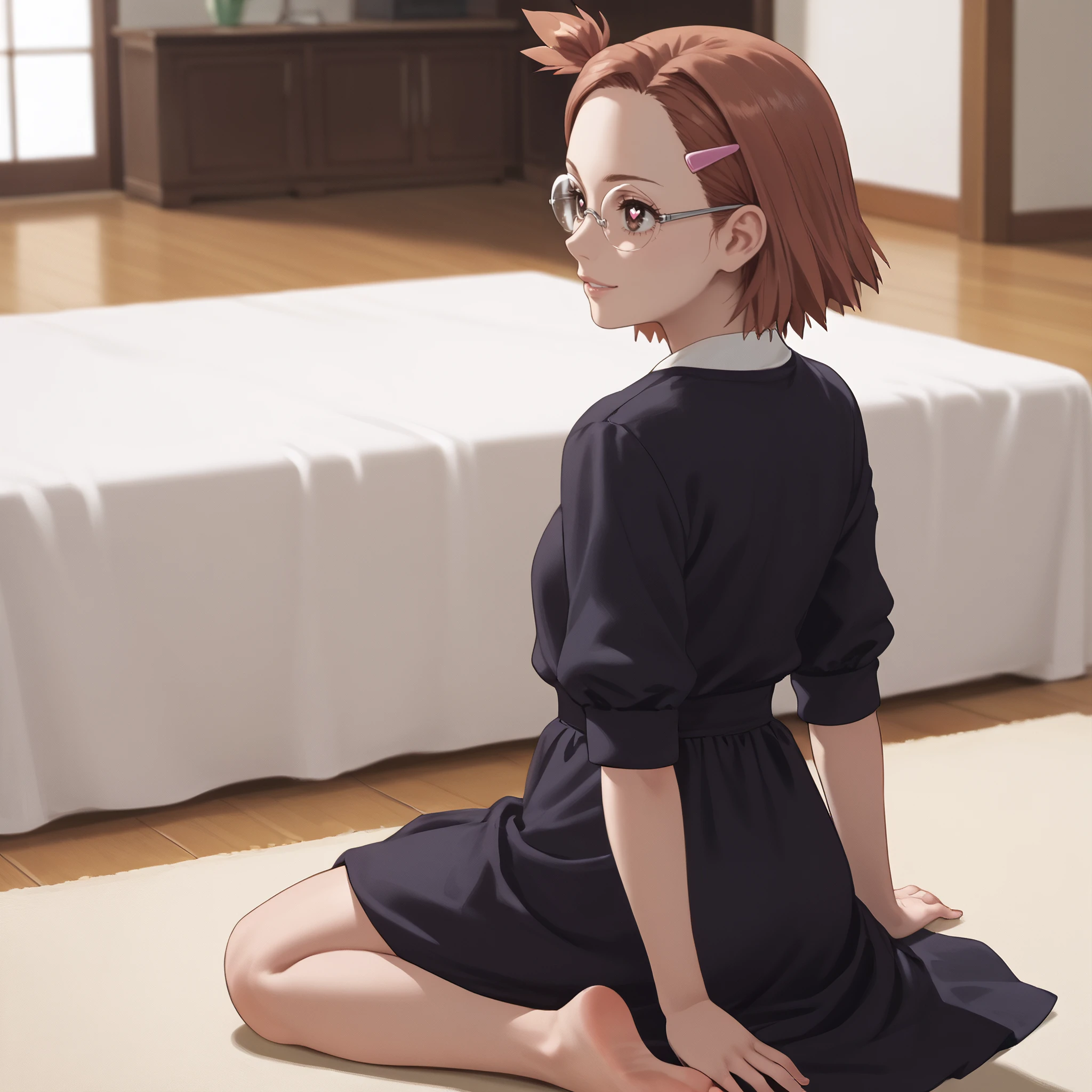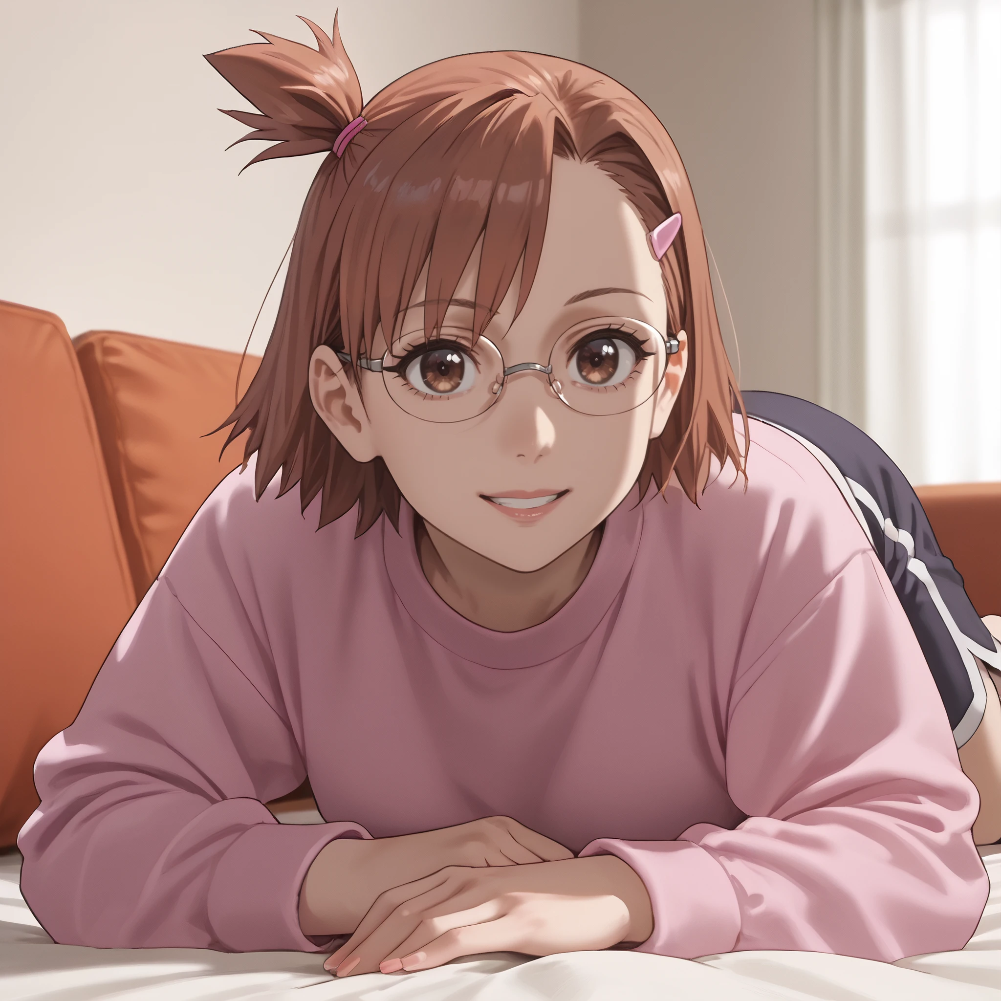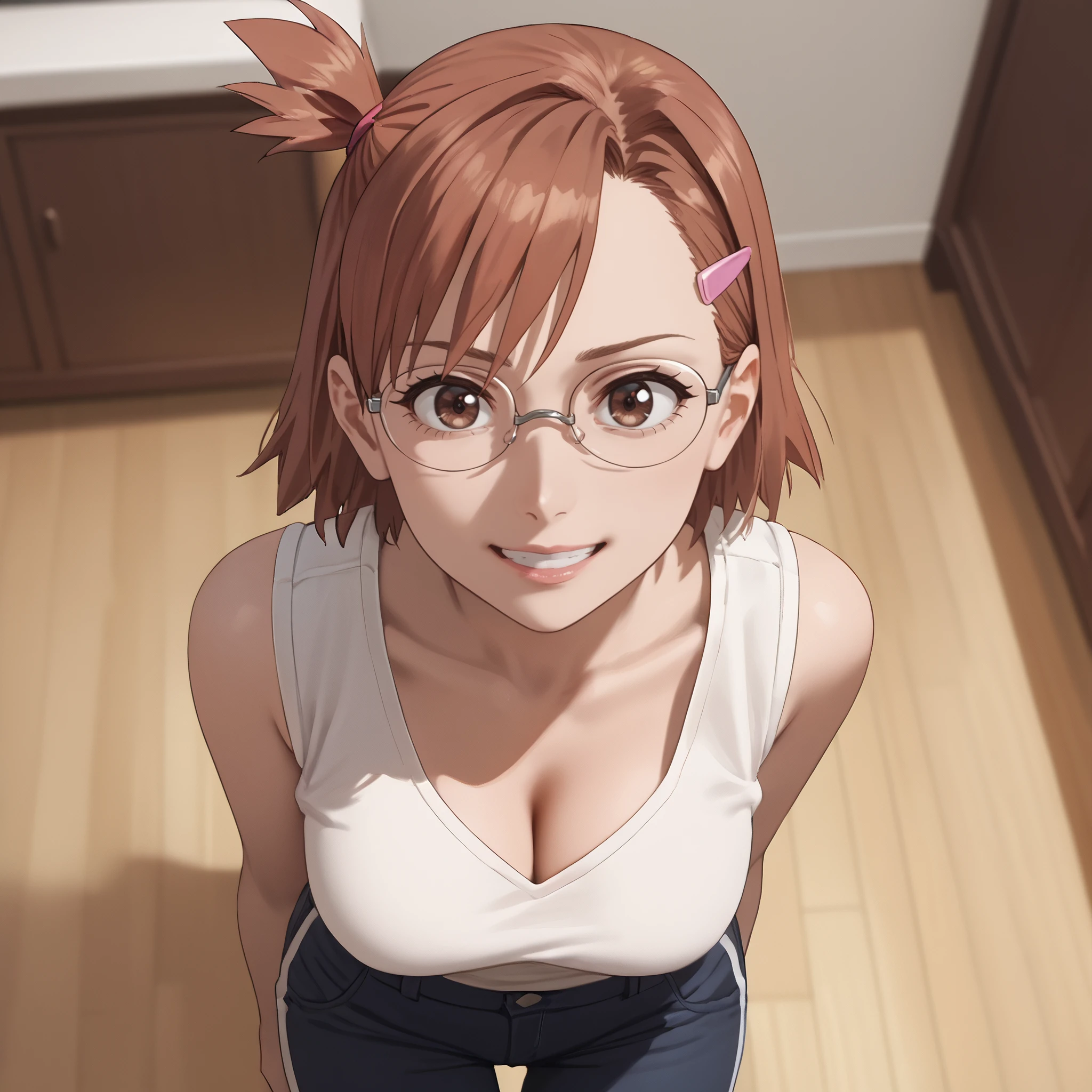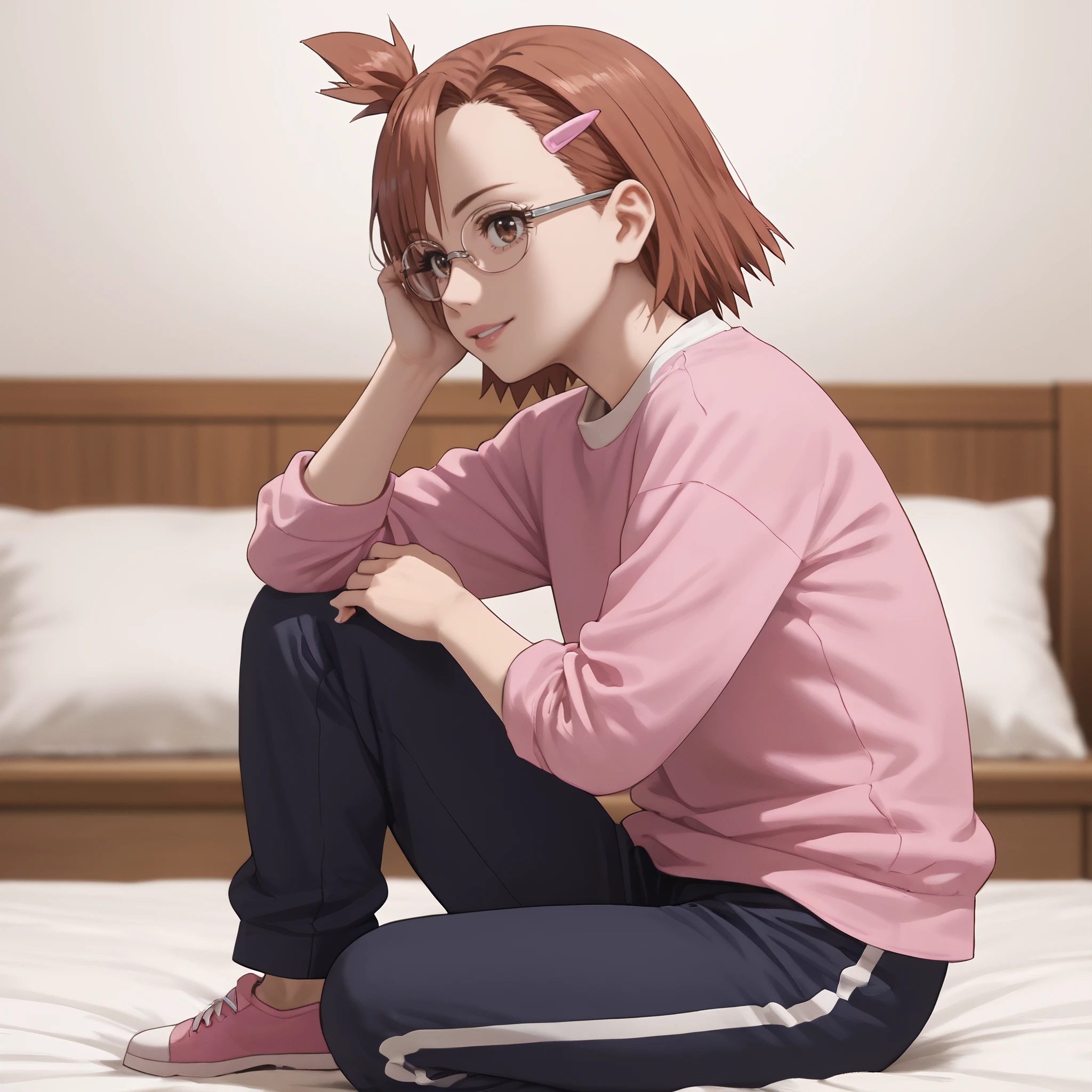 ARTHinako, short hair, glasses, hair ornament, hairclip, brown hair, brown eyes, bangs, black-framed eyewear, opaque glasses,