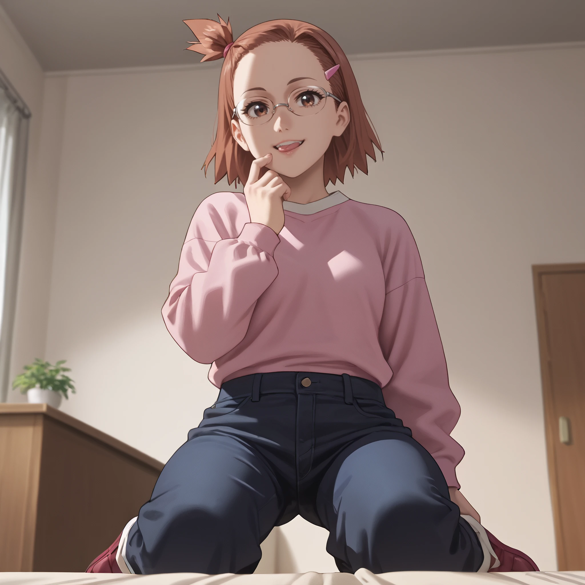 HinakoPink, shirt, pink shirt, long sleeves, pants, asymmetrical bangs,