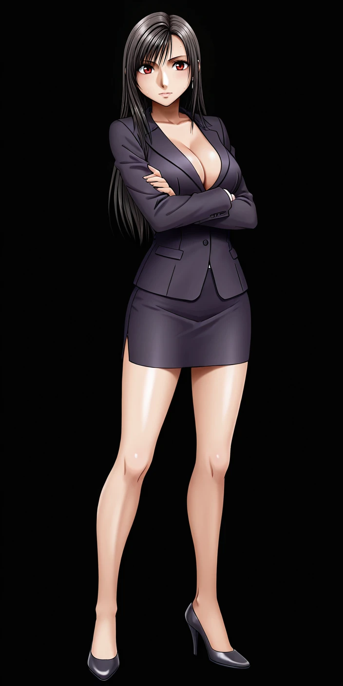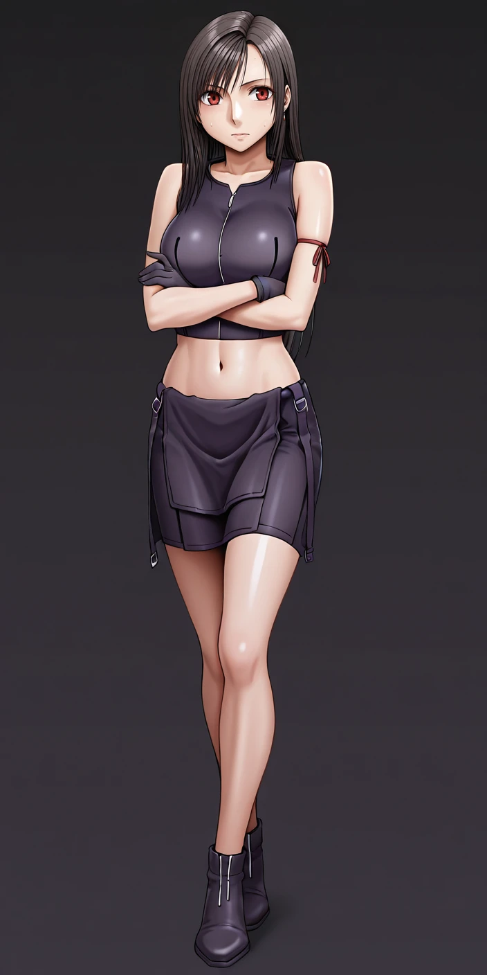 tifa, long hair, black hair, red eyes, earrings, large breasts, ribbon, ziper, sleeveless, shirt, navel, bare shoulders, black gloves, pencil skirt,