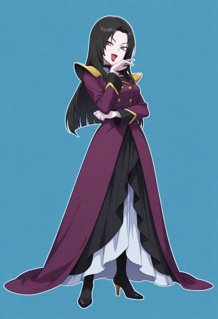 long coat, purple coat, gold trim, black dress, layered skirt, grey accents, high heels,