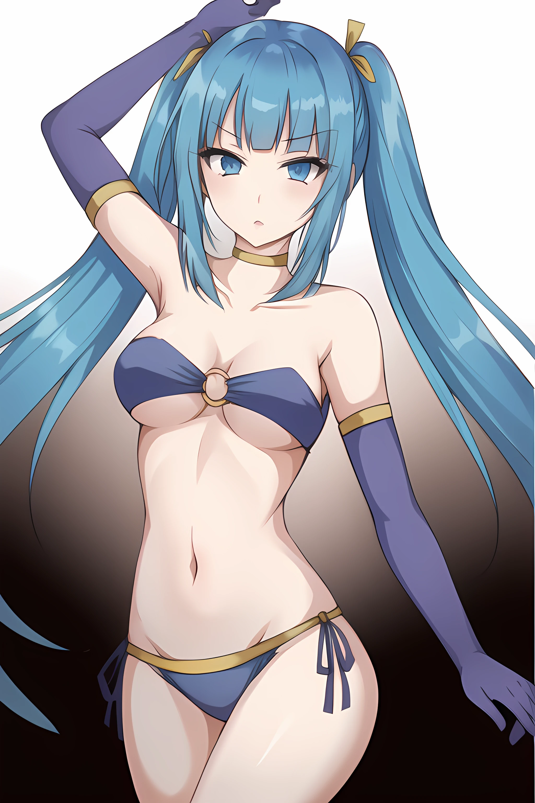 1girl, blue hair, blue eyes, twintails, long hair, choker, o-ring, bikini top, pelvic curtain, elbow gloves