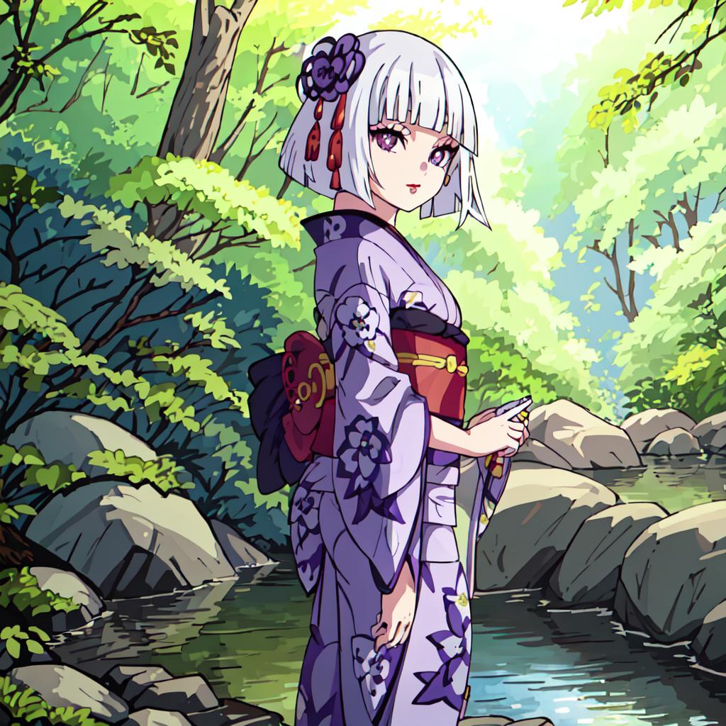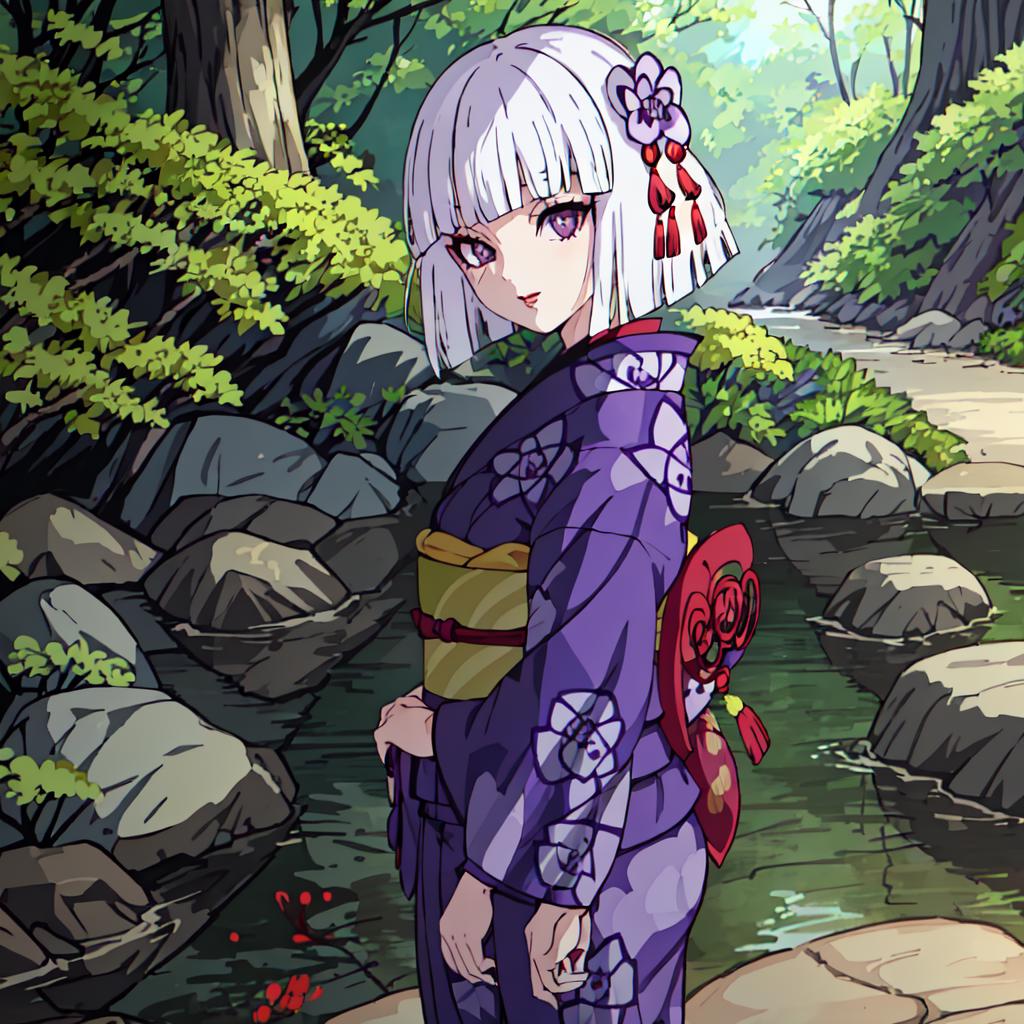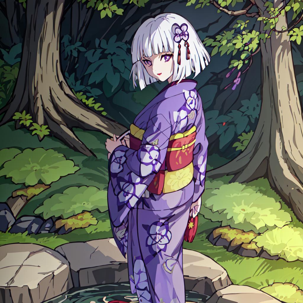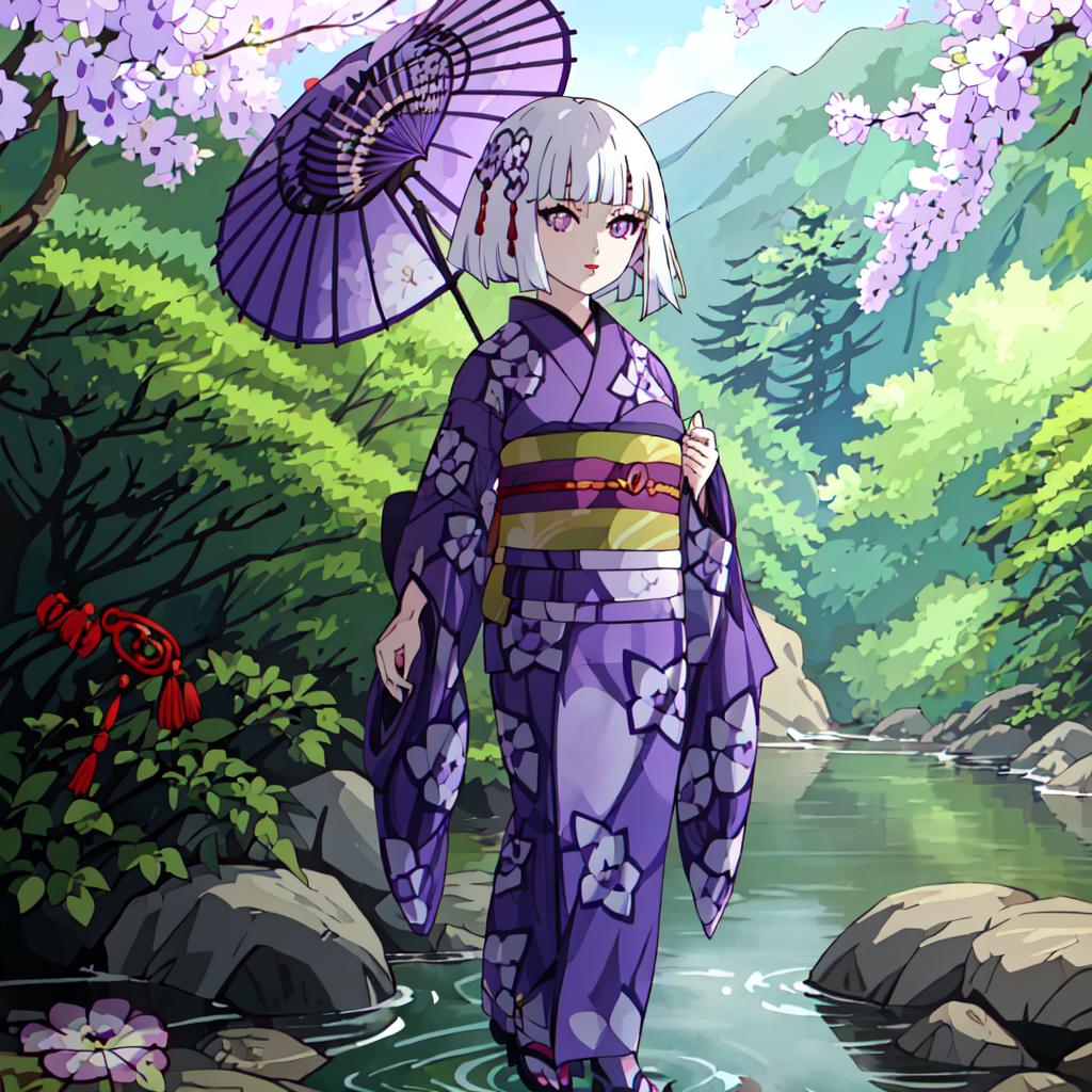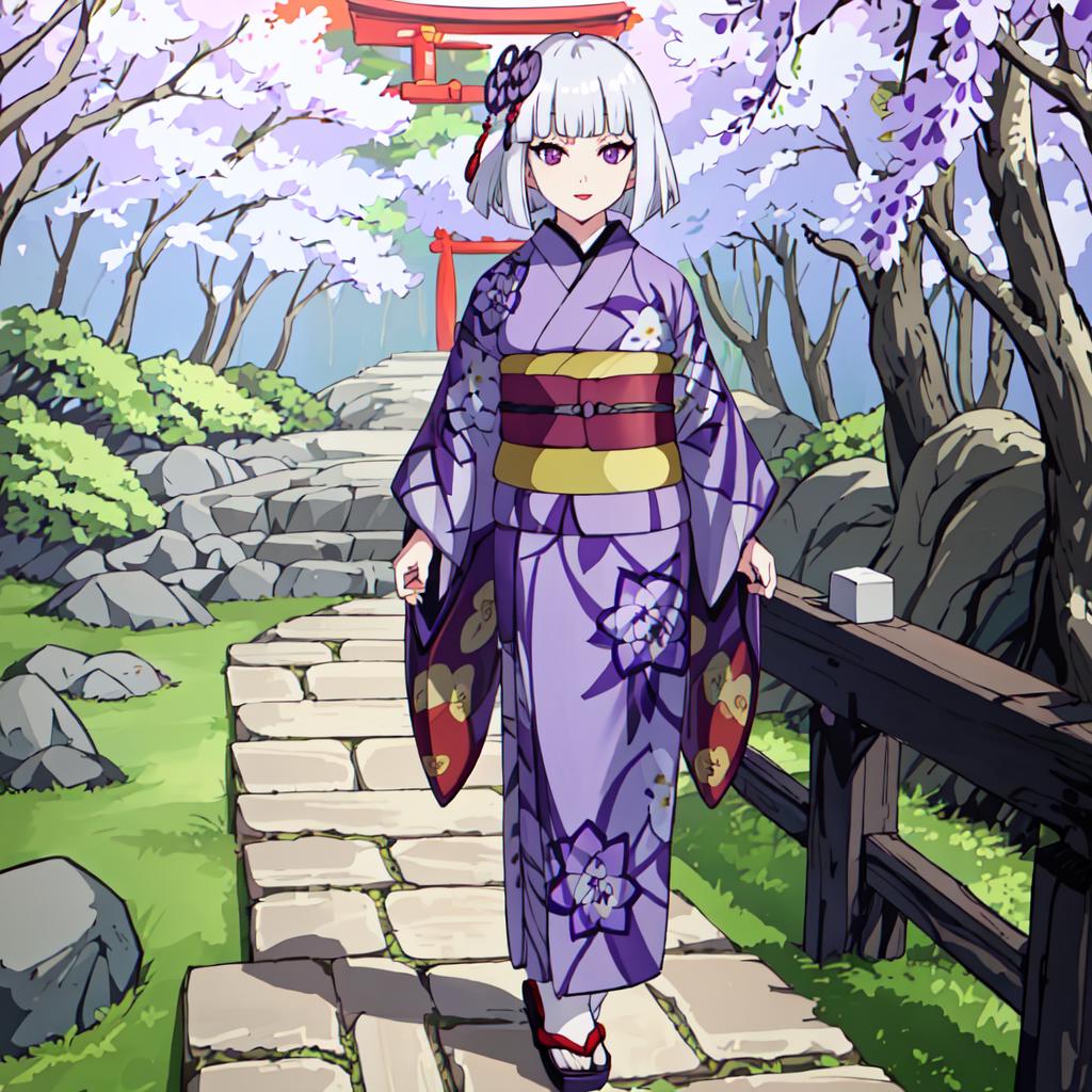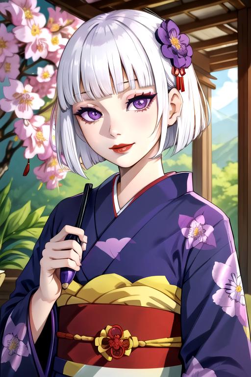 Hinaki, Kanata, Nichika, Kuina : Ubuyashiki_Family, 1girl, solo, short hair, hair ornament, flower, white hair, japanese clothes, blunt bangs, kimono, sash, makeup, obi, floral print, bob cut, lipstick, red lips, print kimono, ringed eyes, purple kimono, purple eyes, sandals