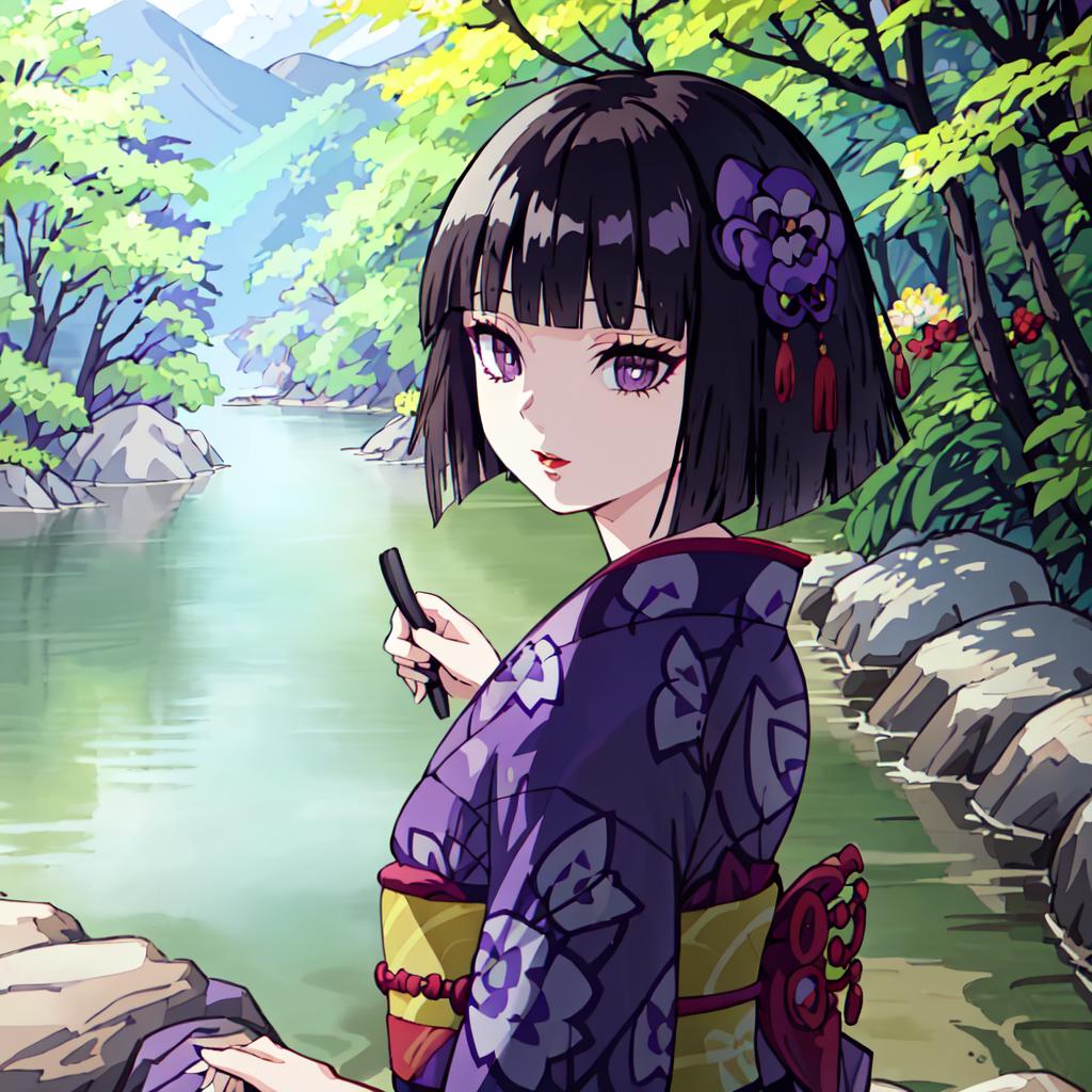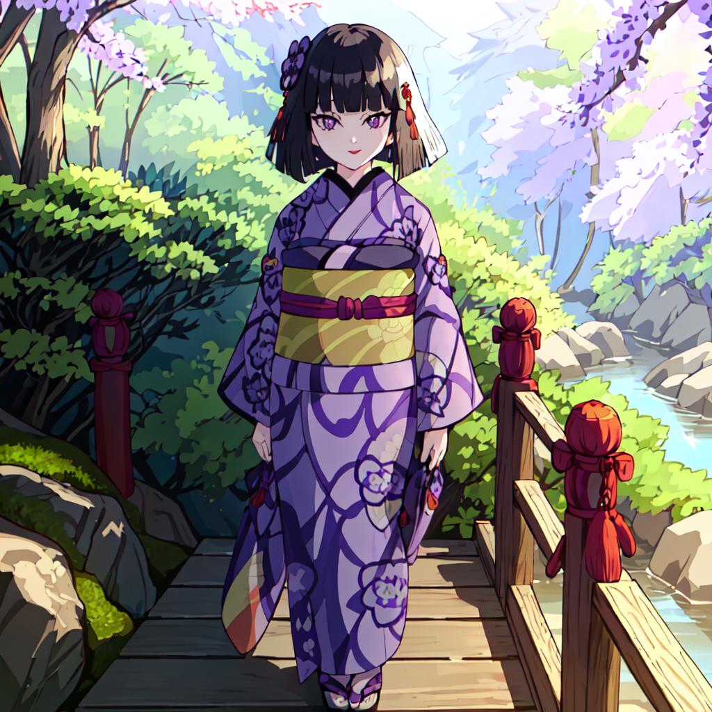 Kiriya : Ubuyashiki_Family, 1girl, solo, short hair, hair ornament, flower, black hair, japanese clothes, blunt bangs, kimono, sash, makeup, obi, floral print, bob cut, lipstick, red lips, print kimono, ringed eyes, purple kimono, purple eyes, sandals