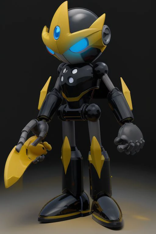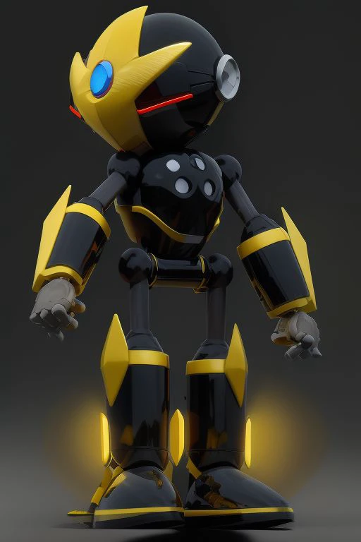 Gemerl, black robot, fin-like yellow kneecaps, fin-like yellow objects on forearms, spherical head with a gray mouth plate, blue eyes with red rims, and a curved yellow horn, blue gem in forehead