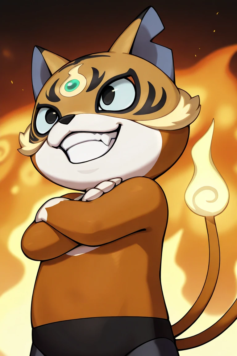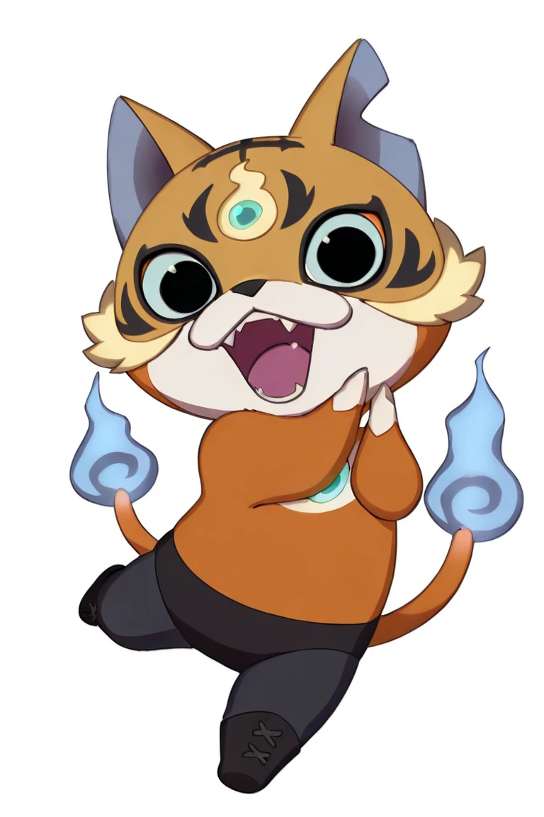 machonyan, orange body, mask, 2tails, flame tipped tail
