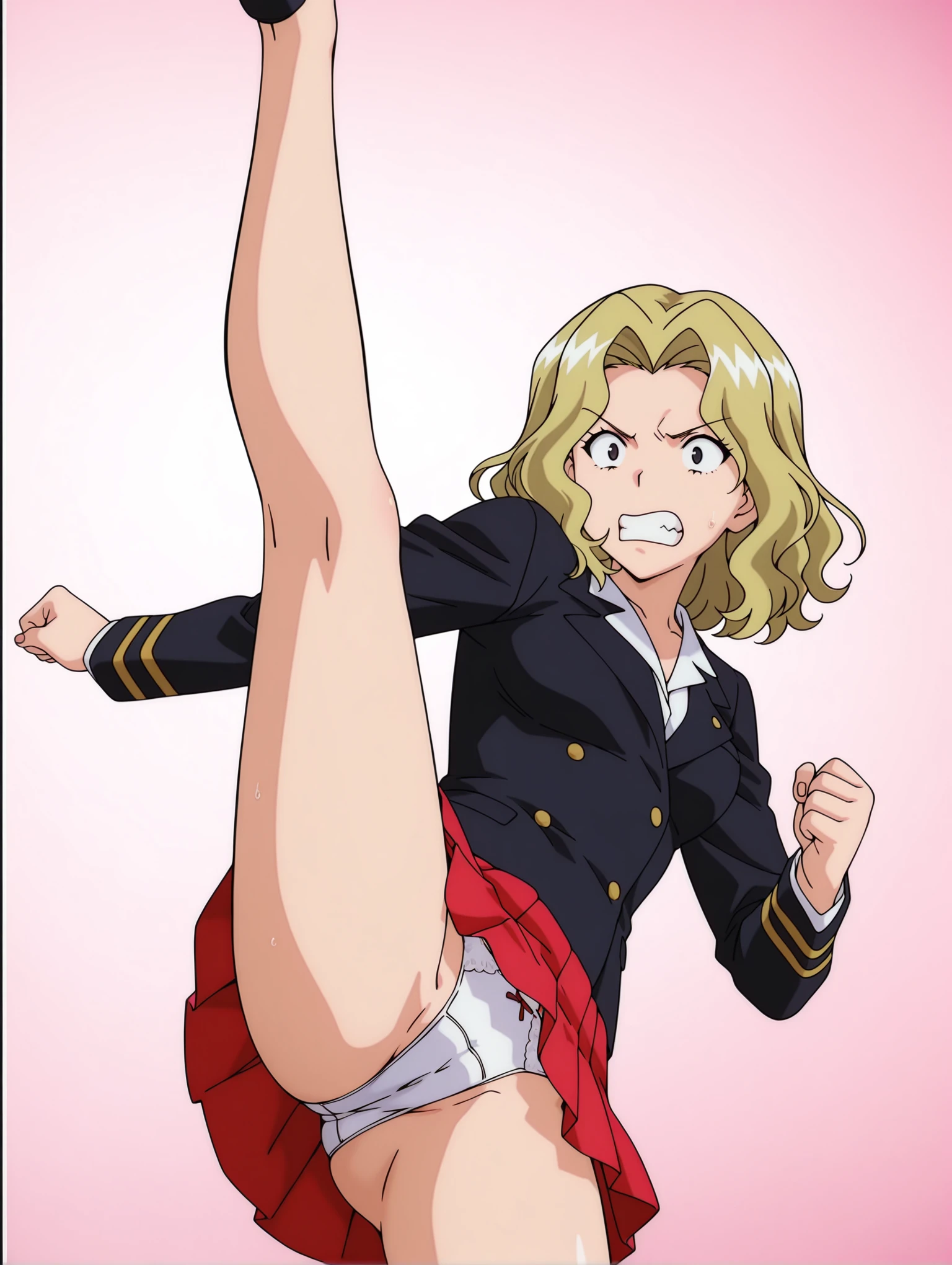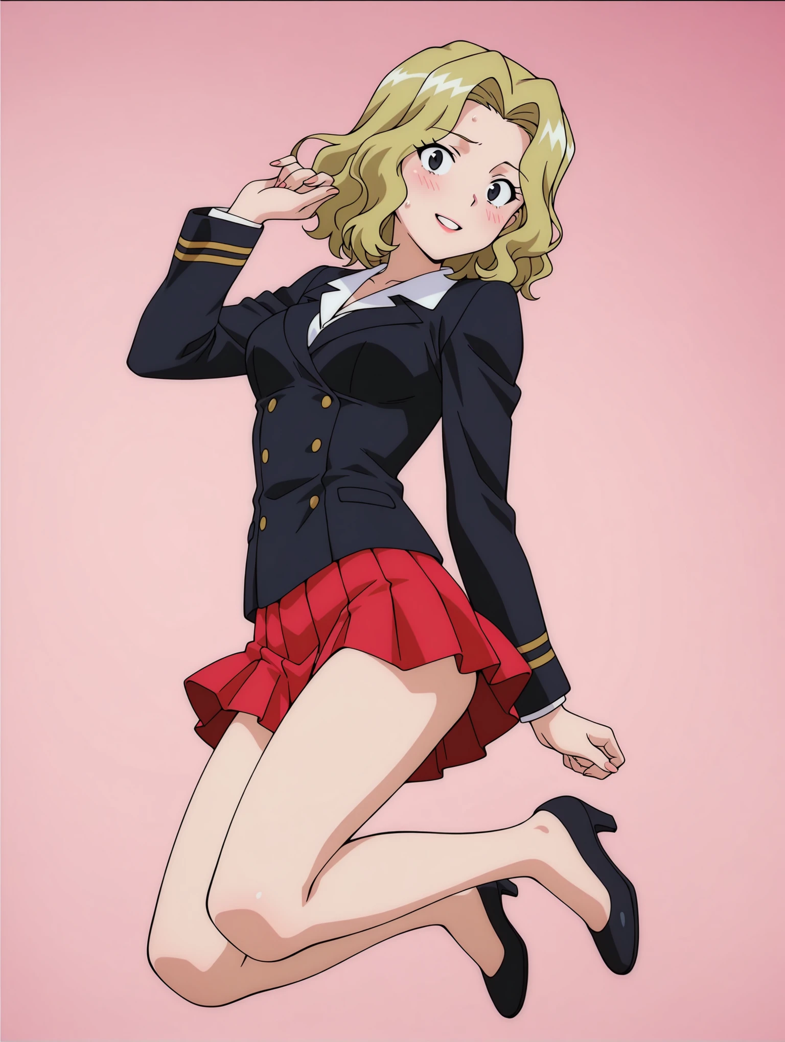 e_clothes,black jacket,red pleated skirt,white underwear,black high heels,