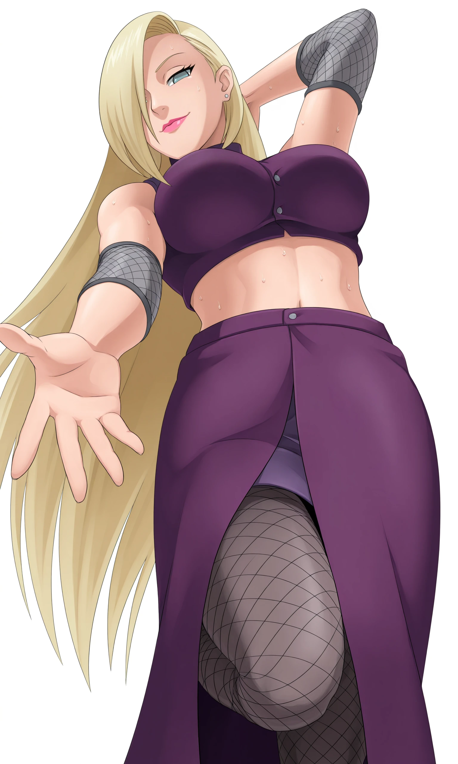inoyamanakathelast, earrings, blonde hair, very long hair, hair over one eye, blue eyes, lipstick, crop top, elbow warmers, midriff, purple skirt, long skirt, fishnet pantyhose, knee boots, toeless footwear
