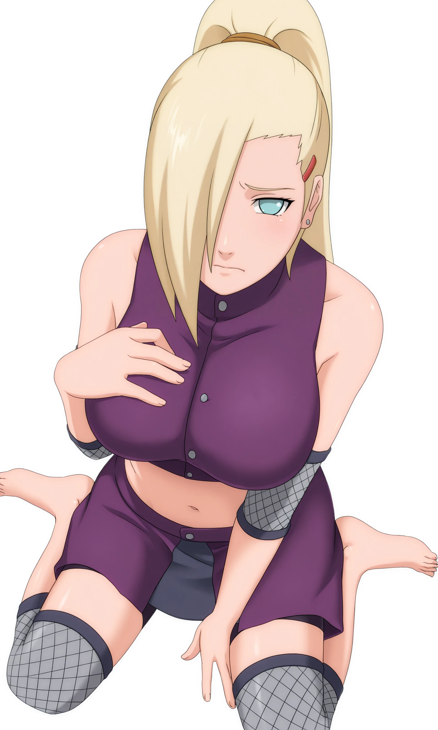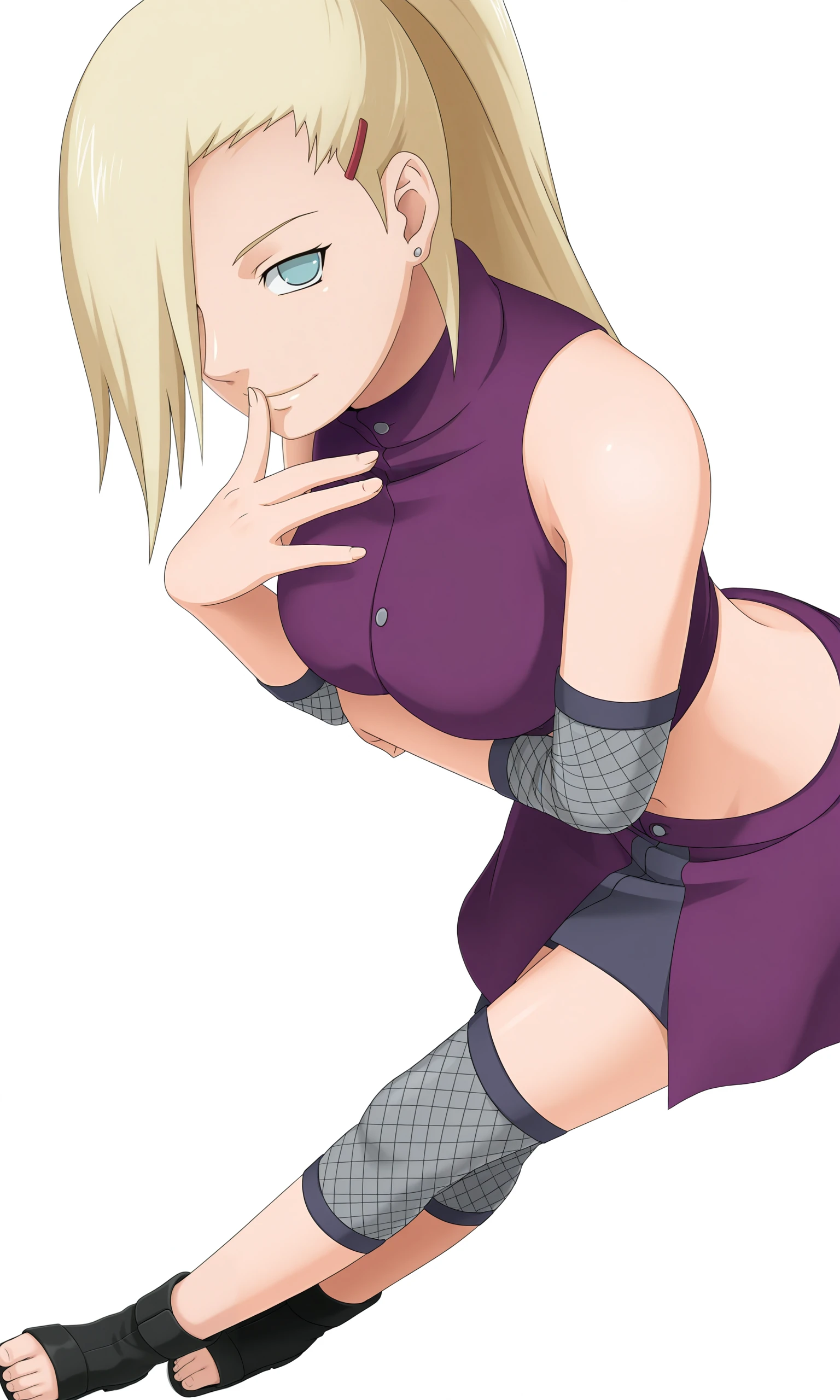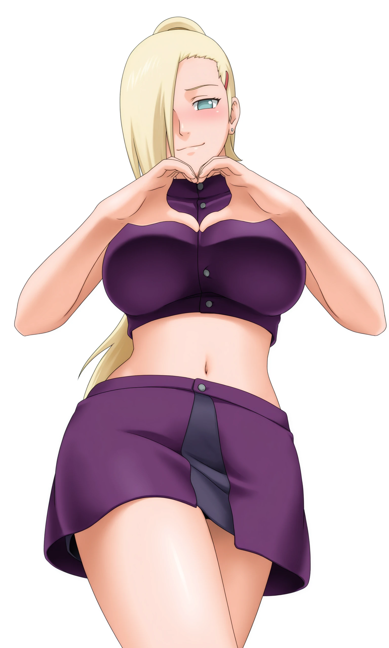 inoyamanakashippuden, long hair, blonde hair, hairclip, blue eyes, hair over one eye, earrings, high ponytail, crop top, elbow warmers, midriff, knee warmers, short skirt, toeless footwear,