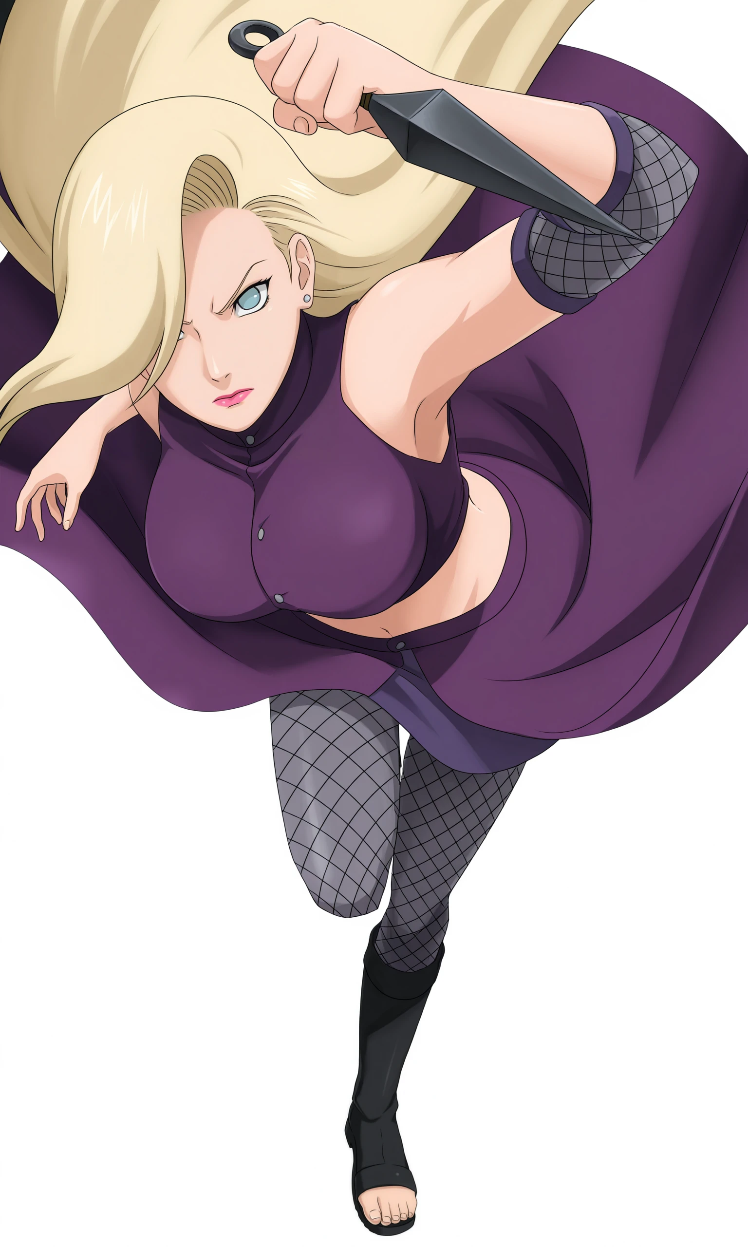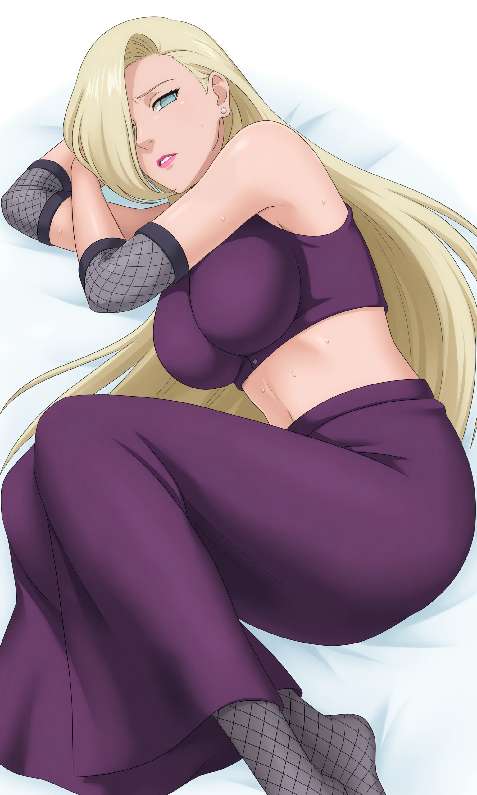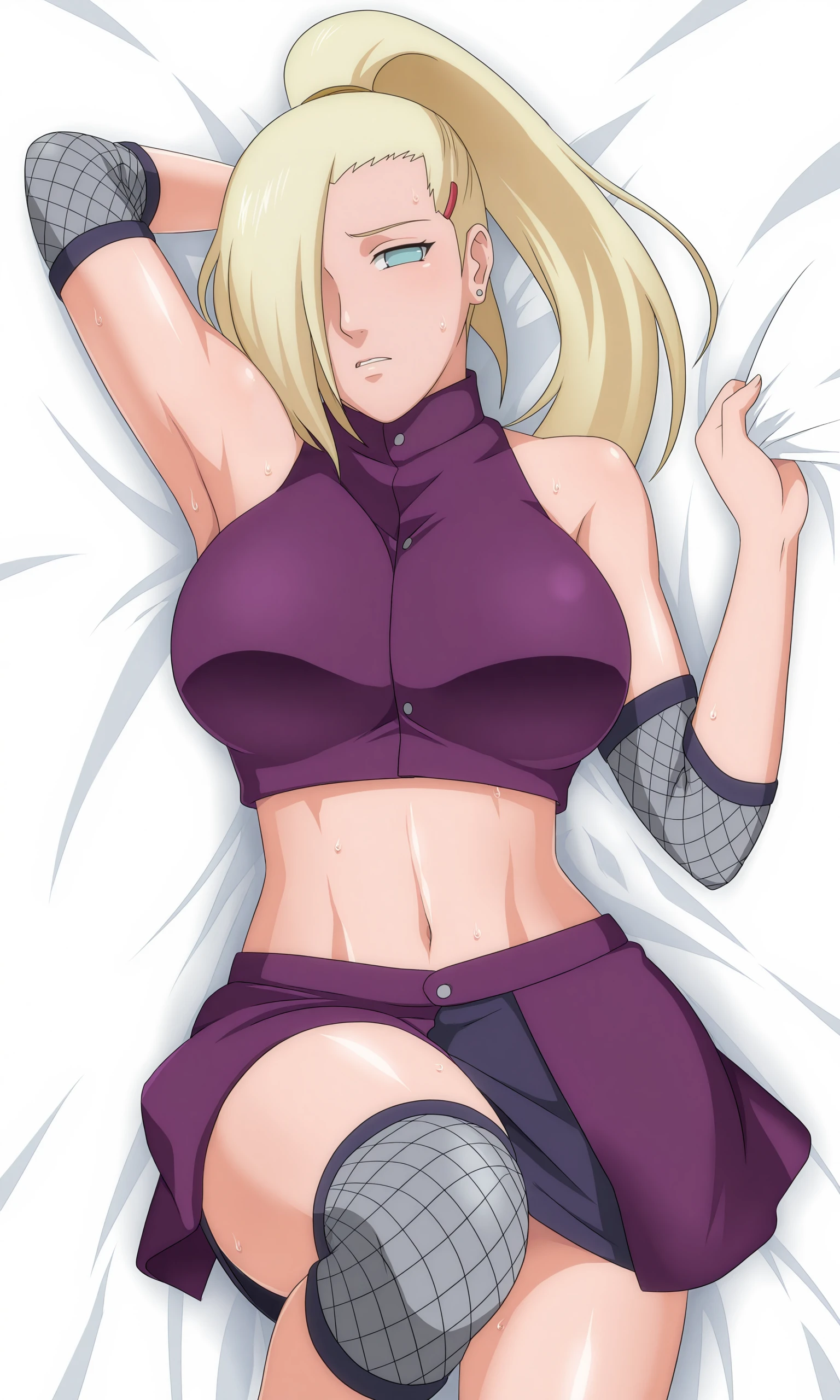 inoyamanakashippuden, long hair, blonde hair, hairclip, blue eyes, hair over one eye, earrings, high ponytail, crop top, elbow warmers, midriff, knee warmers, short skirt, toeless footwear,
