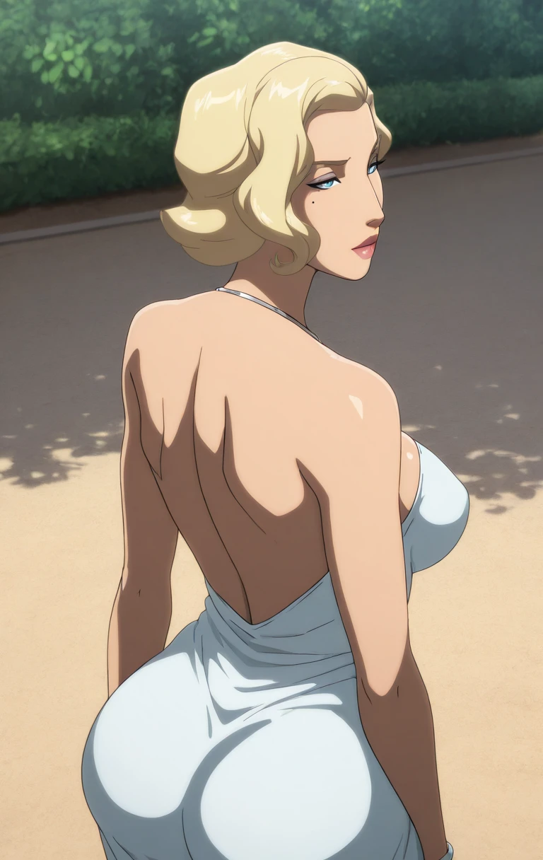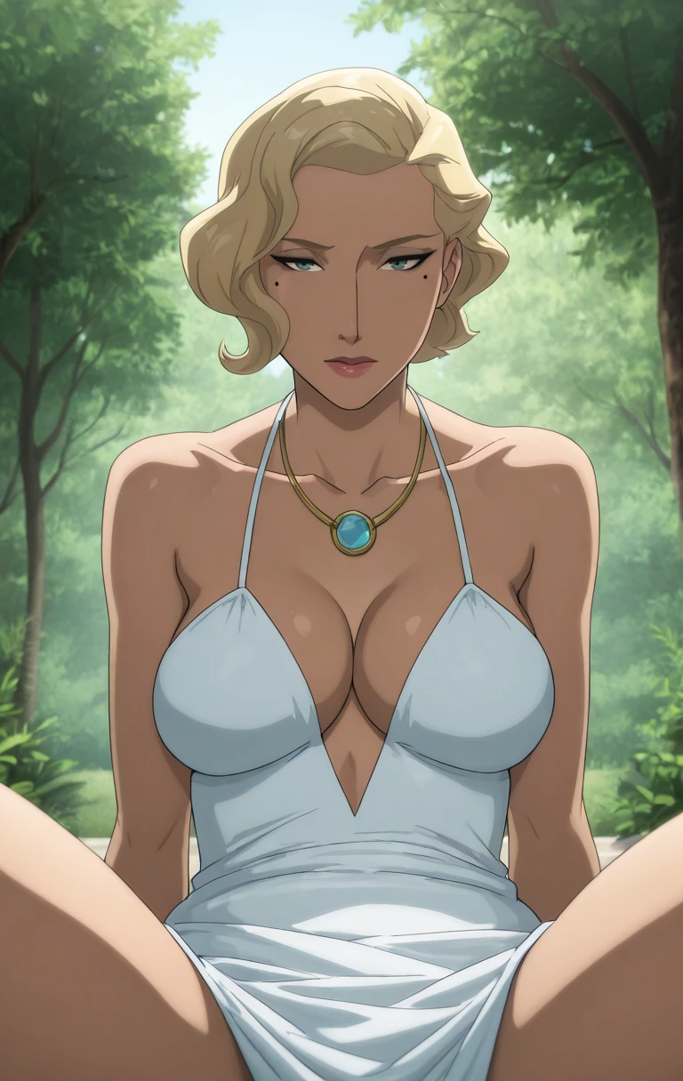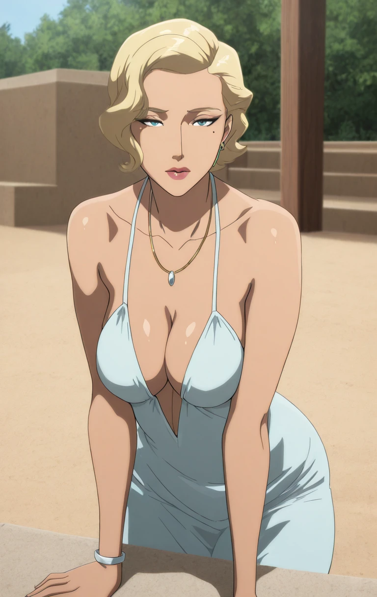 1girl, solo, breasts, dress, short hair, blue eyes, blonde hair, cleavage, bare shoulders, medium breasts, collarbone,bl0nd3b4tm4nvsr0b1c,