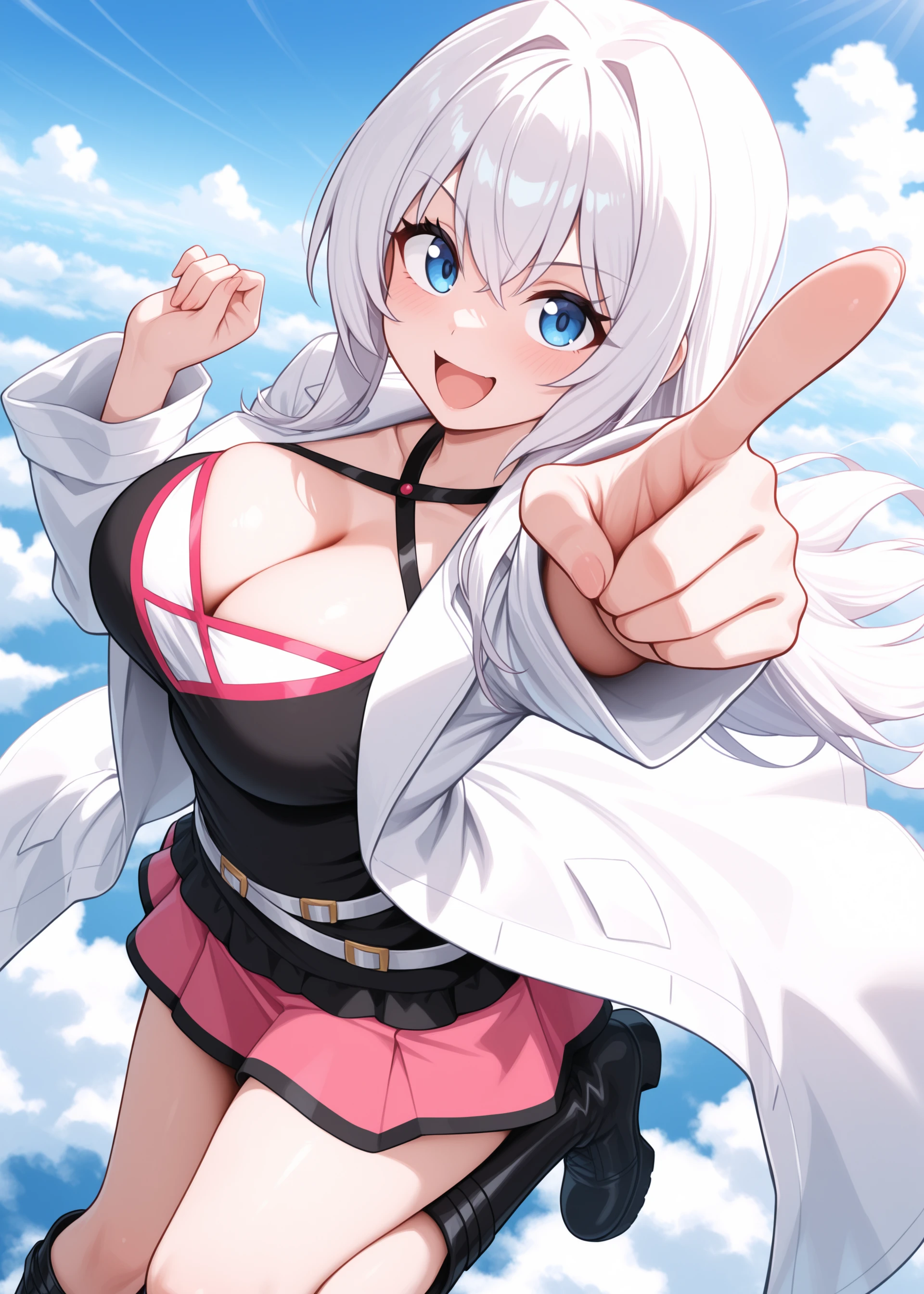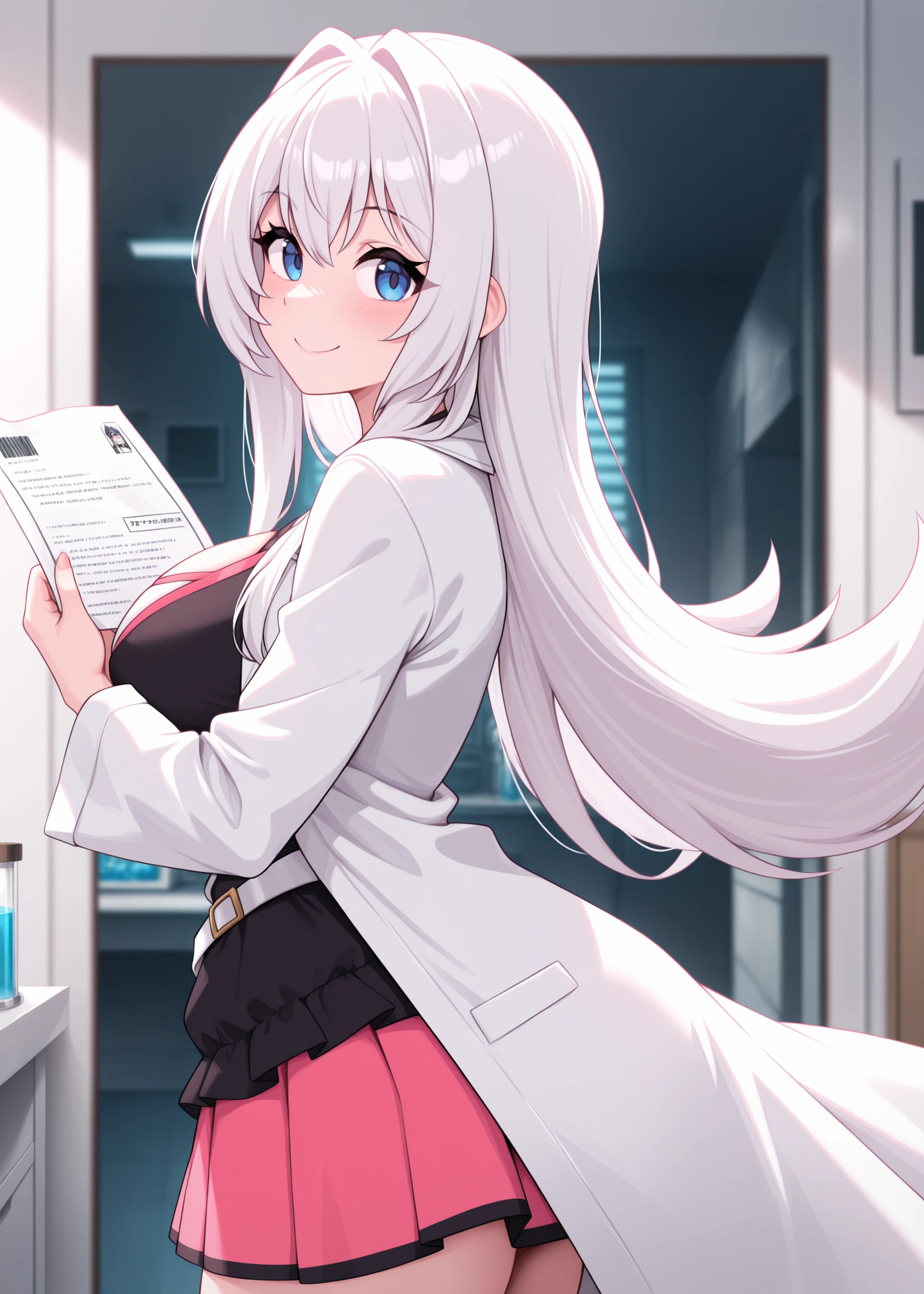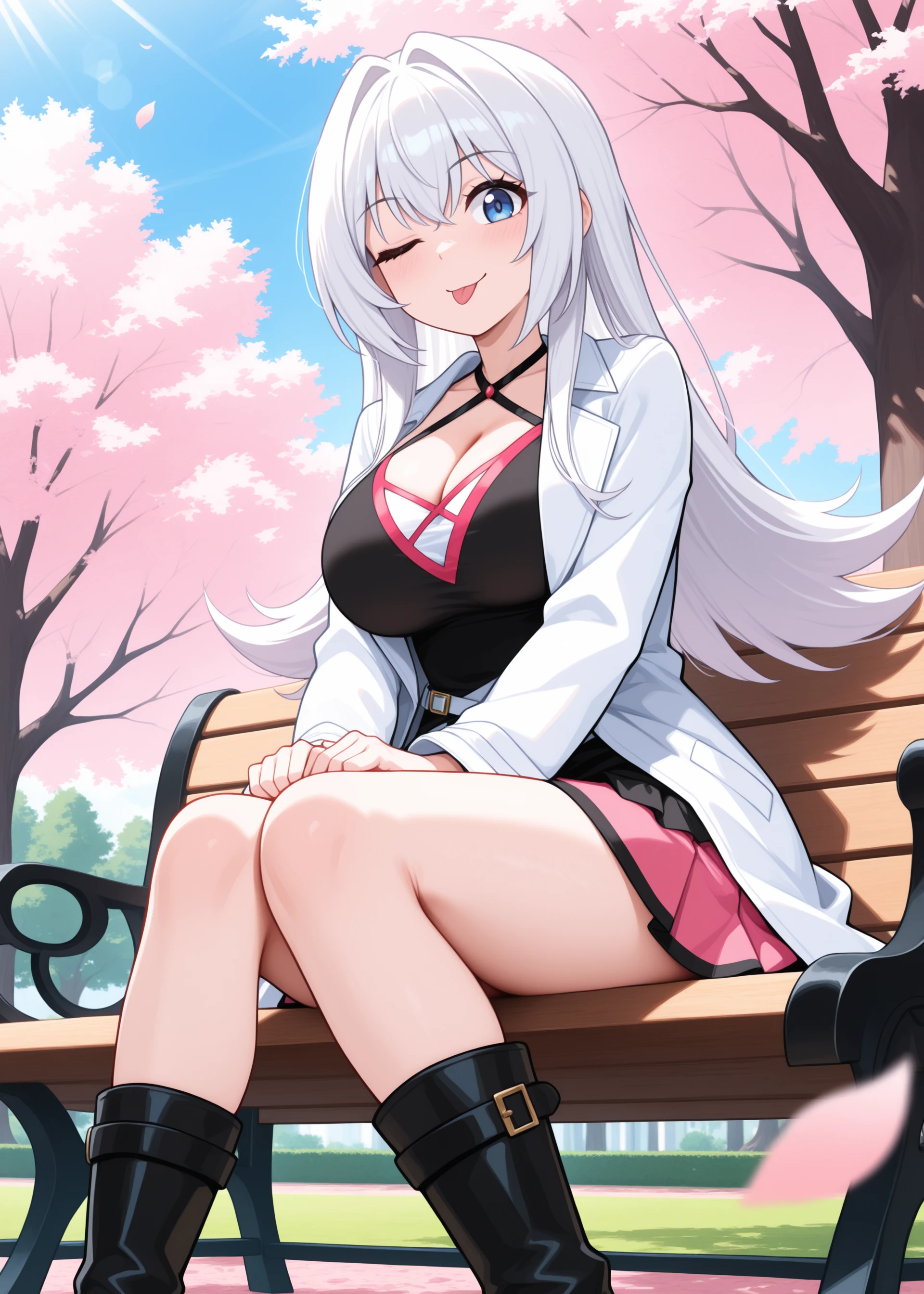 white lab coat, short black dress, pink skirt, pleated skirt, black boots