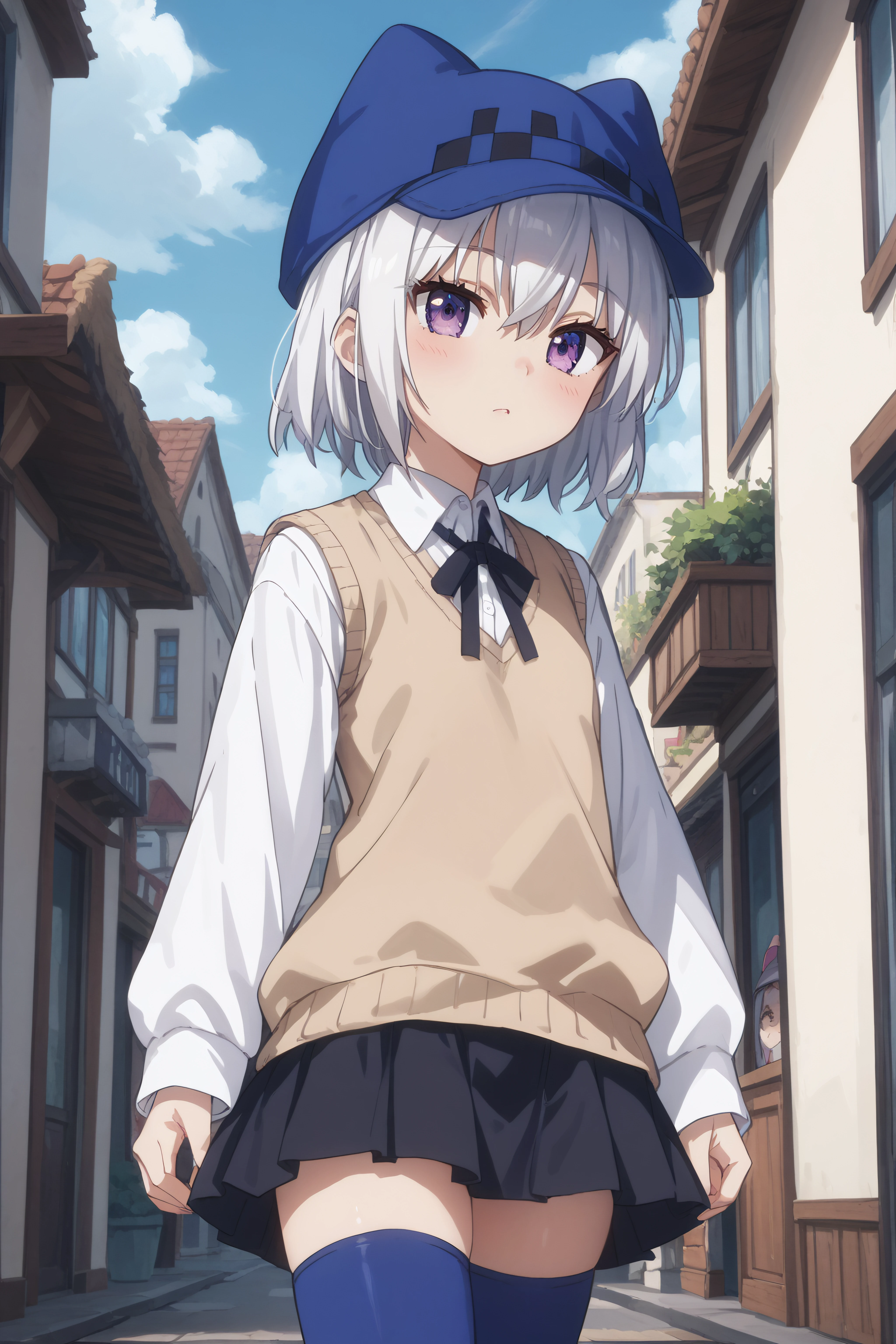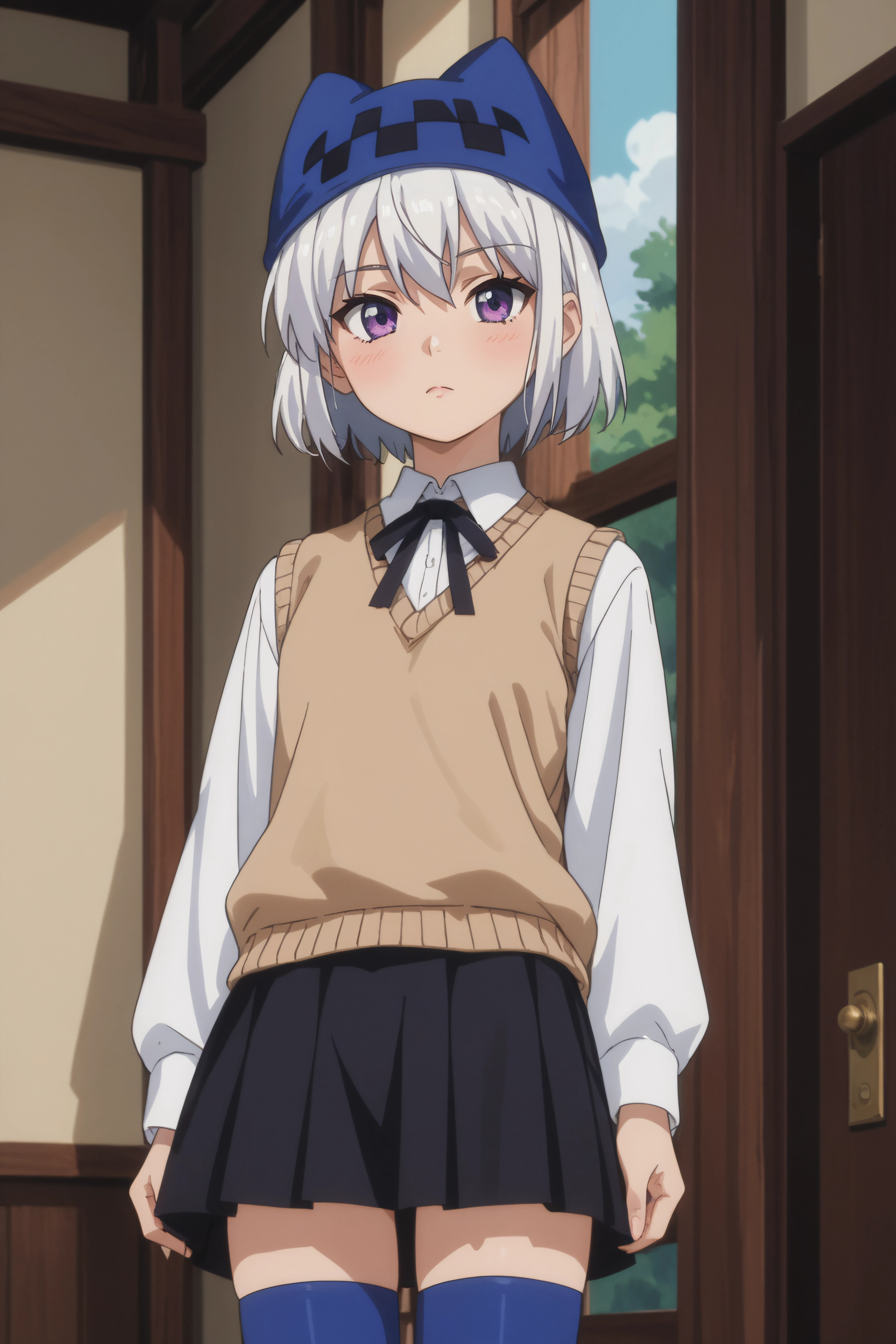 athena, purple eyes, white hair, short hair, hat with ears, beige sweater vest, white shirt, black neck ribbon, long sleeves, black skirt, blue thighhighs, standing,