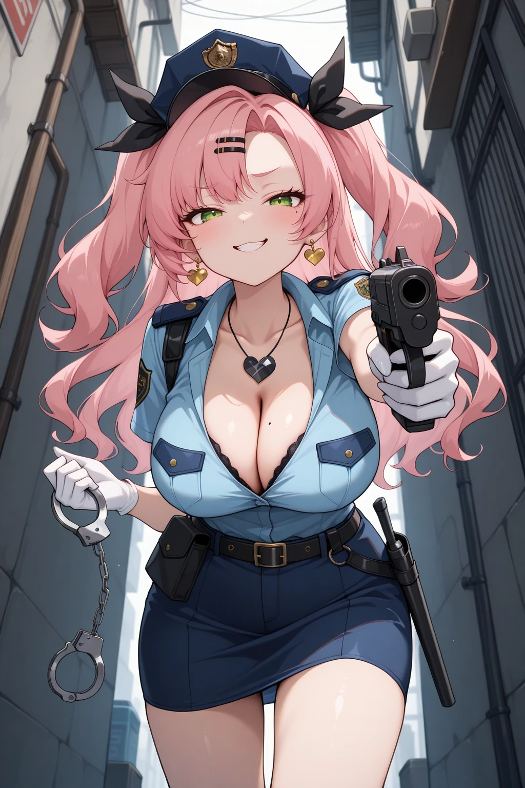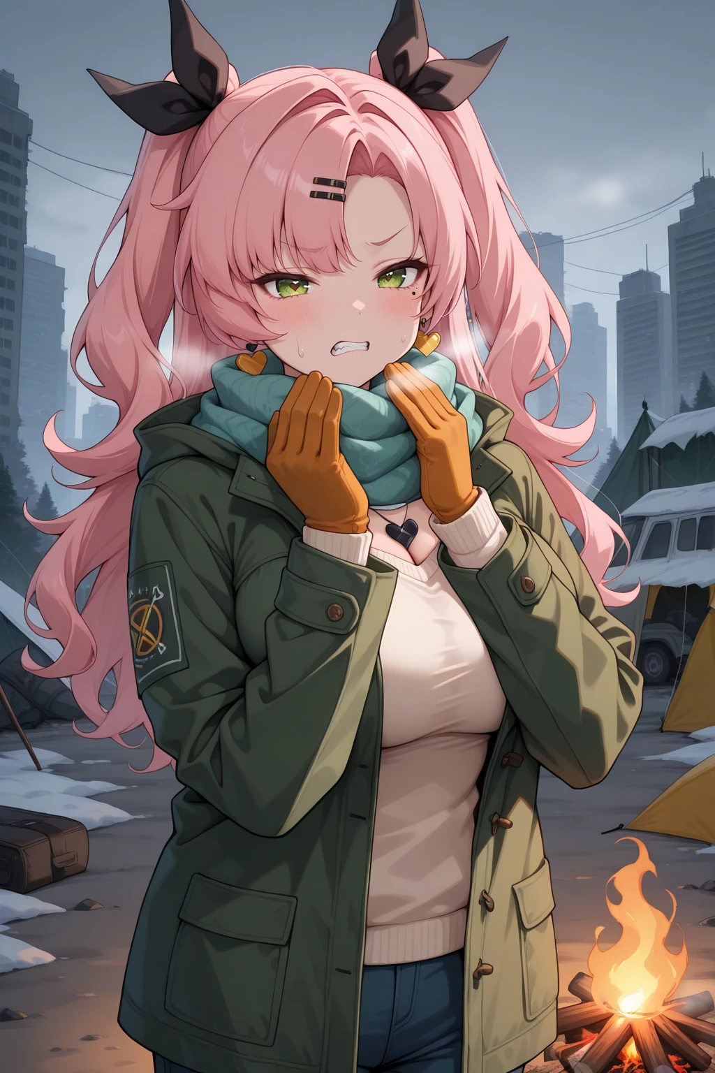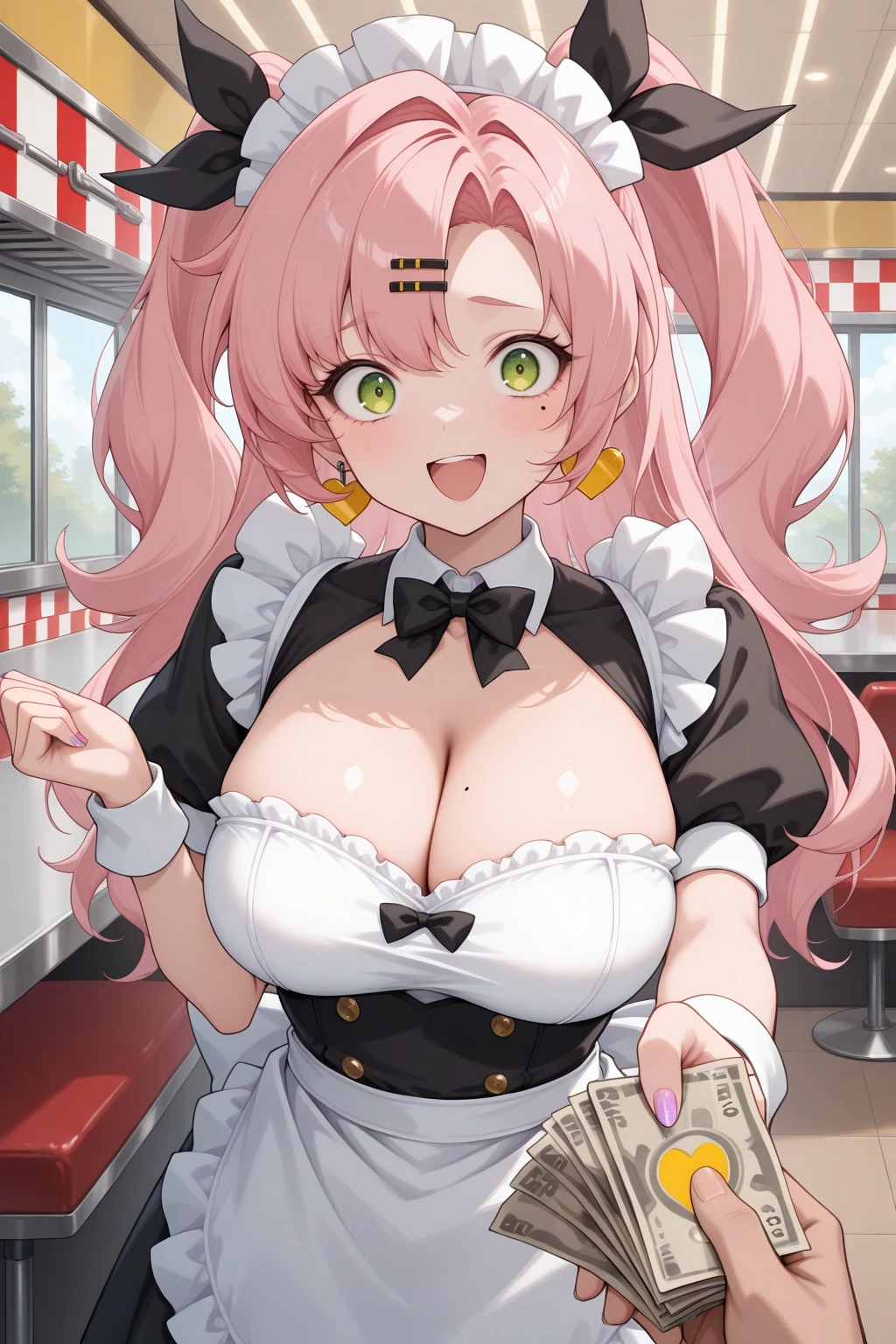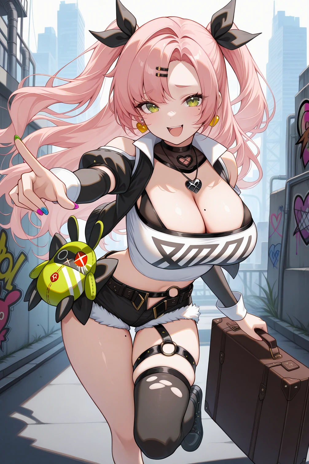 Appearance : n1c0le, large breasts, green eyes, multicolored nails, pink hair, asymmetrical bangs, long hair, two side up, hair ribbon, black ribbon, hairclip, yellow heart earrings, heart necklace, black necklace