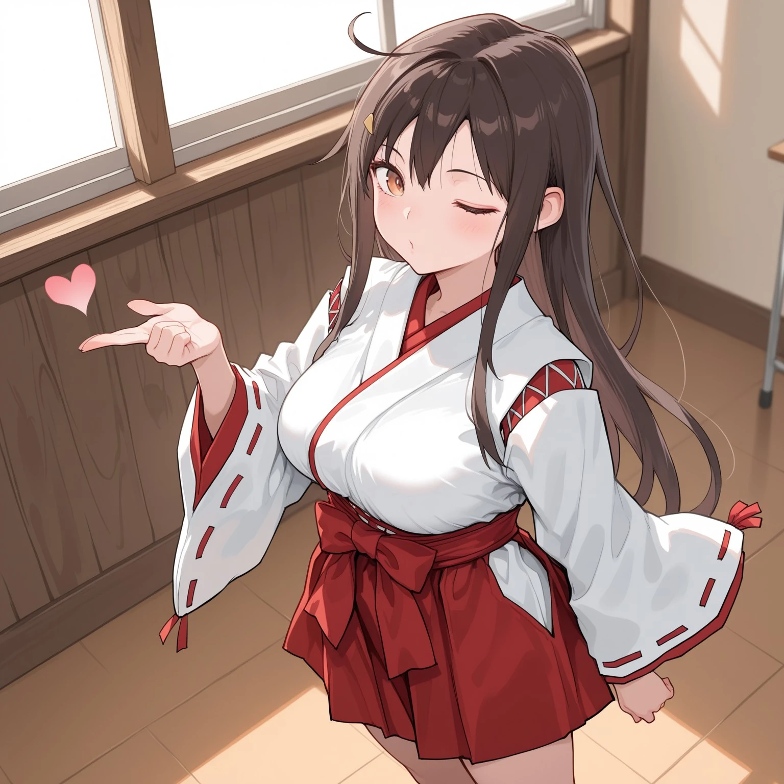 color: kagill, 1girl, ahoge, brown eyes, brown hair, hair ornament, long hair, breasts,