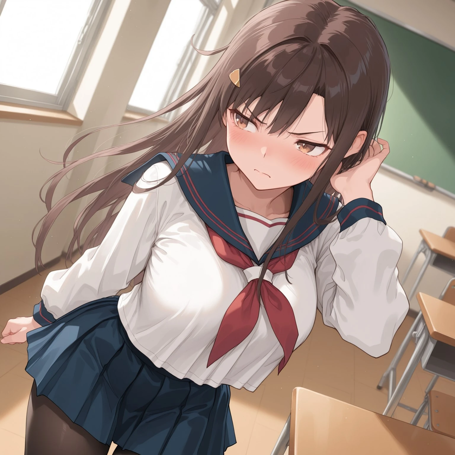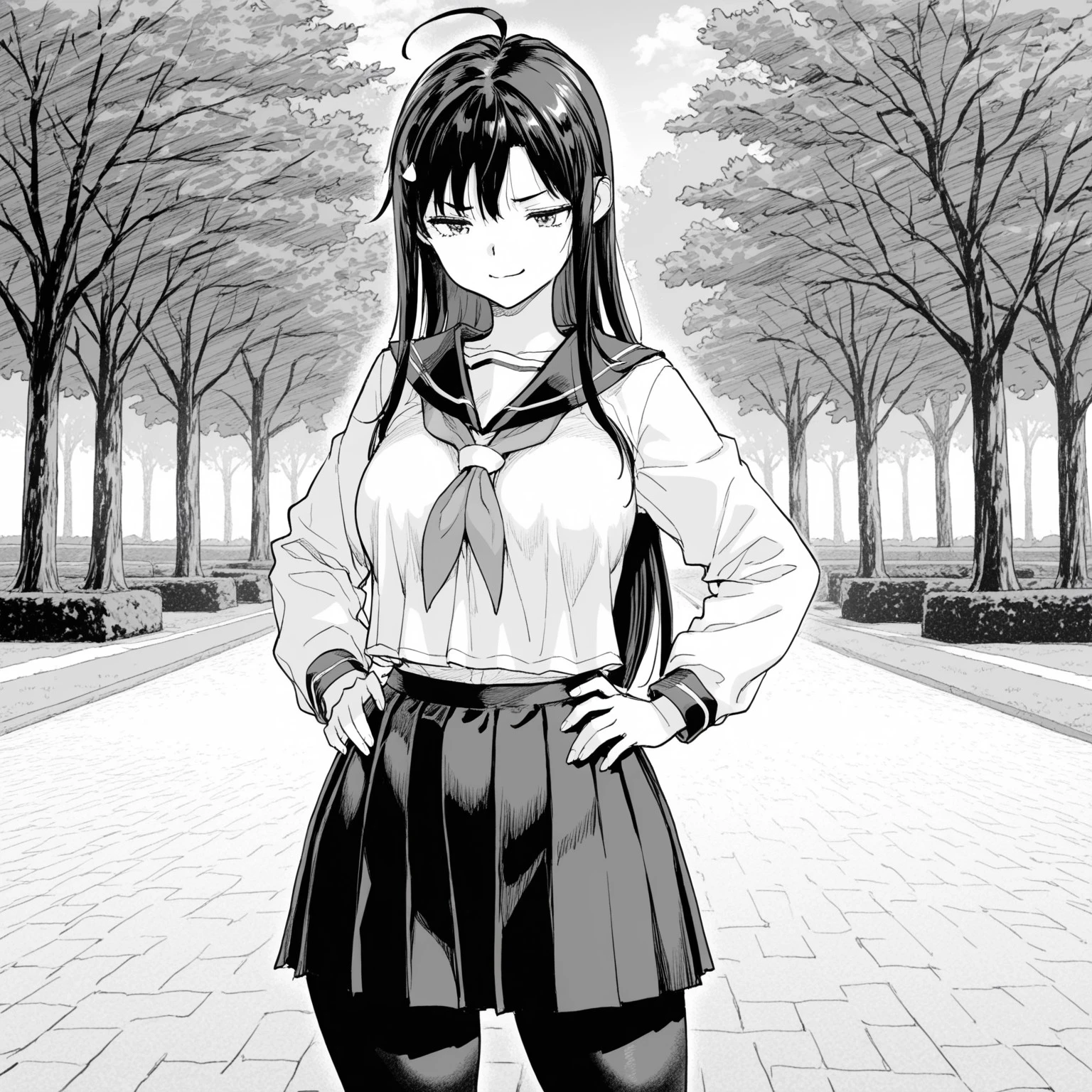 1. kagsch, 1girl, school uniform, skirt, pleated skirt, long sleeves, white shirt, shirt, neckerchief, serafuku, pantyhose, sailor collar