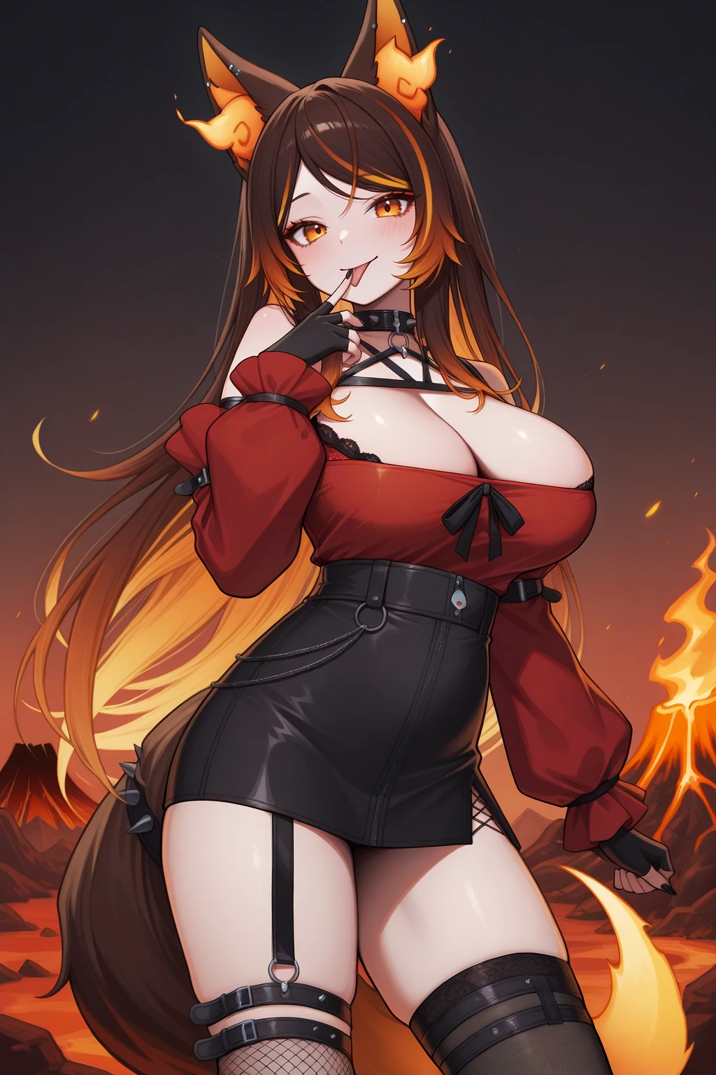 Outfit 1 : flame-tipped tail, tail belt, spiked choker, chest harness, off-shoulder shirt, red shirt, cleavage, bra peek, lace-trimmed bra, black ribbon, detached sleeves, red sleeves, puffy sleeves, arm strap, black high-waist skirt, pencil skirt, zipper, o-ring thigh strap, chain, asymmetrical legwear, fishnet thighhighs, black thighhighs, elbow gloves, black gloves, fingerless gloves