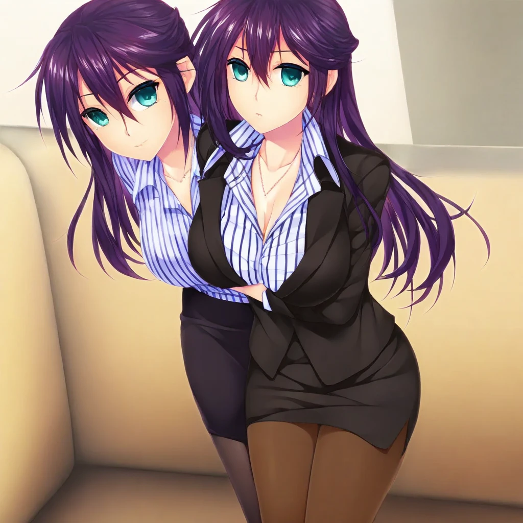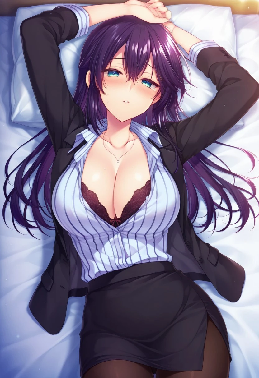 ryouko-suit, skirt suit, black blazer, collared shirt, striped shirt, necklace, black skirt, pencil skirt, pantyhose,