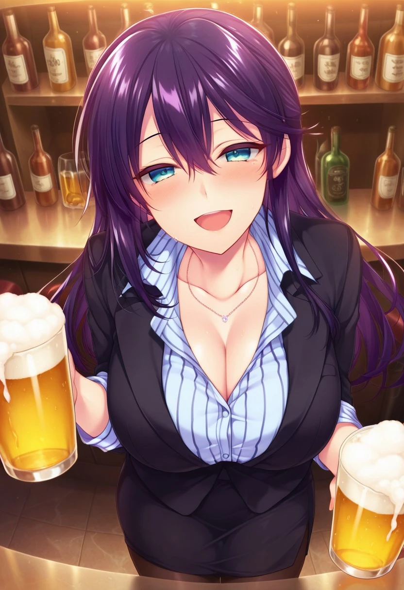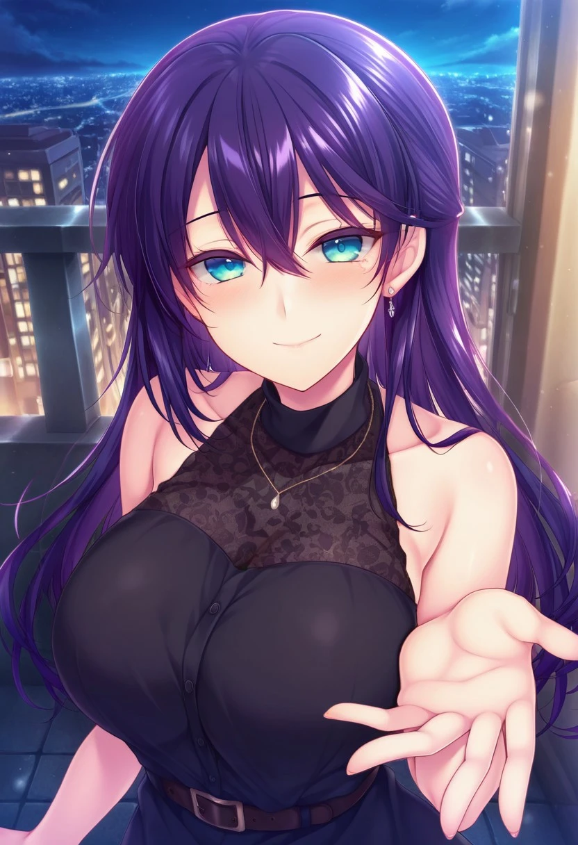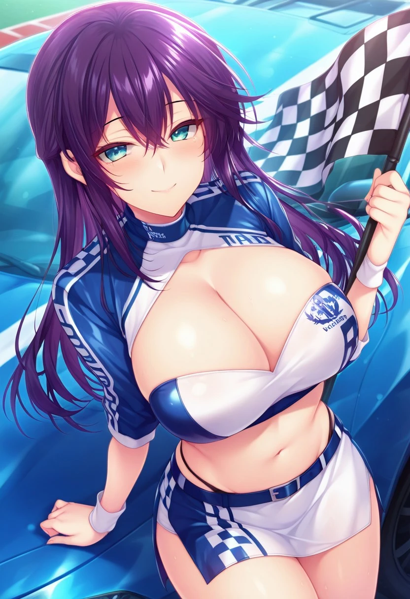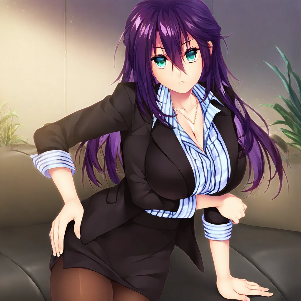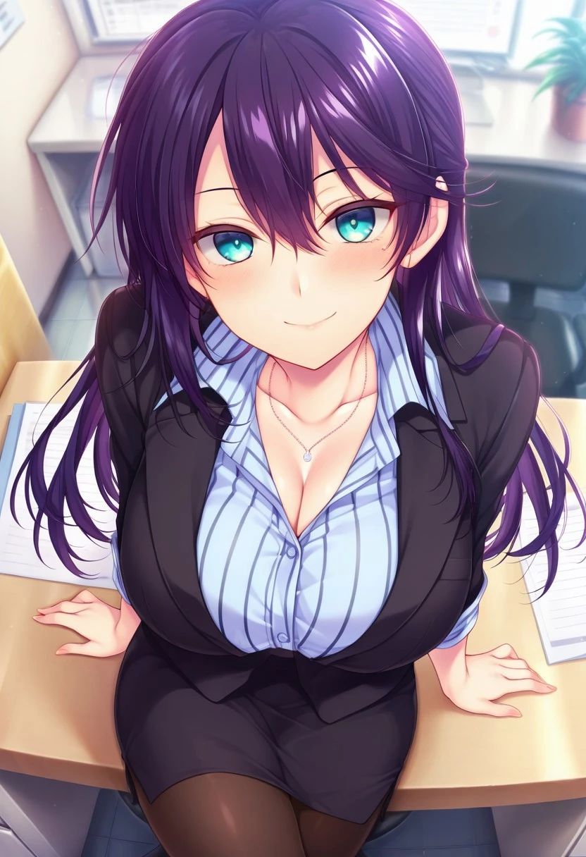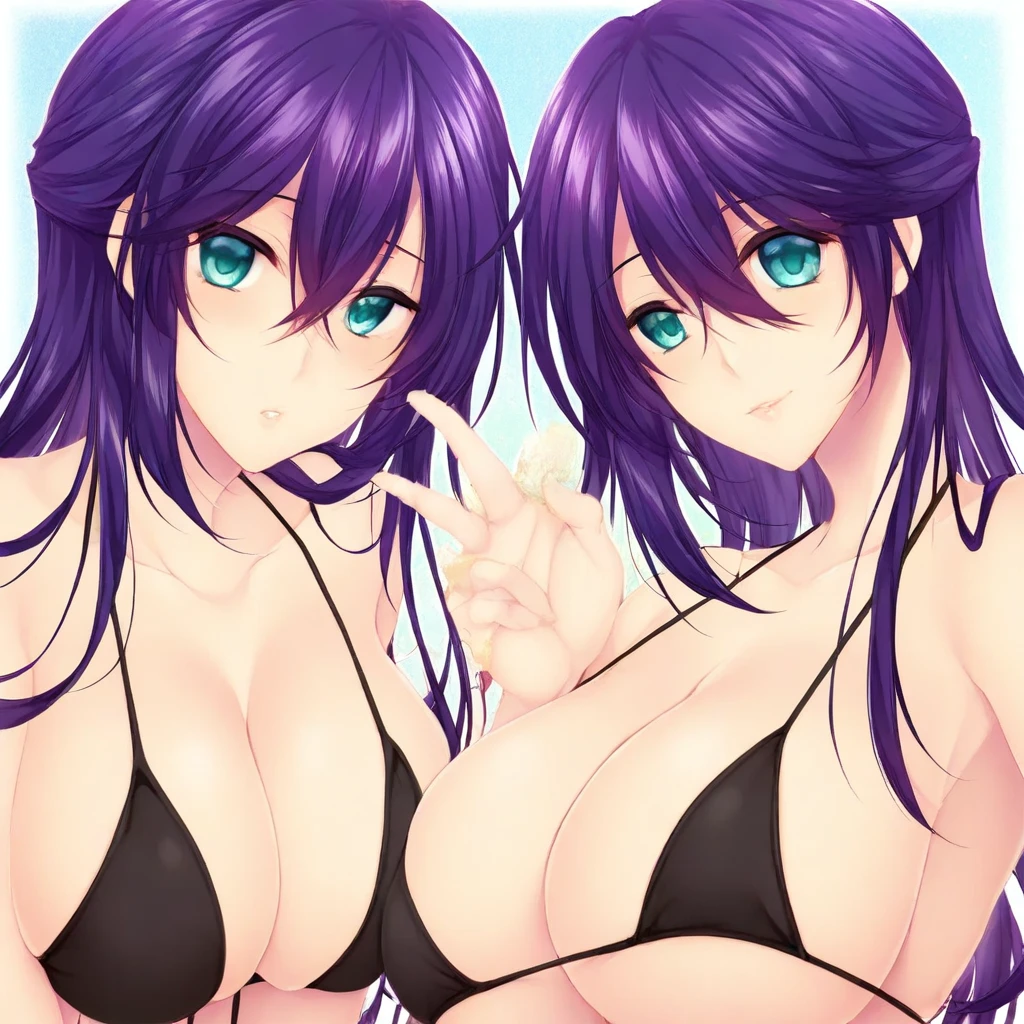 long hair, purple hair, hair between eyes, aqua eyes, large breasts,