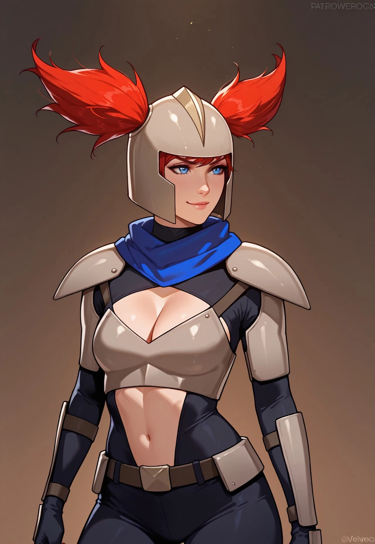 V.2 - helmet, hair through helmet, bodysuit, blue scarf, cleavage, naval, breastplate, shoulder armor, belt, gauntlets,