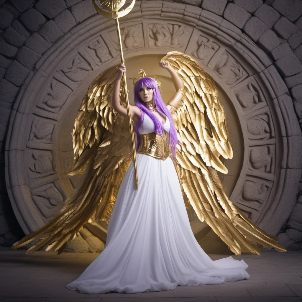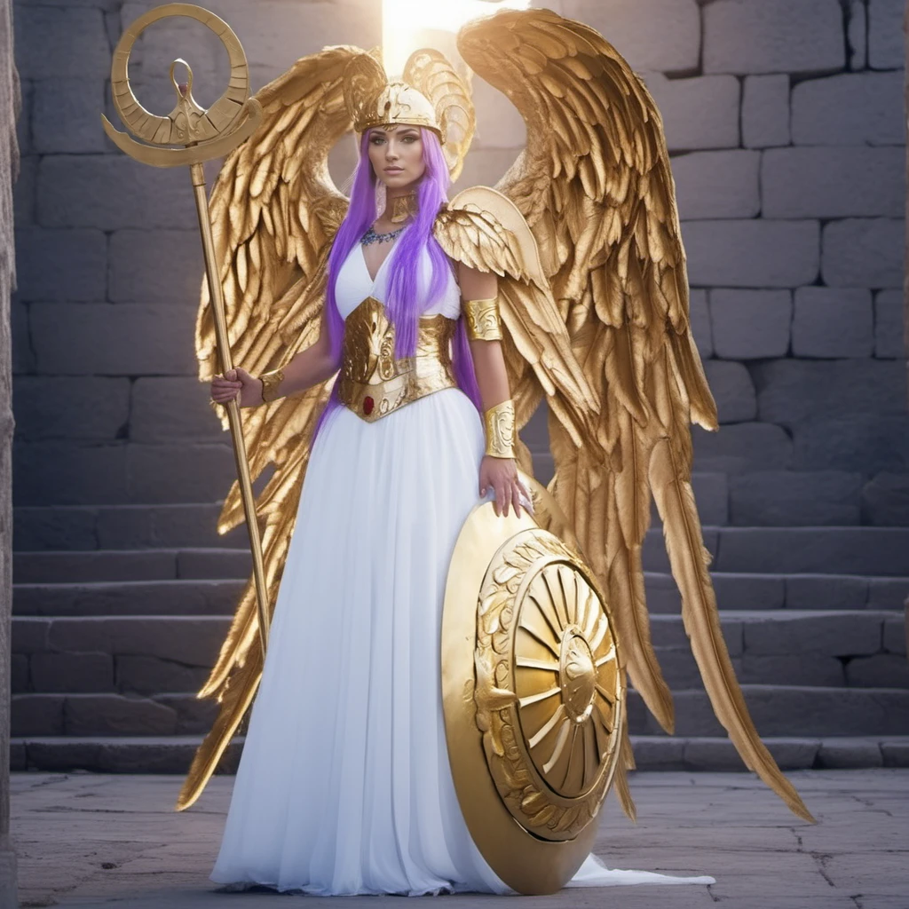golden armor and a golden helmet, golden wings, holds a golden stick and a golden shield