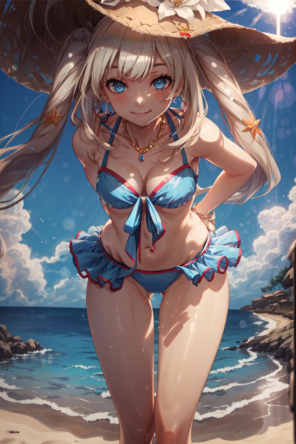 an anime drawing with a sexy lady dressed up in swim wear holding a sphere, 1girl, marie antoinette (fate), ball, solo, long hair, swimsuit, hat, beachball, blue eyes, bikini, breasts, blue bikini, flower, smile, twintails, cleavage, open mouth, very long hair, holding ball, hat flower, day, :d, necklace, navel, collarbone, jewelry