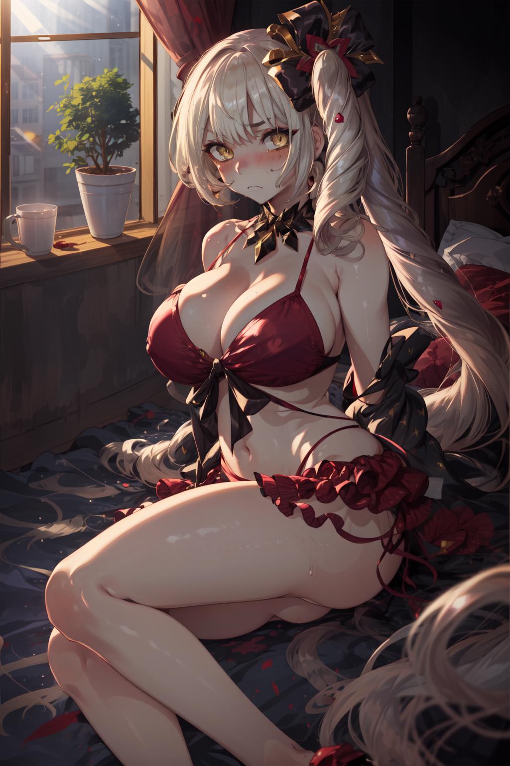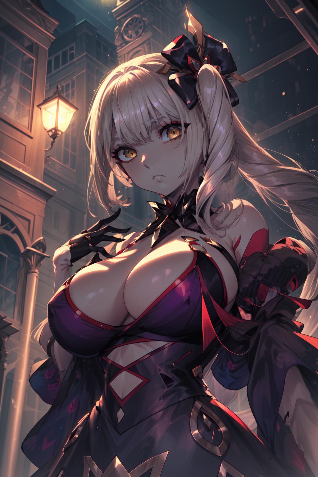a woman in a purple bra on a room background, marie antoinette (fate), 1girl, breasts, gloves, half gloves, dress, cleavage, side ponytail, yellow eyes, dark persona, long hair, black gloves, looking at viewer, pale skin, solo, large breasts, bare shoulders, hair ornament, indoors,