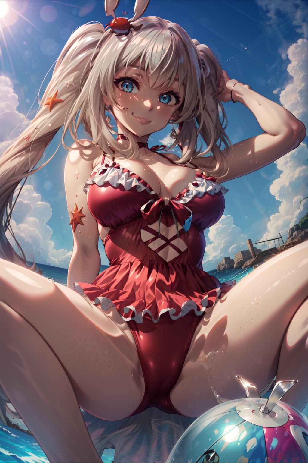 the anime drawing of a very well-endowed woman in a swimsuit, 1girl, marie antoinette (fate), swimsuit, solo, long hair, ball, twintails, breasts, blue eyes, smile, ass, red one-piece swimsuit, one-piece swimsuit, beachball, looking at viewer, crab, beach background
