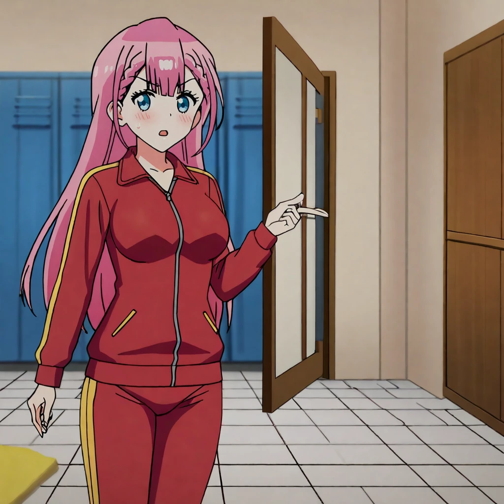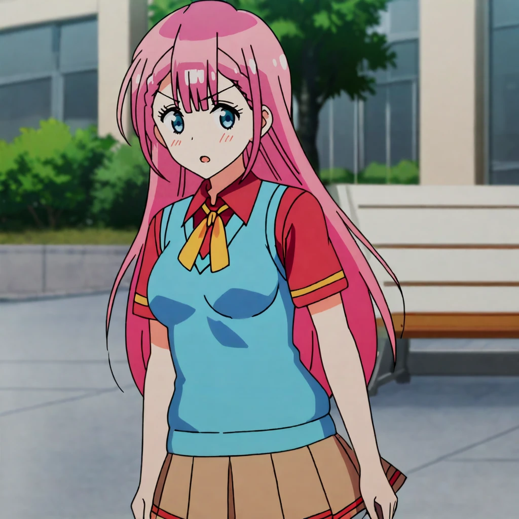 Trigger with school outfit: KirisuSchoolOutfit, 1girl, pink hair, long hair, skirt, school uniform, sweater vest, cowboy shot