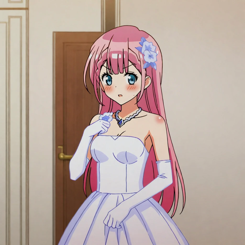 Trigger with wedding outfit: KirisuWedding, 1girl, wedding dress, pink hair, long hair, elbow gloves, hair ornament, necklace, blue eyes, jewelry, white dress, hair flower, medium breasts, bare shoulders