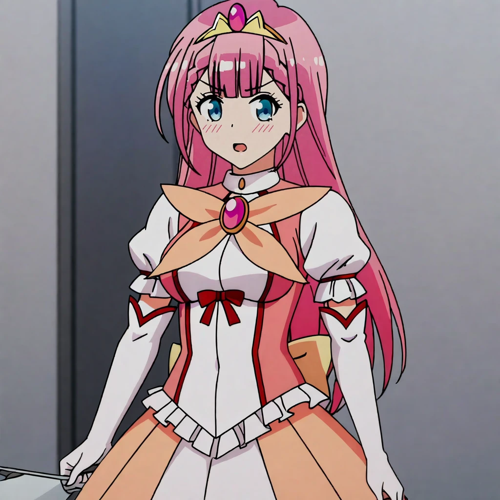 Trigger with magical girl outfit: KirisuMagicalGirl, pink hair, 1girl, elbow gloves, blue eyes, long hair, tiara, skirt, braid, magical girl, dress
