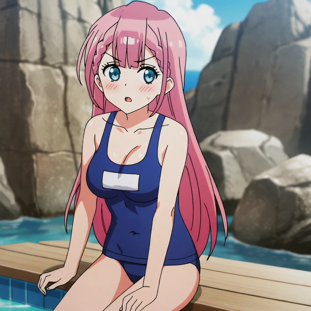 Trigger with swimsuit: KirisuSwimsuit, 1girl, school swimsuit, pink hair, long hair, medium breasts, blue one-piece swimsuit, cleavage, blue eyes, bangs, collarbone, braid