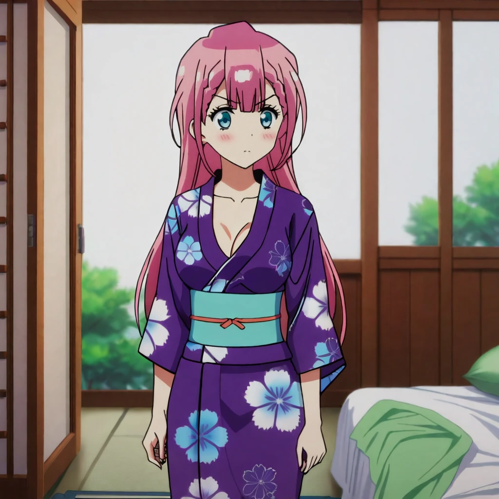 Trigger with kimino: KirisuKimino, 1girl, japanese clothes, medium breasts, purple kimono, long hair, cleavage, pink hair, yukata, sash, floral print, blue eyes, obi, collarbone, cowboy shot