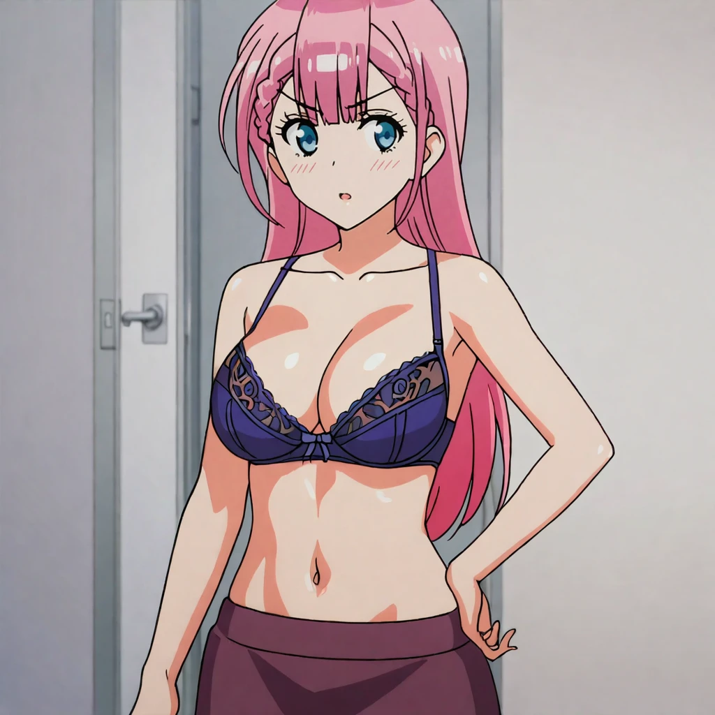 Trigger with bra: KirisuBra, 1 girl, solo, pink hair, underwear, purple bra, long hair, navel, skirt, large breasts, cleavage, blue eyes, collarbone, shiny hair, braid, cowboy shot